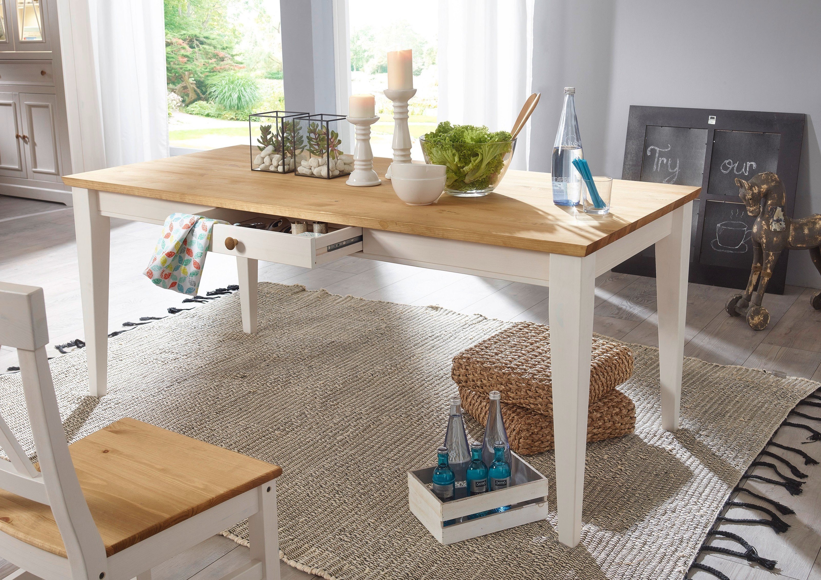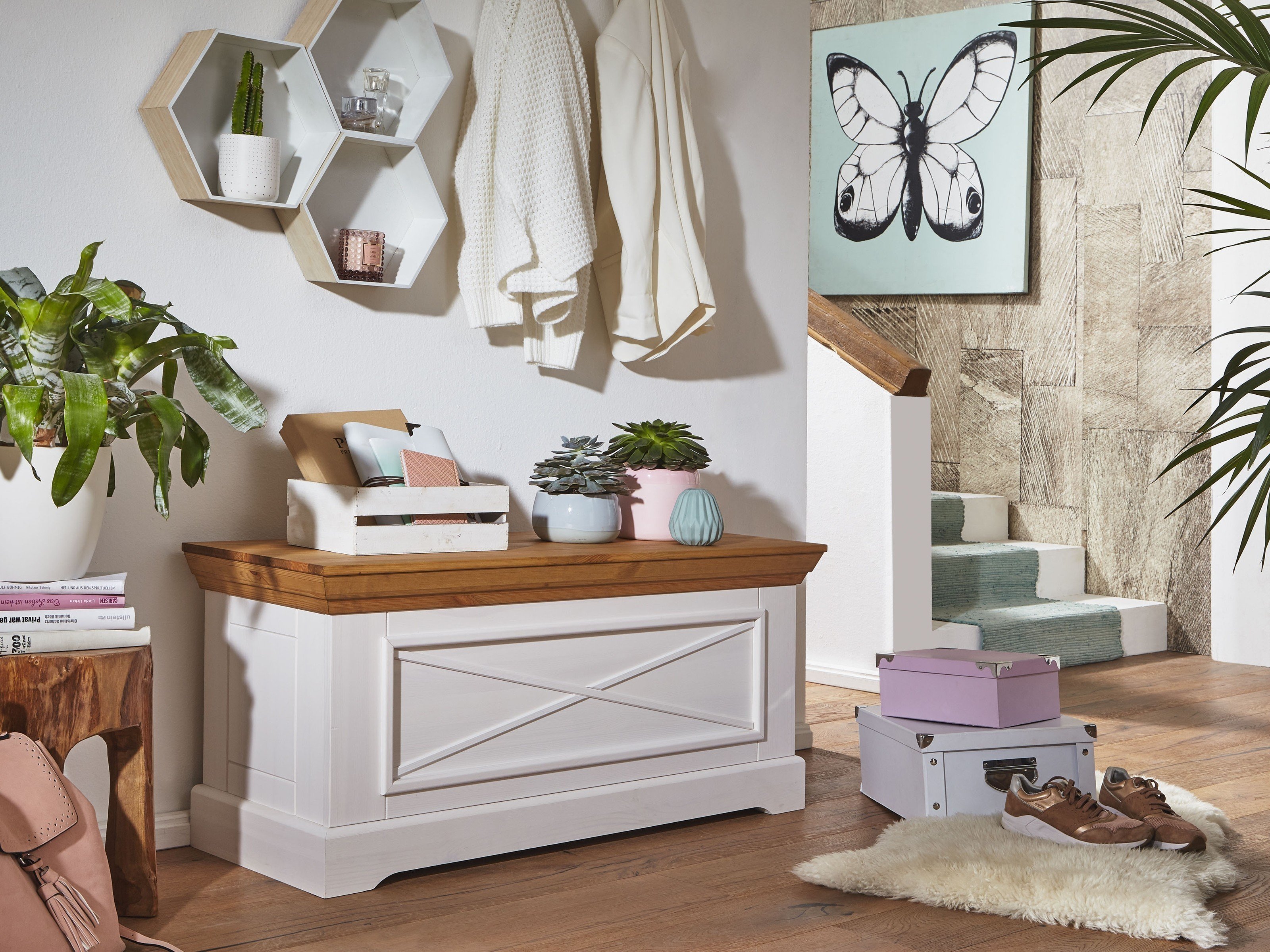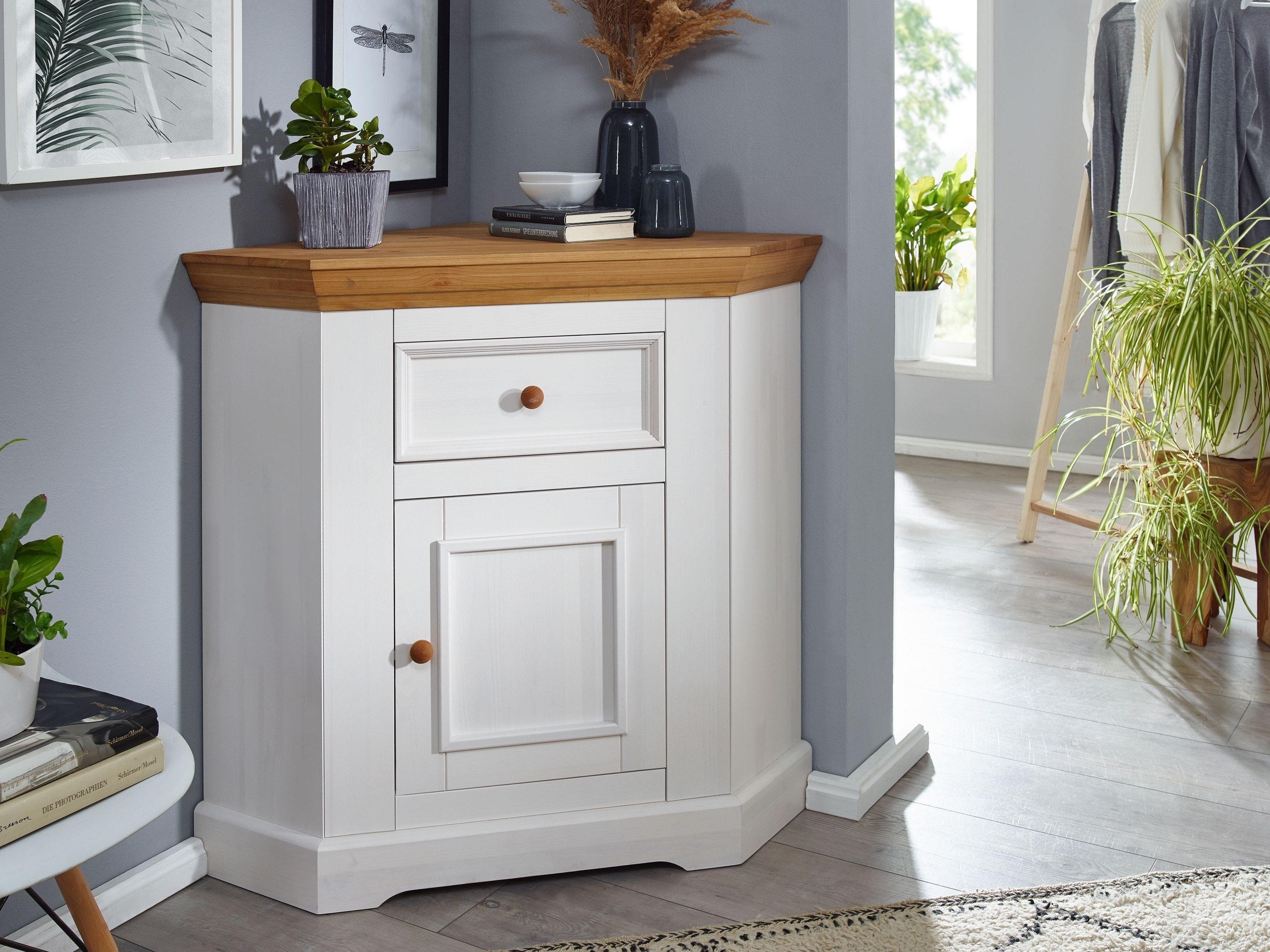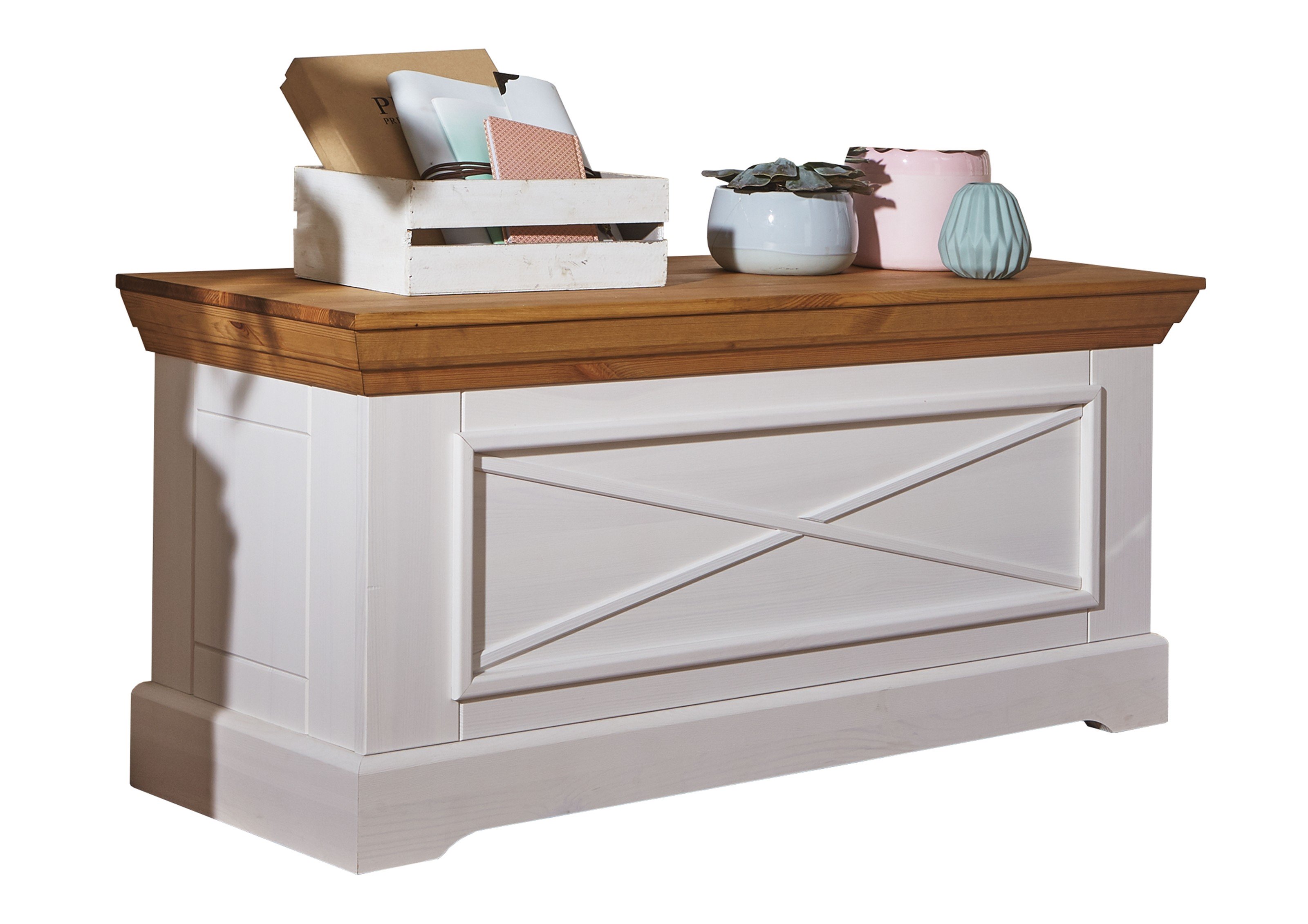 Die grau gewachste Kiefer mit eichefarbiger Deckelplatte sorgt für zeitloses Landhausflair in Ihrem Wohnbereich.