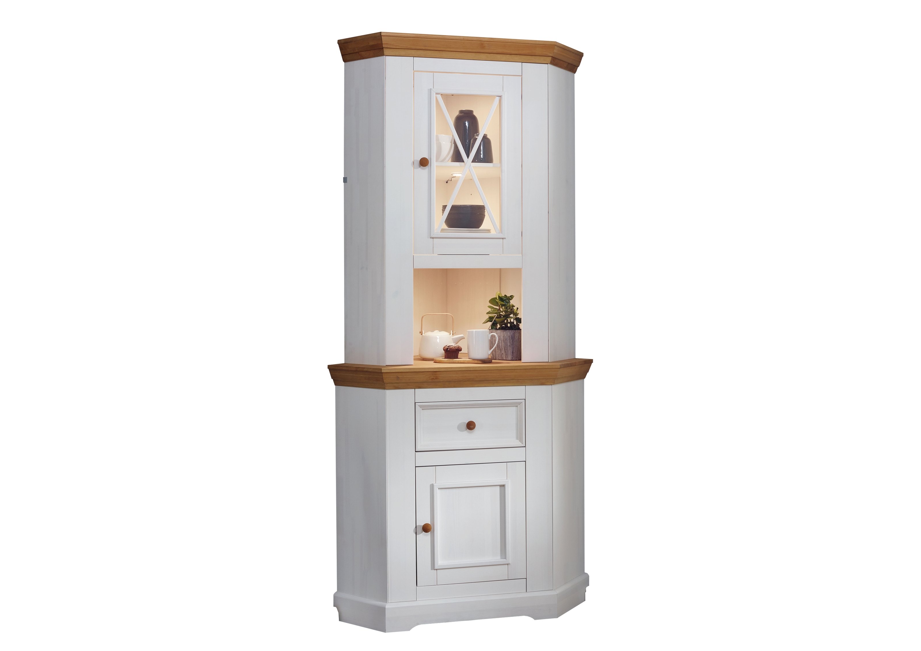Gefertigt aus Kiefer in der Grundfarbe Grau mit eichefarbigen Absetzungen und passend farbigen Türen, Klappen sowie Korpus fügt sich das Highboard harmonisch in moderne wie klassische Einrichtungen ein. Optional erhältliche LED-Beleuchtung kann zusätzlich für stimmungsvolle Akzente sorgen und Ihre Dekoobjekte gekonnt in Szene setzen.