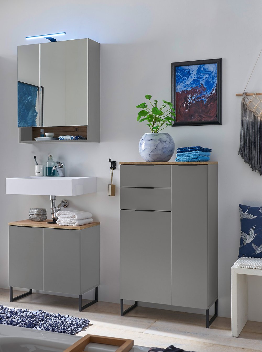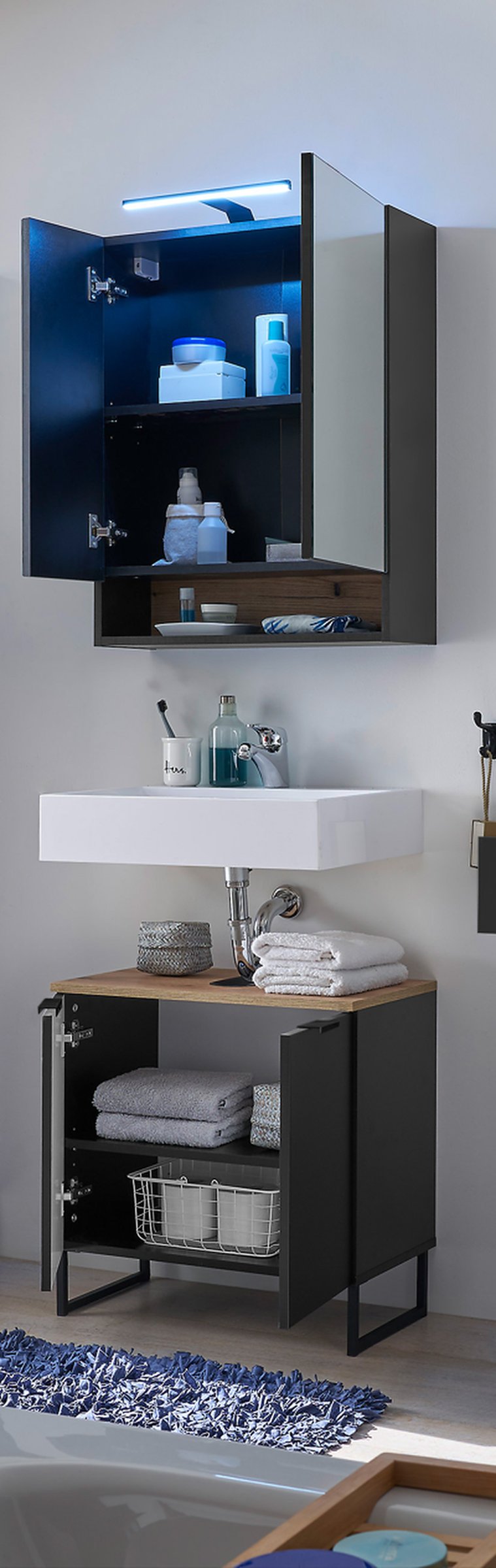 Die Kombination aus schwarz matt und Evoke Eiche Dekor fügt sich harmonisch in moderne Wohn- und Badkonzepte ein.