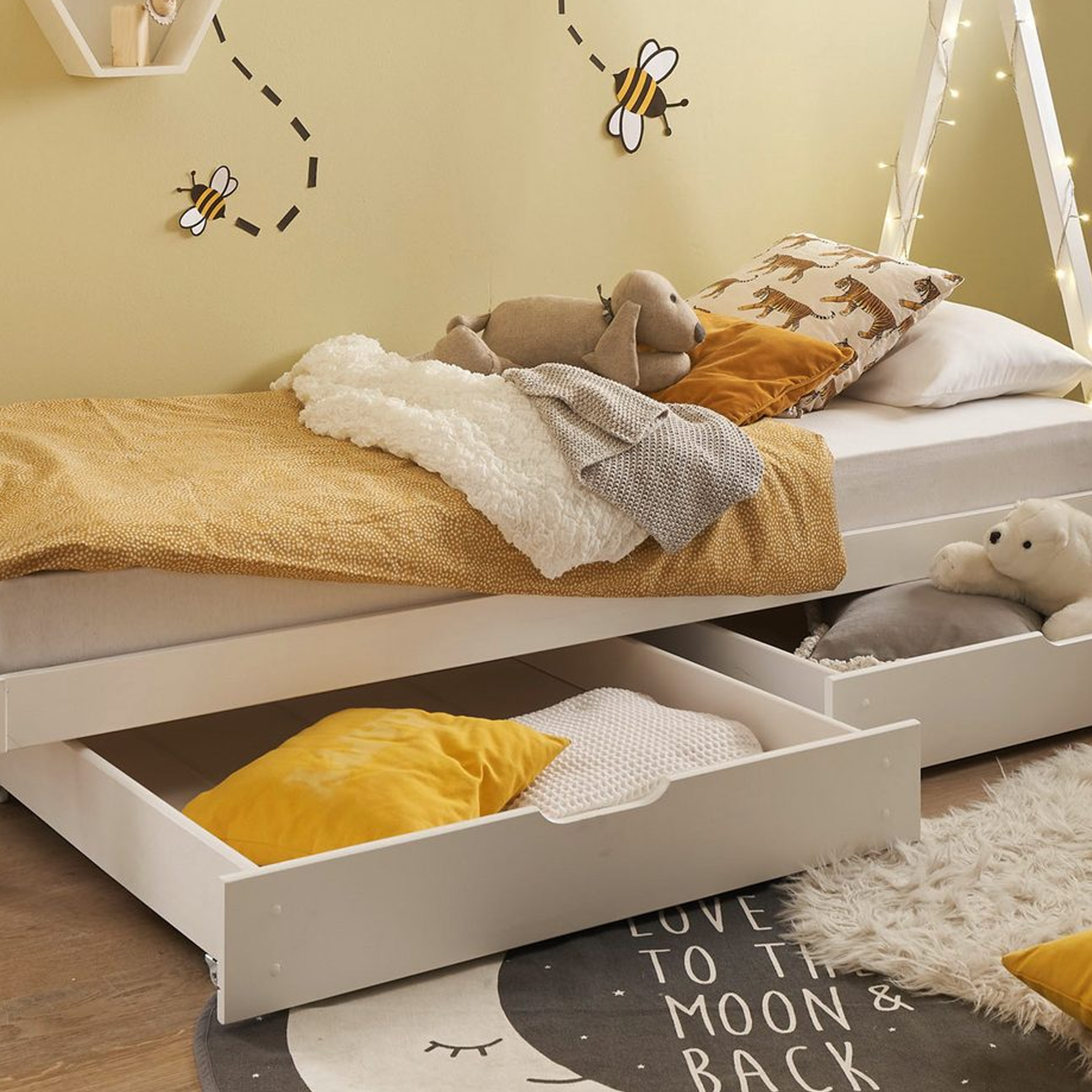 Zwei großzügige Schubkästen unter dem Bett nutzen den Platz optimal für Spielzeug und Bettwäsche.