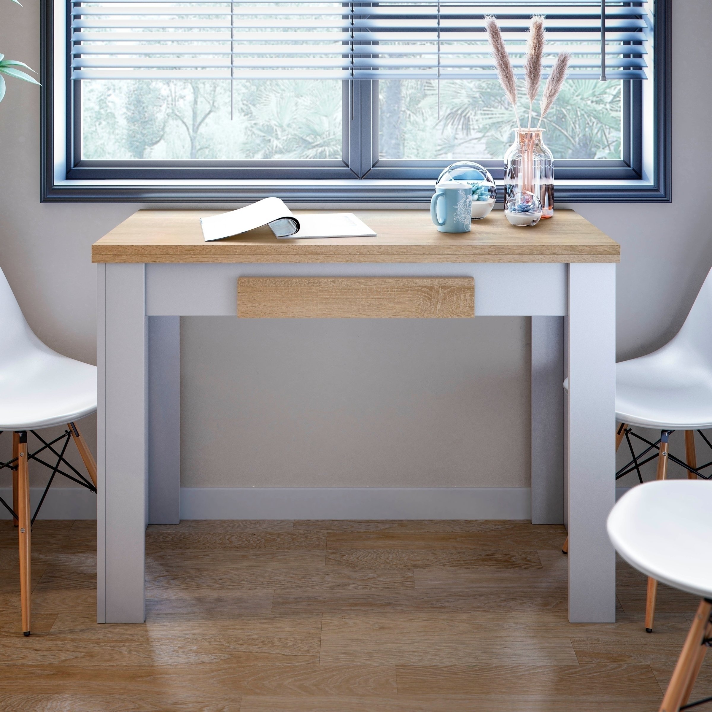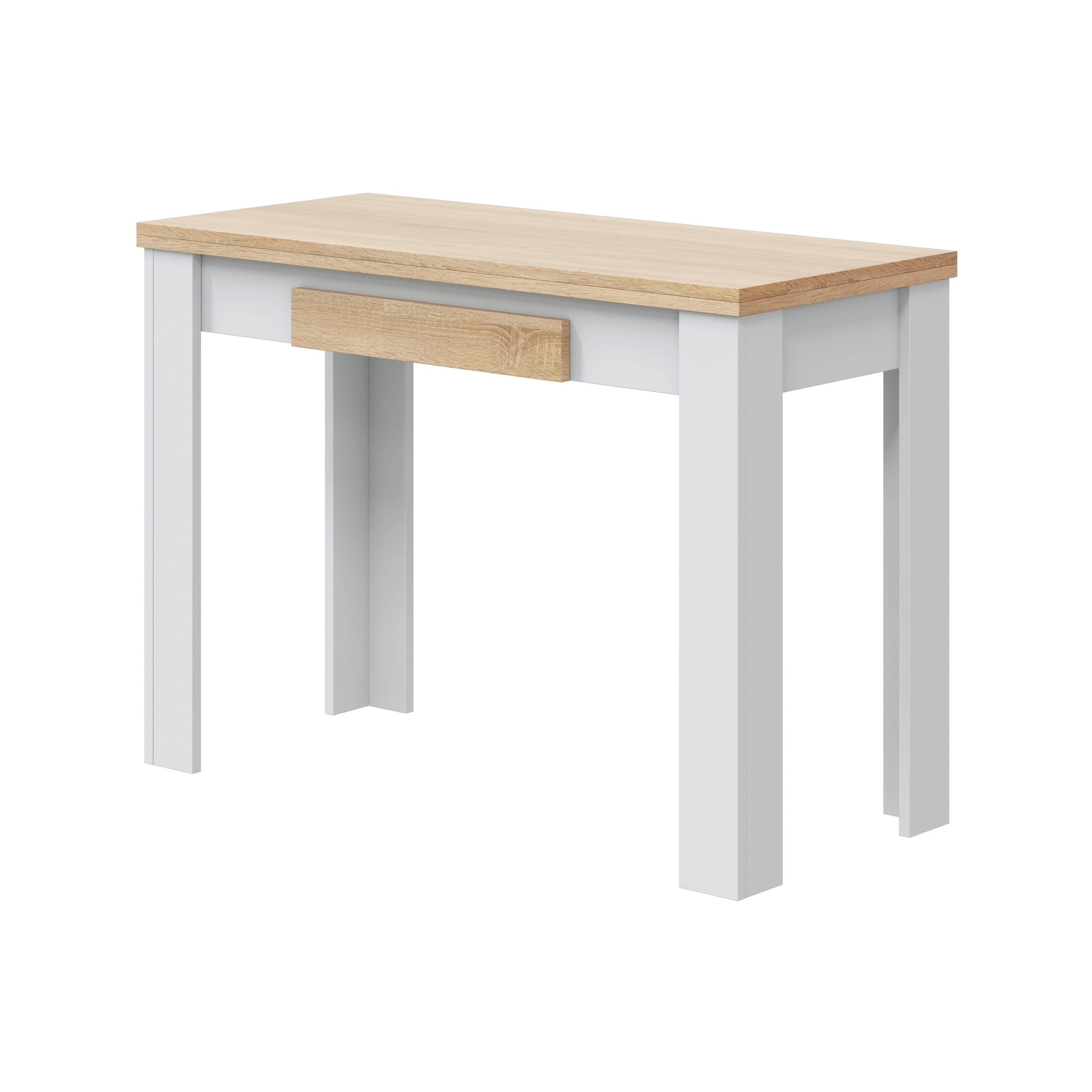 Optisch überzeugt der Tisch mit einer gelungenen Kombination aus Artik Weiß und Canadian Eiche Dekor. Diese zeitgemäße Farbmischung fügt sich harmonisch in unterschiedlichste Wohnkonzepte ein und sorgt für eine freundliche Atmosphäre in Küche, Wohnbereich oder Homeoffice. Die Front der integrierten Schublade greift das Dekor in Canadian Eiche auf und setzt einen stimmigen Akzent.