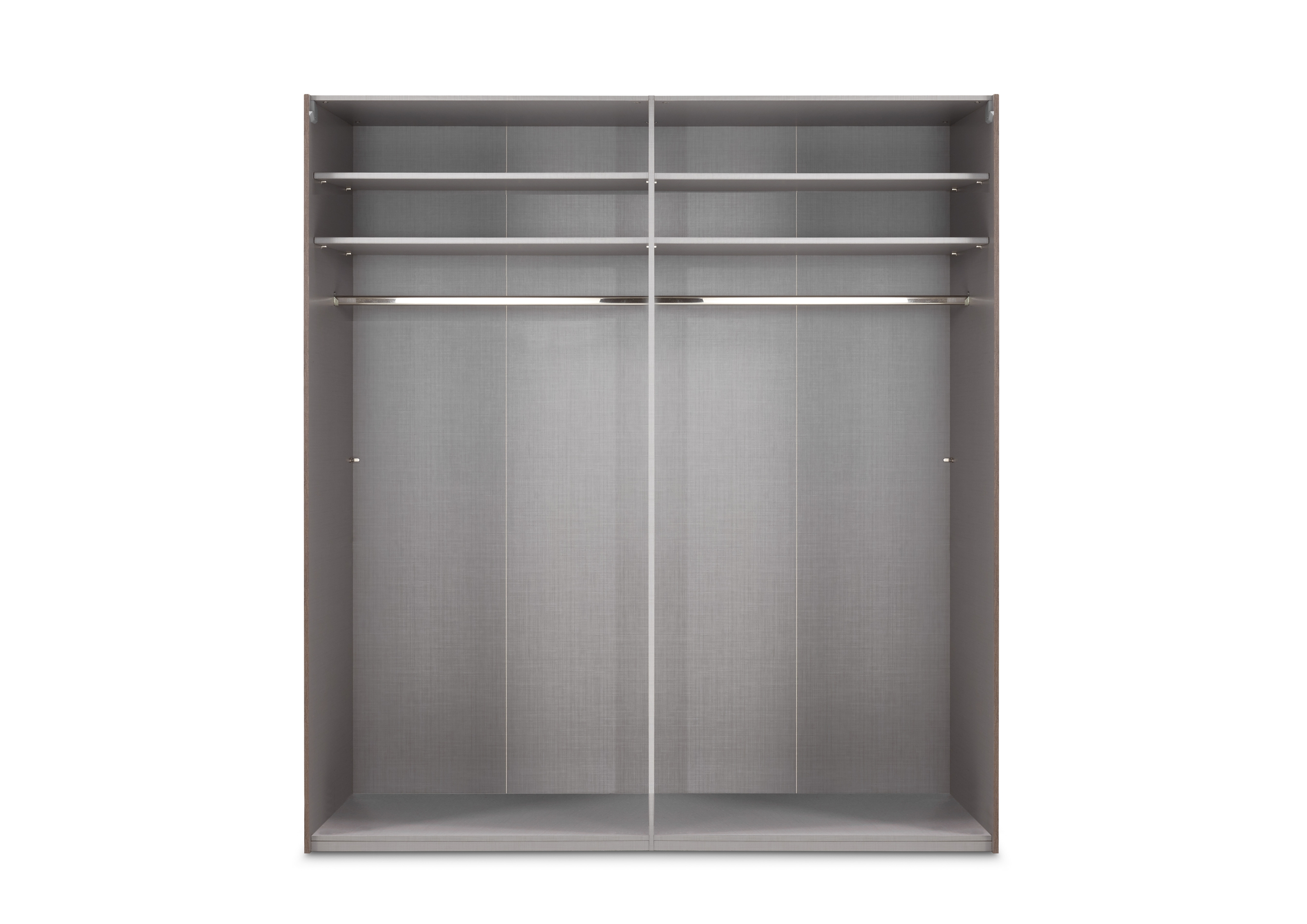 Die Frontgestaltung wird durch stylische Applikationen aus Glas in Weiß aufgewertet, die dem Schrank eine elegante Note verleihen, ohne aufdringlich zu wirken. Zwei große Schwebetüren ermöglichen einen komfortablen Zugriff auf das Innere, auch wenn vor dem Schrank nur begrenzt Platz zur Verfügung steht. Hinter den Türen sorgen vier Einlegeböden für Ordnung und Struktur, sodass Sie Ihre Garderobe übersichtlich einräumen können.