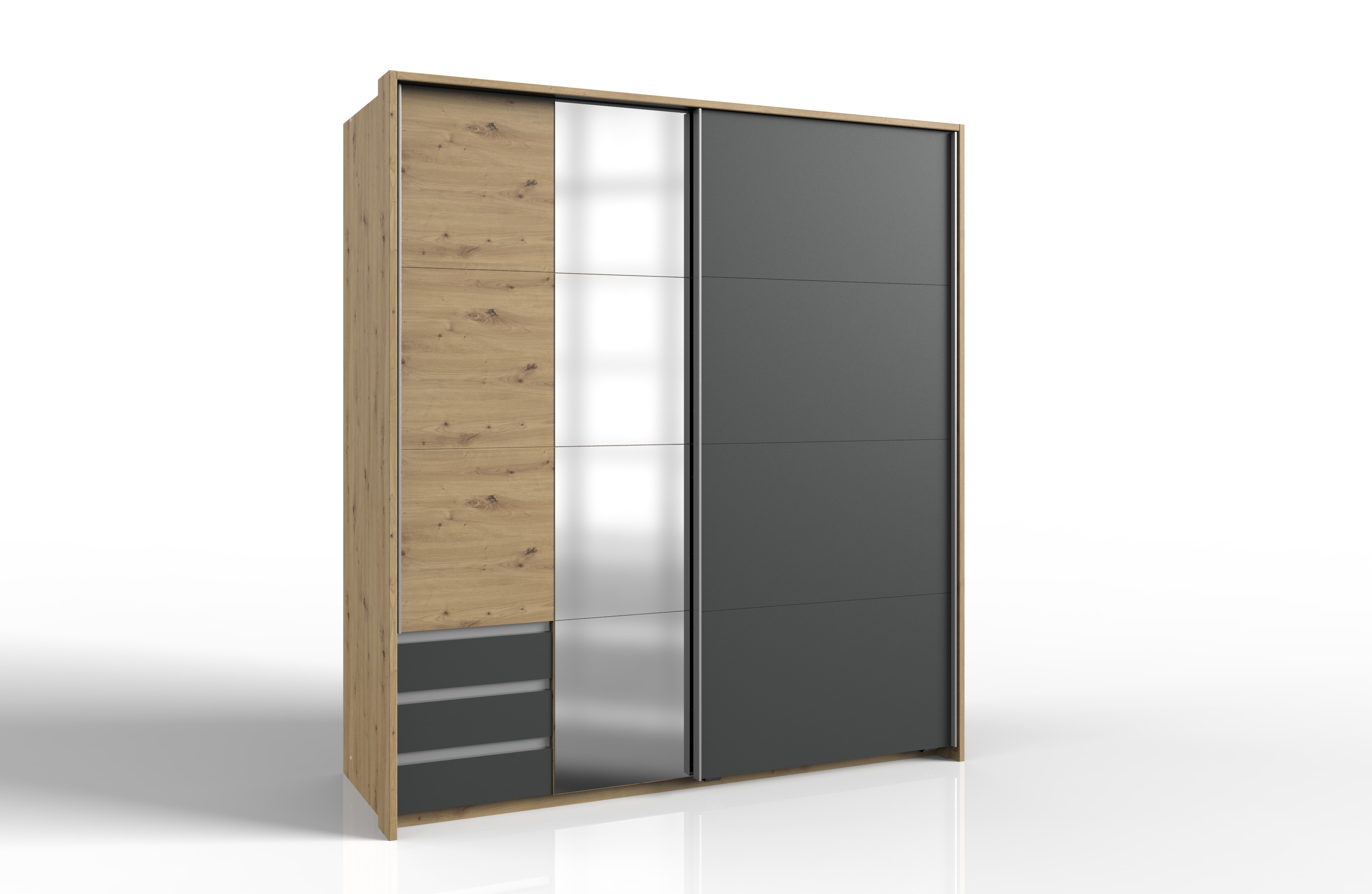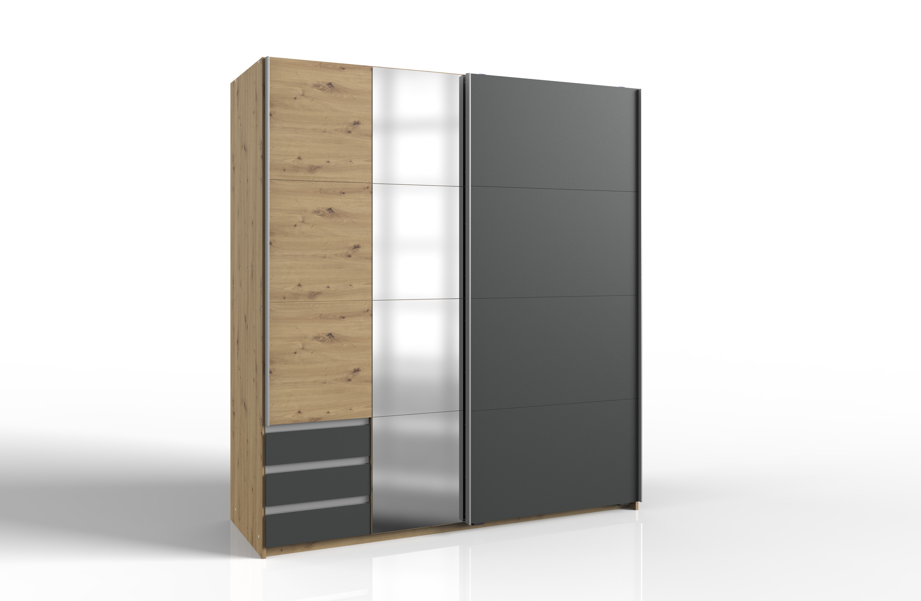 Die Front in Artisan-Eiche-Nachbildung mit graphitfarbenen Absetzungen fügt sich harmonisch in moderne Einrichtungsstile ein und lässt sich vielseitig mit vorhandenen Möbeln kombinieren. Die Schwebetüren sorgen für komfortables Öffnen auch in kleineren Räumen, ohne zusätzlichen Platzbedarf.