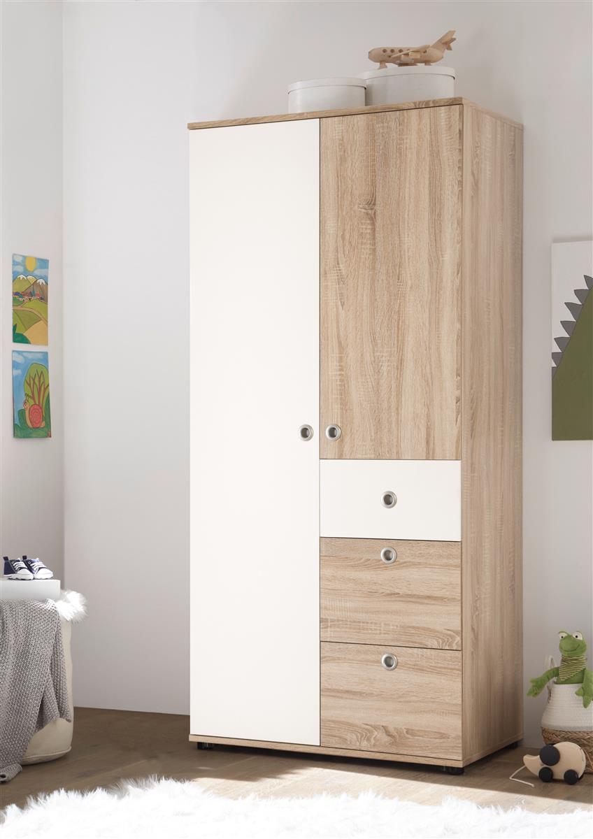 Hinter den 2 Türen verbergen sich 2 Kleiderstangen und 3 höhenverstellbare Einlegeböden, sodass Jäckchen, Shirts, Hosen und Schuhe übersichtlich und griffbereit sortiert werden können. In den 3 Schubkästen finden Socken, Strumpfhosen und Unterwäsche ihren festen Platz – ideal für den strukturierten Familienalltag.