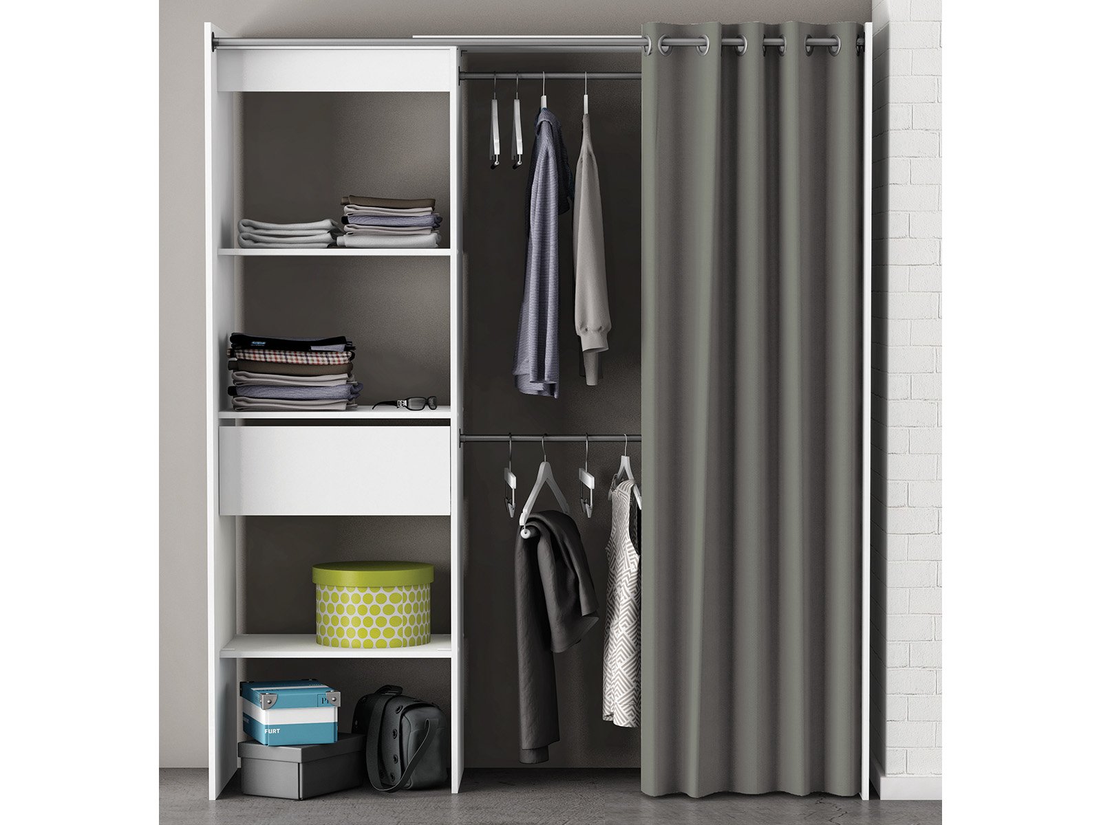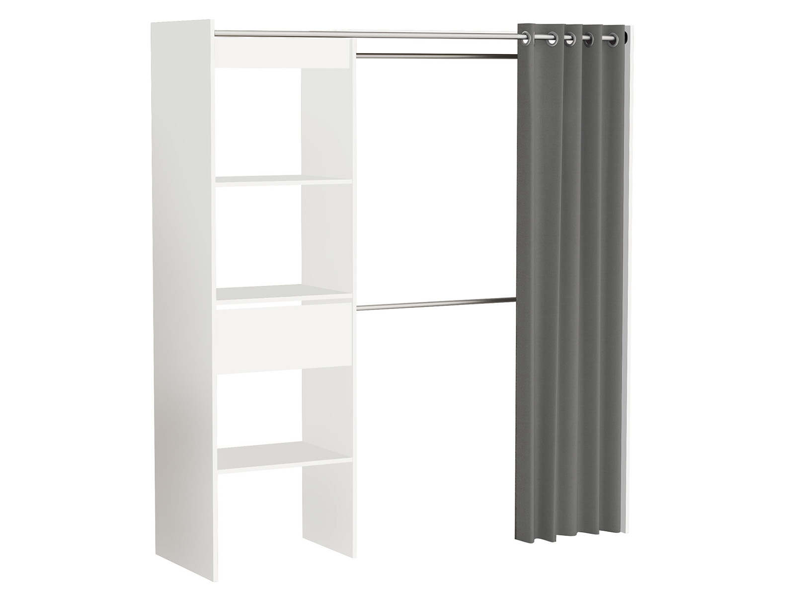 [cKurzBeschreibung] => Mobiler Kleiderschrank aus Spanplatte in Weiß, Vorhang aus 100% Polyester in Grau mit 3 Konstruktionsböden, 2 Einlegeböden, 1 Kleiderstange und 4 Rollen. Breite 100 cm, Höhe 145 cm, Tiefe 50 cm