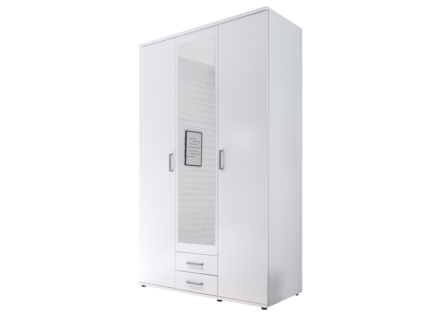 [metaDescription] => Moderner Kleiderschrank aus Spanplatte in Weiß mit 2 Holztüren, 1 Spiegeltür, 2 Schubkästen, 1 Konstruktionsboden, 3 Einlegeböden und 1 Kleiderstange Breite