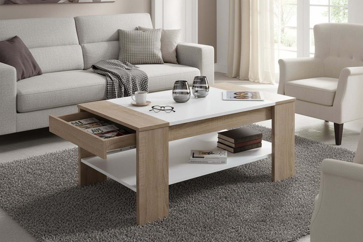 [metaDescription] => Moderner Couchtisch aus Spanplatte in Sonoma-Eiche Nachbildung erhältlich mit 1 Ablageboden und 1 Schubkasten Breite 100 cm, Höhe 44 cm, Tiefe 58 cm