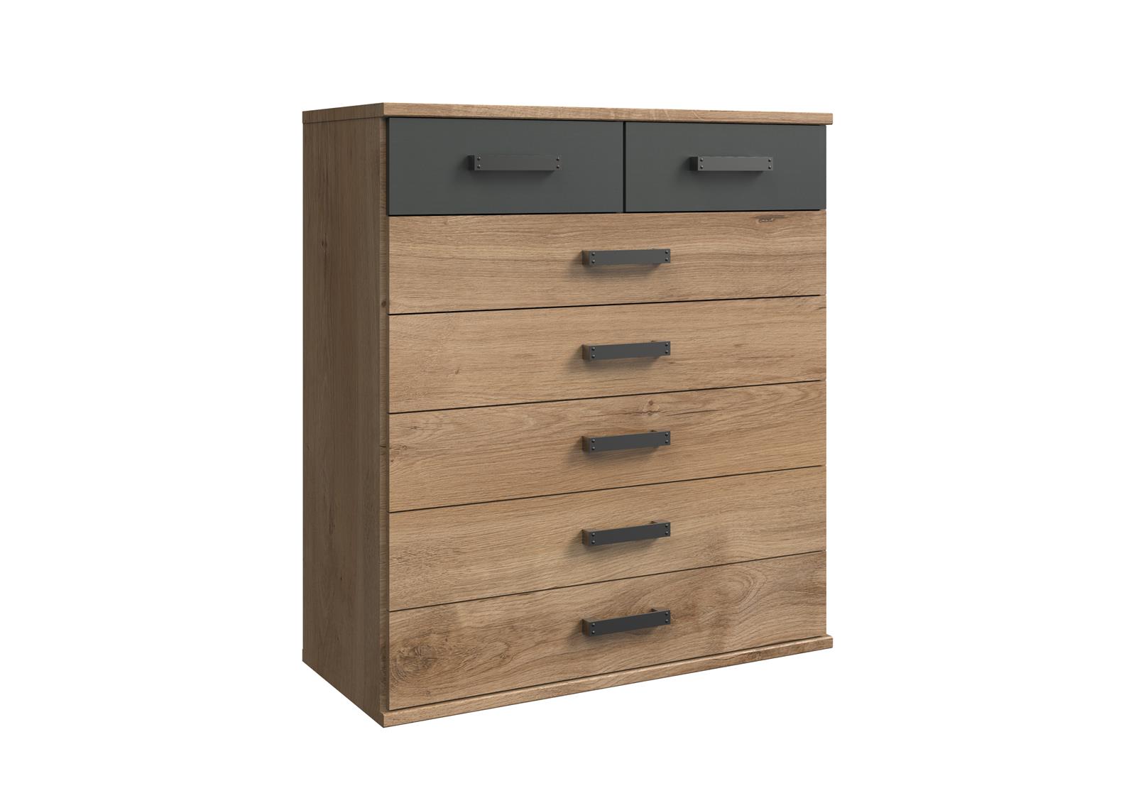 Die Front besteht aus 2 Holztüren und 1 Spiegeltür, die das äußere Erscheinungsbild dezent auflockert und zugleich bei der täglichen Outfitwahl unterstützt. Zusätzlich stehen 2 Schubkästen zur Verfügung, in denen sich kleinere Textilien wie Socken oder Unterwäsche ordentlich verstauen lassen. Die Aufteilung der Elemente mit Einlegeböden und Kleiderstange ermöglicht eine gut strukturierte Organisation verschiedenster Kleidungsstücke.
