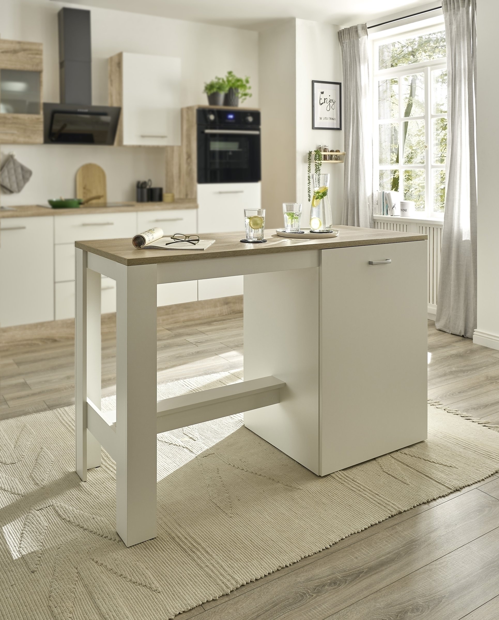 Die Kücheninsel ANDY verbindet natürliche Eleganz mit praktischer Raffinesse und wird schnell zum funktionalen Mittelpunkt Ihrer Küche. Mit ihrem weißen, matt melaminbeschichteten Korpus und der freundlichen Arbeitsplatte in Eiche Sonoma Nachbildung schafft sie eine moderne, einladende Atmosphäre – ideal zum Vorbereiten, Anrichten und gemeinsamen Verweilen.