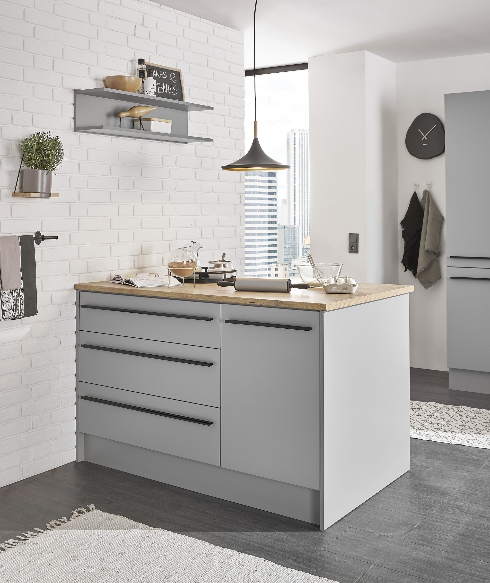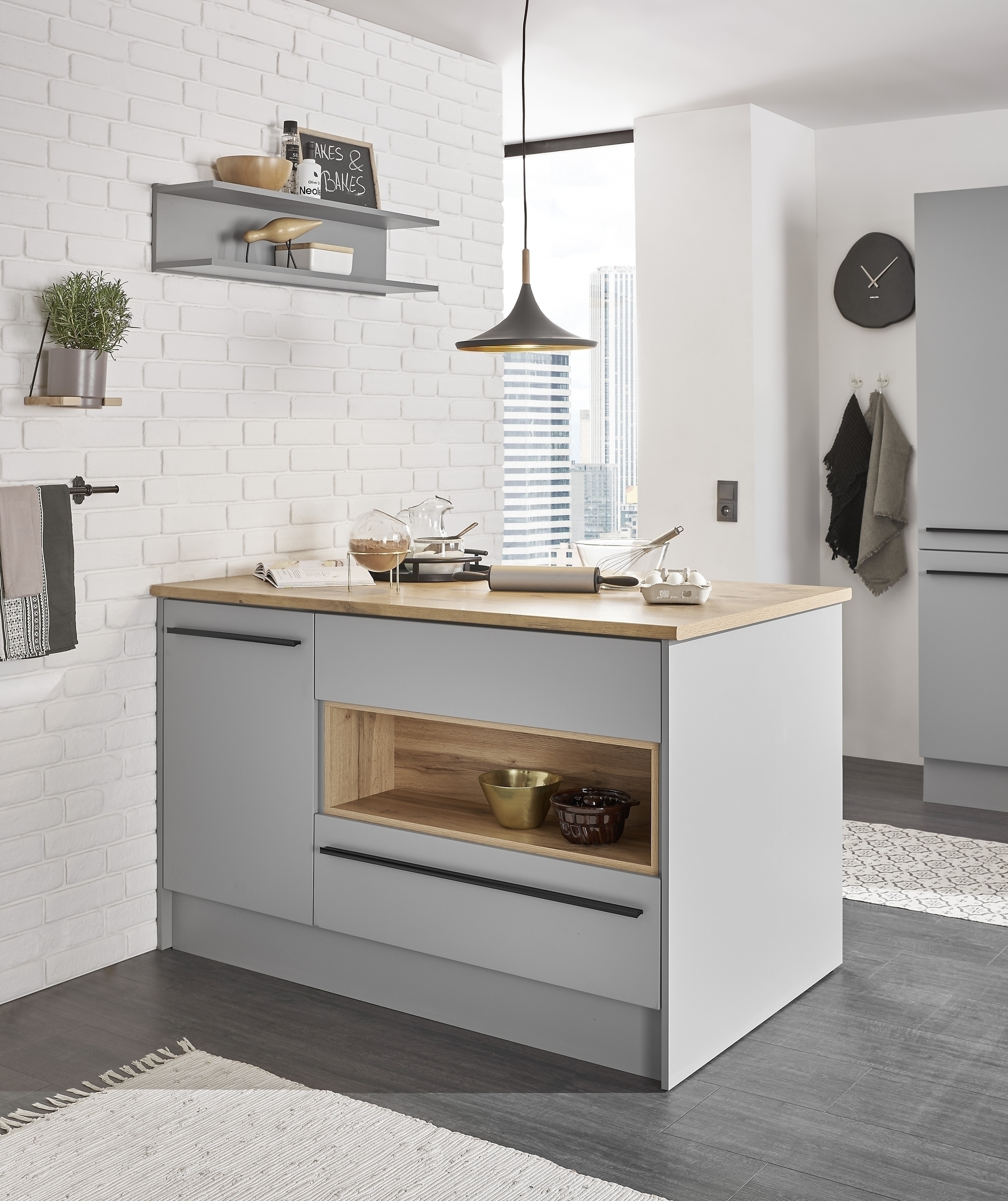Gestaltet in Grau bzw. Grau matt mit einer Arbeitsplatte in Lancelot Eiche fügt sich die Insel stimmig in aktuelle Küchentrends ein. Das offene Fach auf der Rückseite greift das Dekor der Arbeitsplatte nochmals auf und bietet Platz für Kochbücher, Deko oder Küchenaccessoires – so wird die Insel von allen Seiten zum Blickfang.