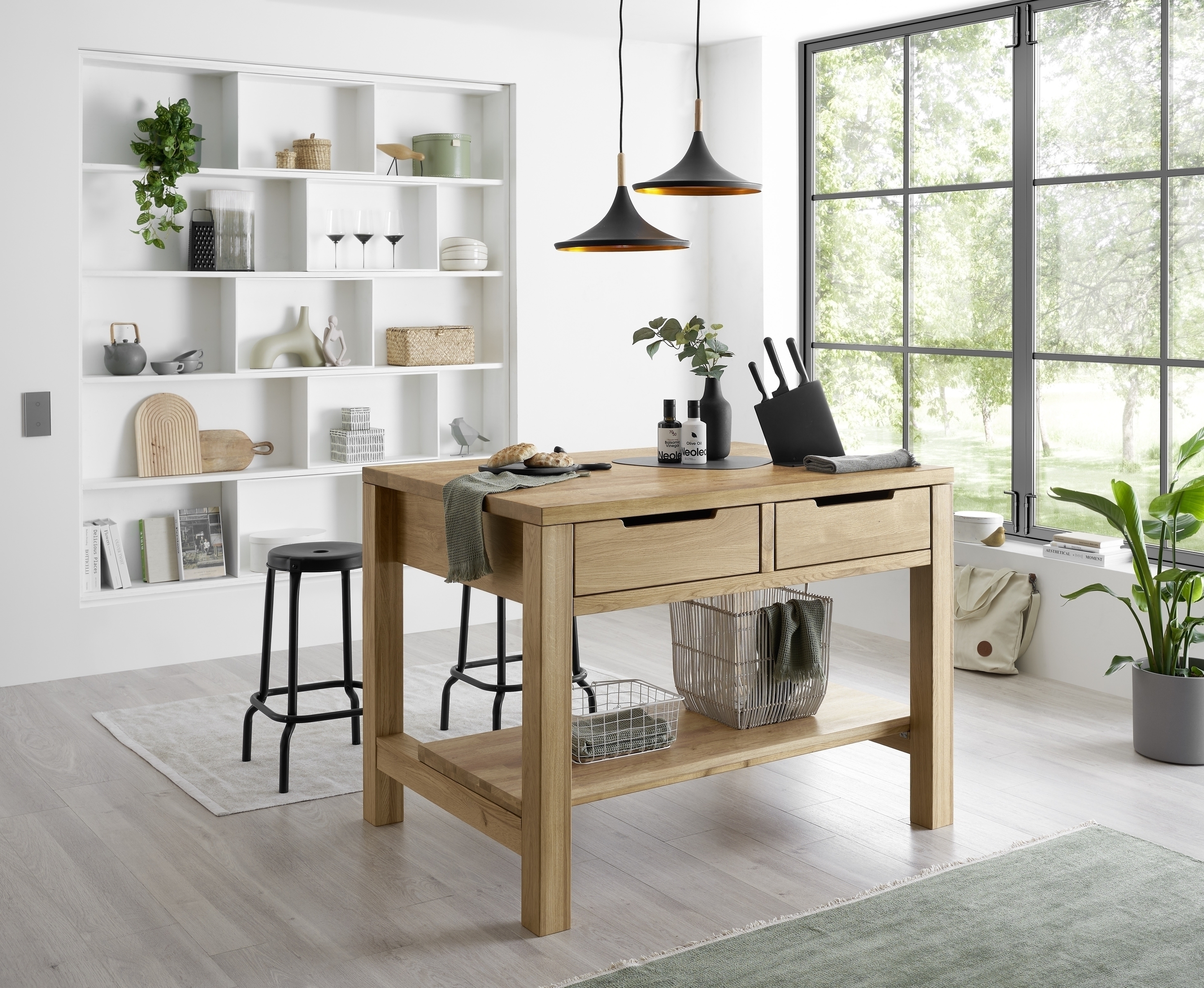 Gefertigt aus hochwertigem Massivholz und in edler Eiche geölt, überzeugt die Kochinsel durch ihre warme Optik und angenehme Haptik. Die geölte Arbeitsplatte betont die individuelle Maserung des Holzes und macht jedes Stück zu einem Unikat mit wohnlicher Ausstrahlung.