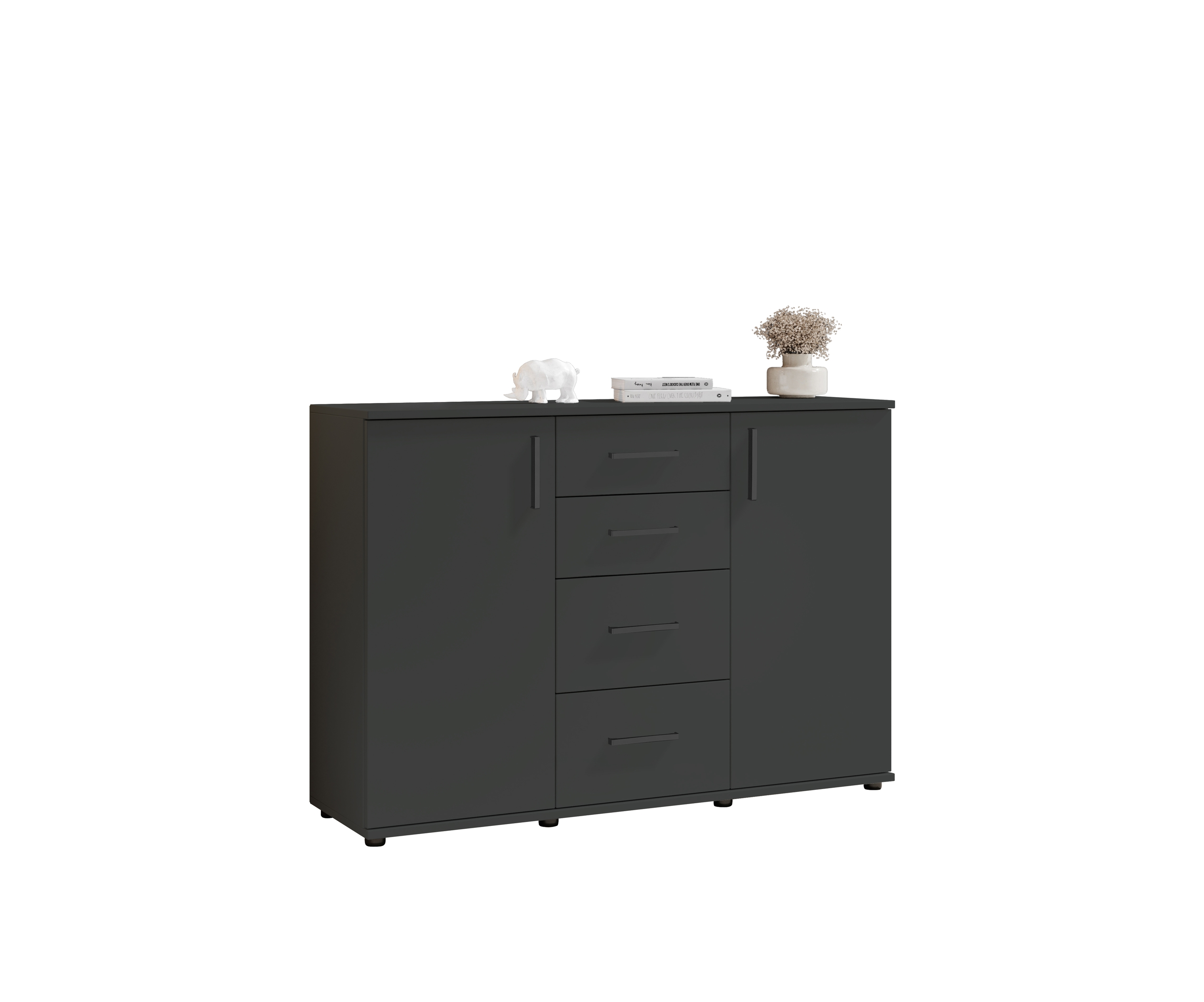 Drei Drehtüren, ein Einlegeboden und zwei Schubladen mit Kugelauszug sorgen für übersichtlichen und leicht zugänglichen Stauraum.