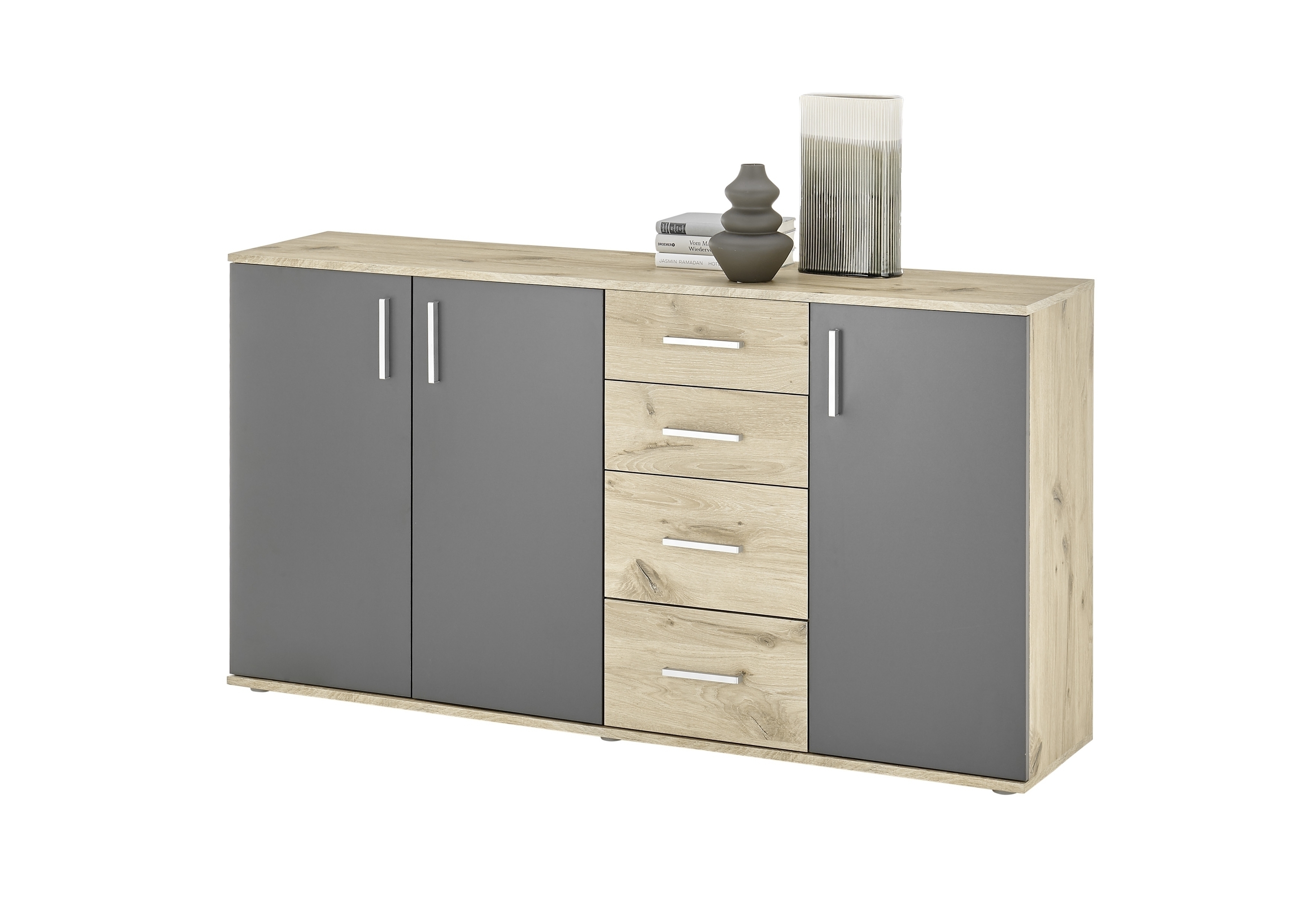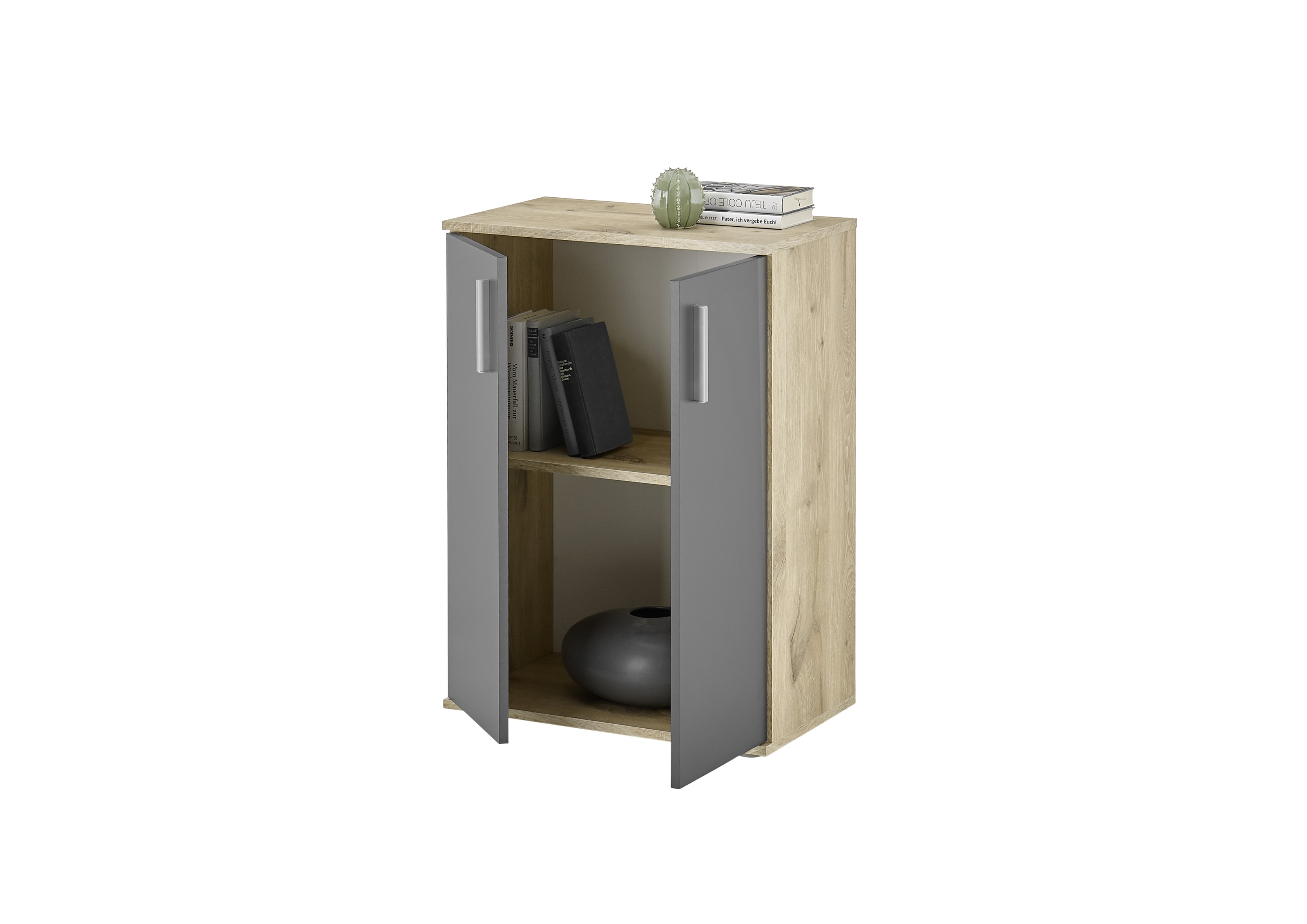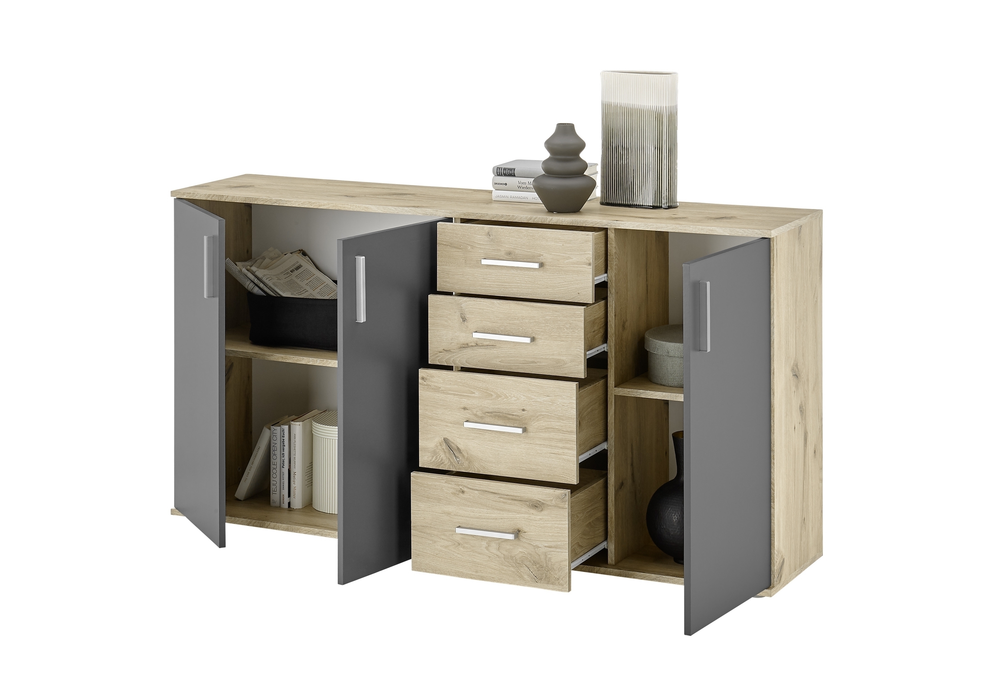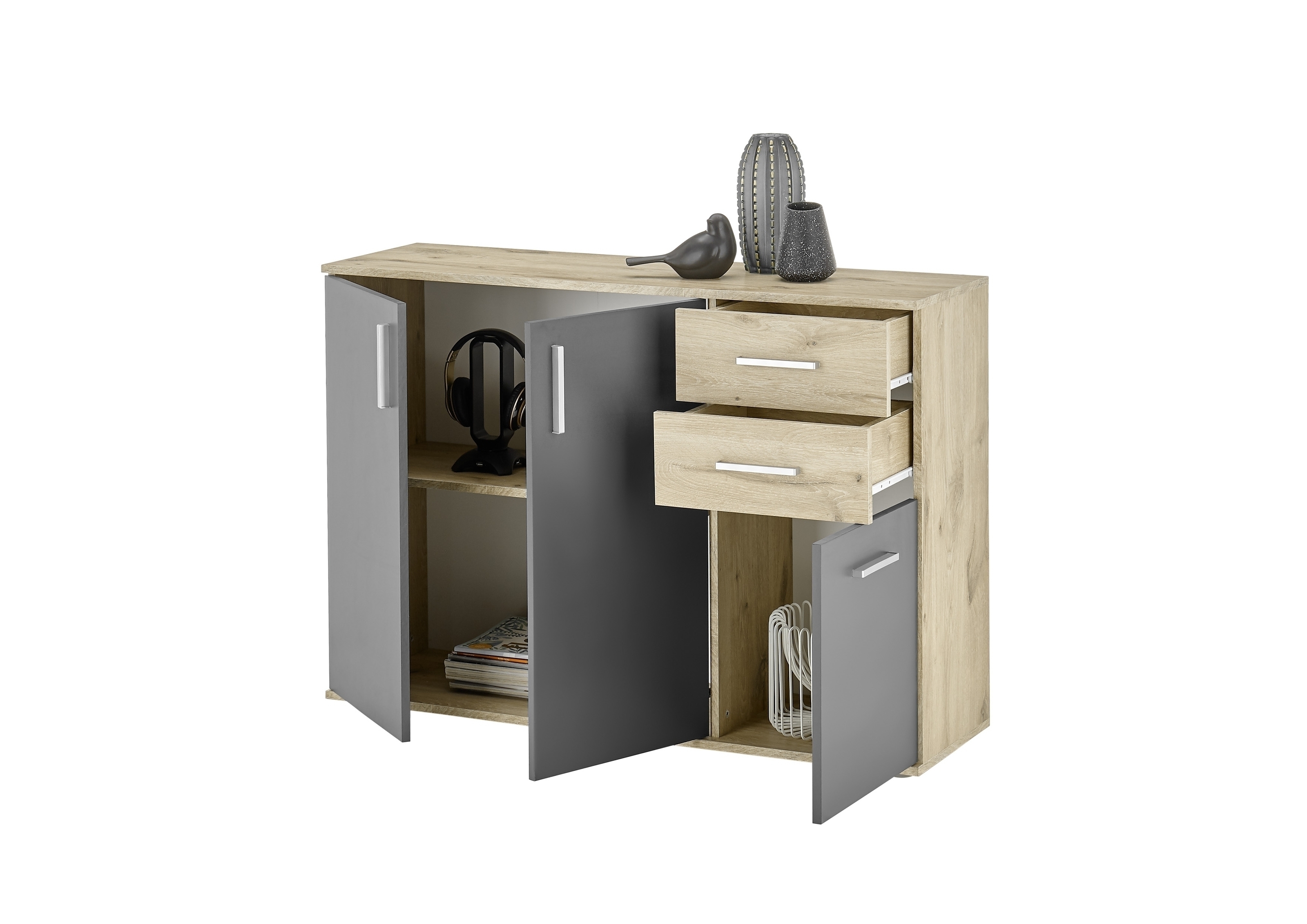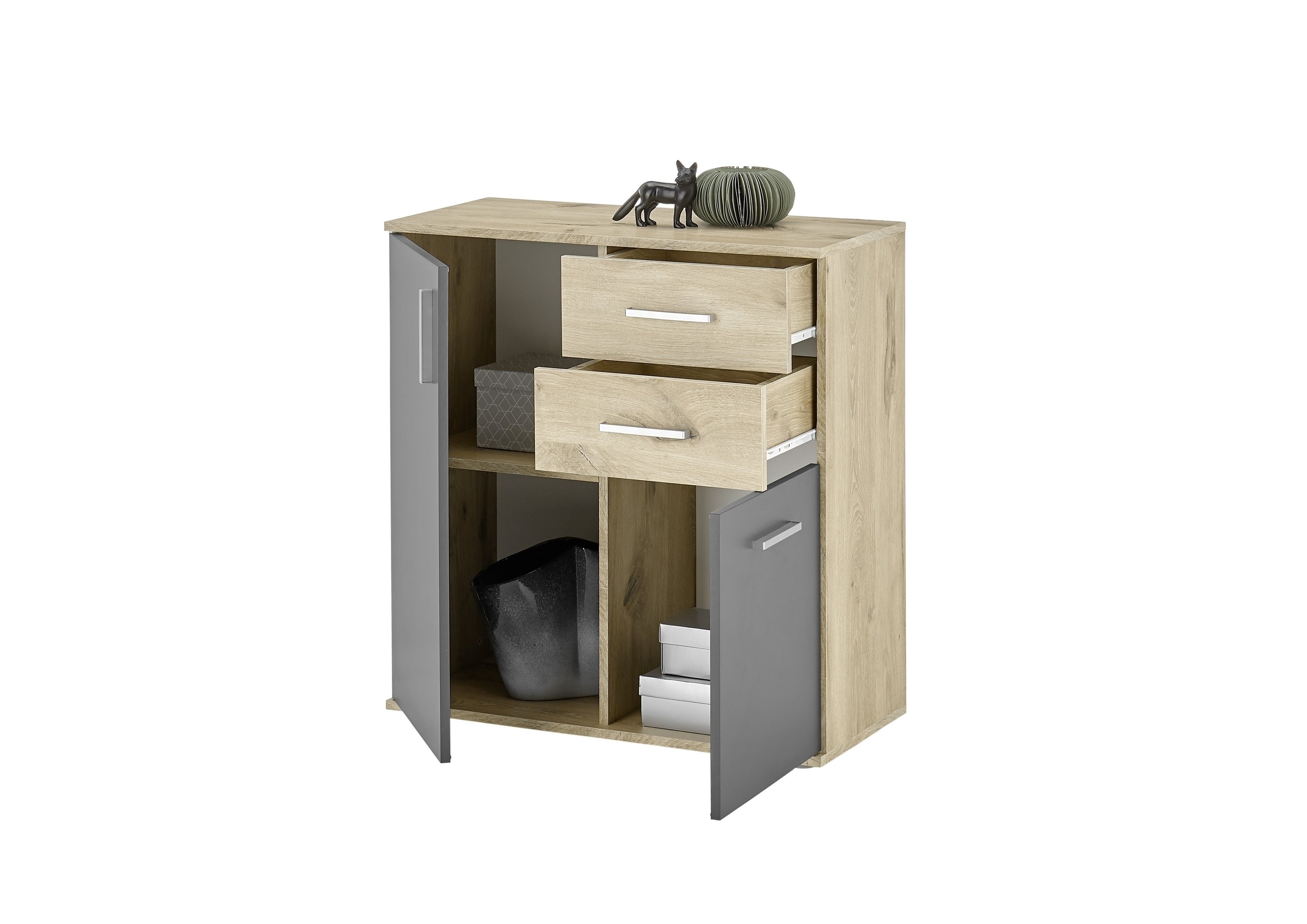 Die Innenaufteilung ist auf Alltagstauglichkeit ausgelegt: Hinter den drei Drehtüren verbirgt sich ein großzügiger Stauraum, der durch einen Einlegeboden gegliedert wird. Dieser trägt bis zu 5 kg und eignet sich damit gut für Bücher, Geschirr, Kleidung oder Aktenordner. Zwei zusätzliche Schubladen mit leichtgängigen Kugelauszügen nehmen kleinere Utensilien auf, die schnell zur Hand sein sollen.