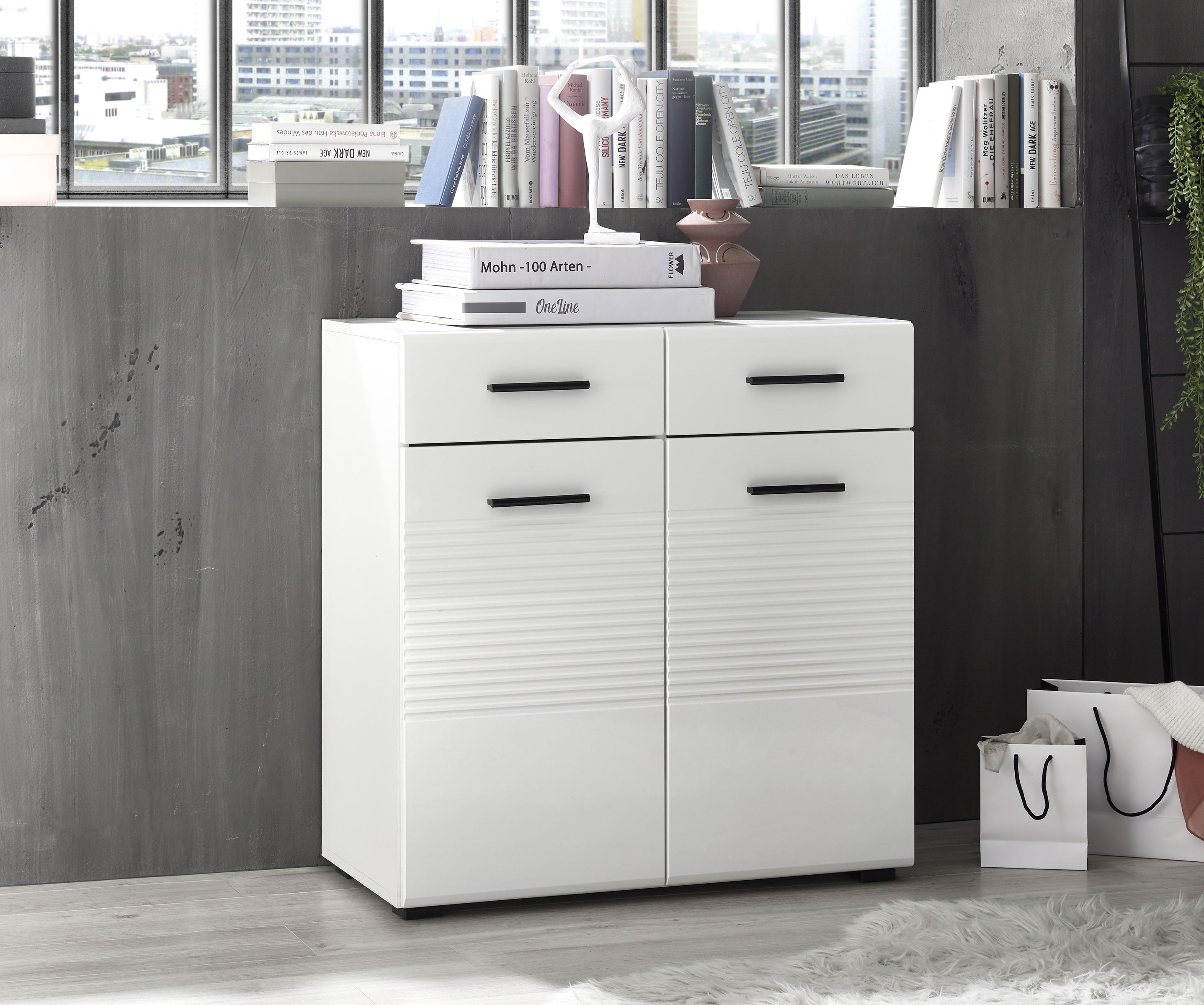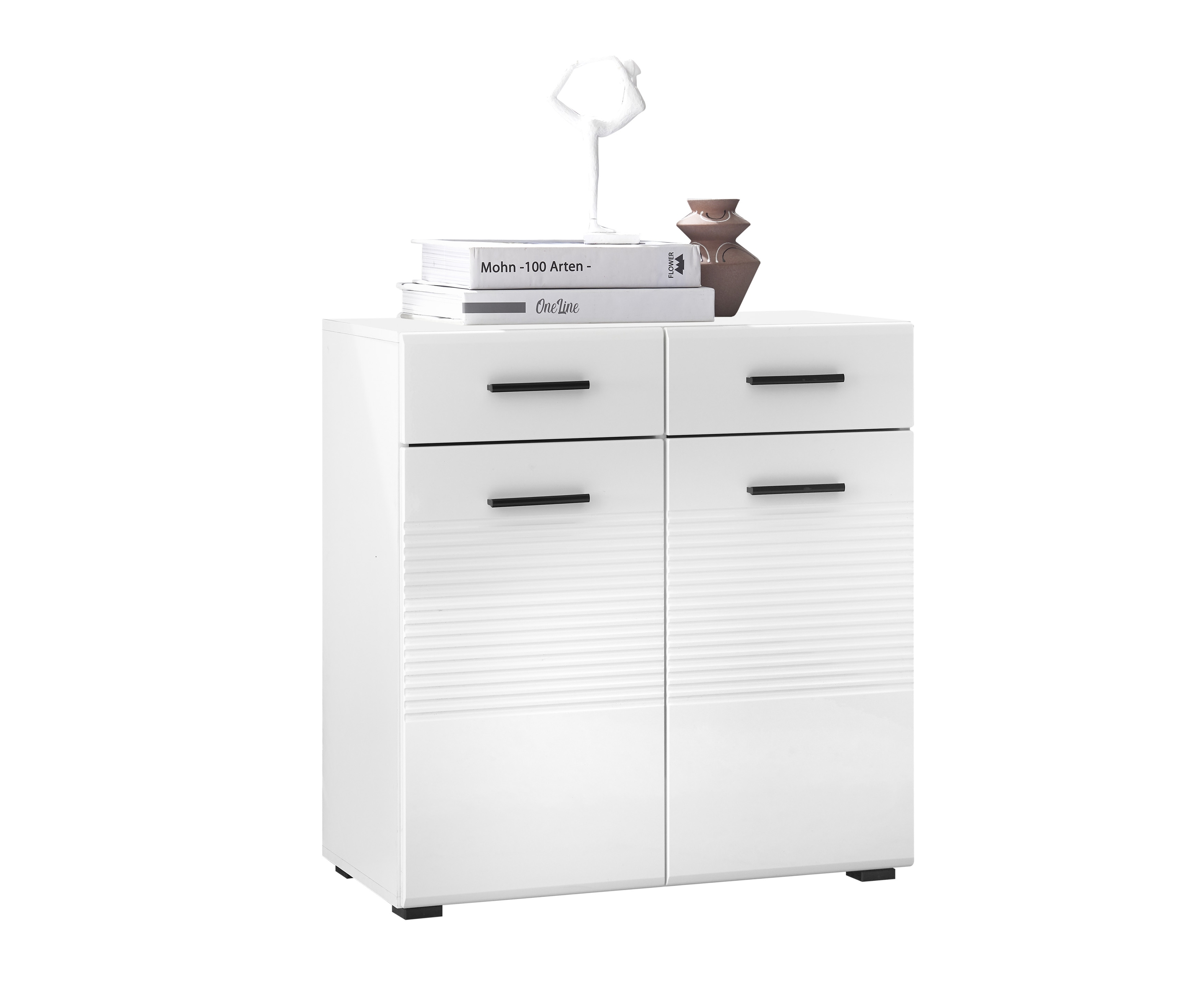 [cWert] => SCHLICHTES DESIGN - Das schlichte & geschmackvolle Design mit klaren Linien sorgt für einheitliche Eleganz und ein aufgeräumtes Ambiente in Ihrem Lebensbreich. Oben bleibt viel Platz für schöne Deko!;VIELSEITIG EINSETZBAR - Durch die schlichte Farbgestaltung lässt sich die Kommode mit vielen verschiedenen Einrichtungsstilen kombinieren und ideal im Flur, Wohn-, Ess- oder Schlafzimmer einsetzen.;VIEL STAURAUM - Die Kommode bietet Stauraum für allerlei Dinge. Die Kunststoff Griffe in Schwarz runden die Kommode ab und sorgen für wohnliche Atmosphäre.;LEICHTE MONTAGE - Die Holz-Kommode ist dank der detaillierten Anleitung schnell & leicht montiert und somit für Anfänger geeignet. Das Montage-Material ist inklusive.;PRODUKTDATEN - Kommode in weiß hochglanz mit Rillenoptik. Schrank mit Front in MDF weiß hochglanz tiefzieh, Korpus in weiß matt Melaminbeschichtet. Griffe und Füße in Kunsstoff schwarz. Mit 2 Türen, 2 Schubkästen je bis 3 kg belastbar, 2 Einlegeböden bis zu je 5 kg belastbar. Oberboden bis max. 10 kg belastbar. Stellmaß BxHxT 80x83x40 cm