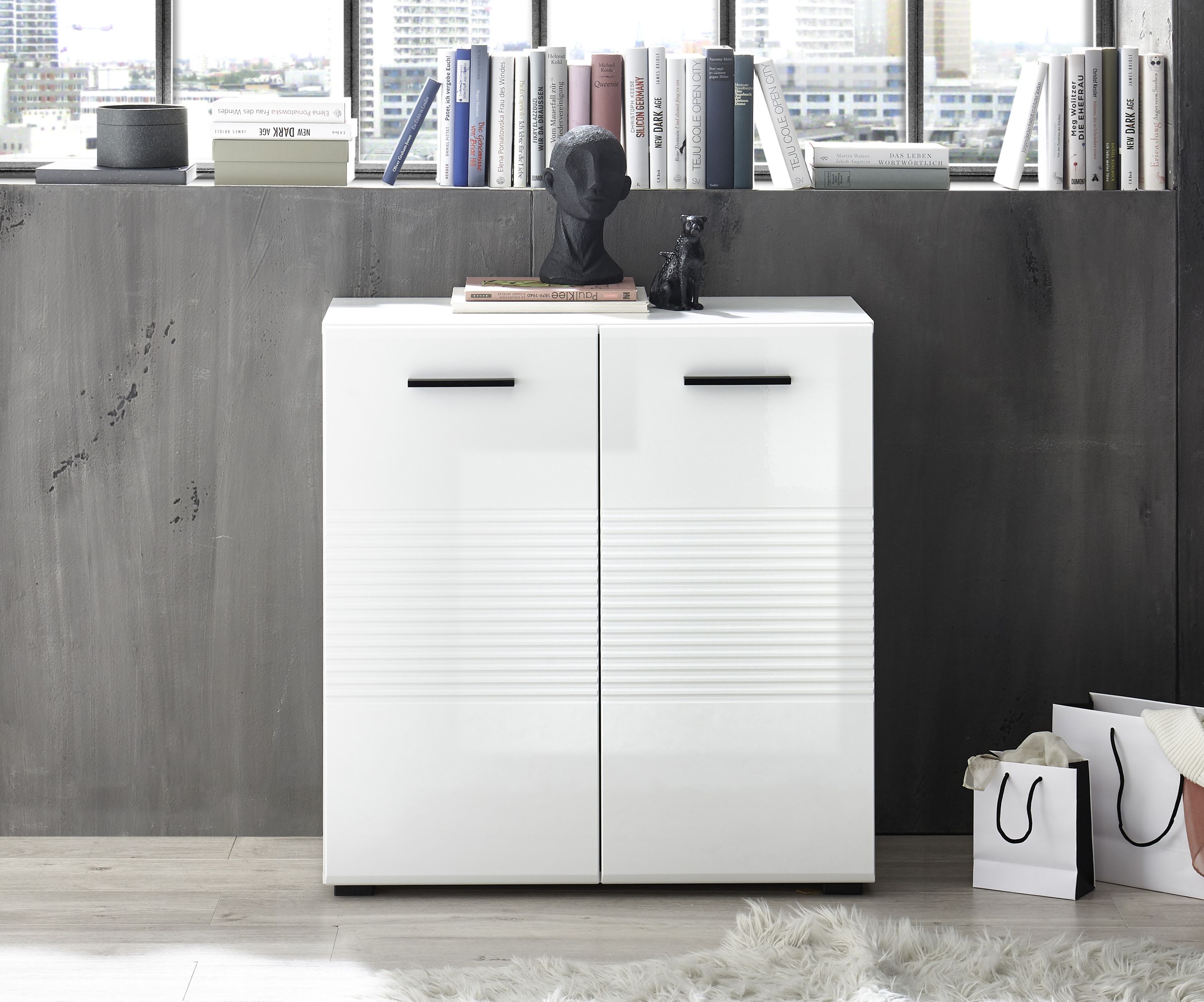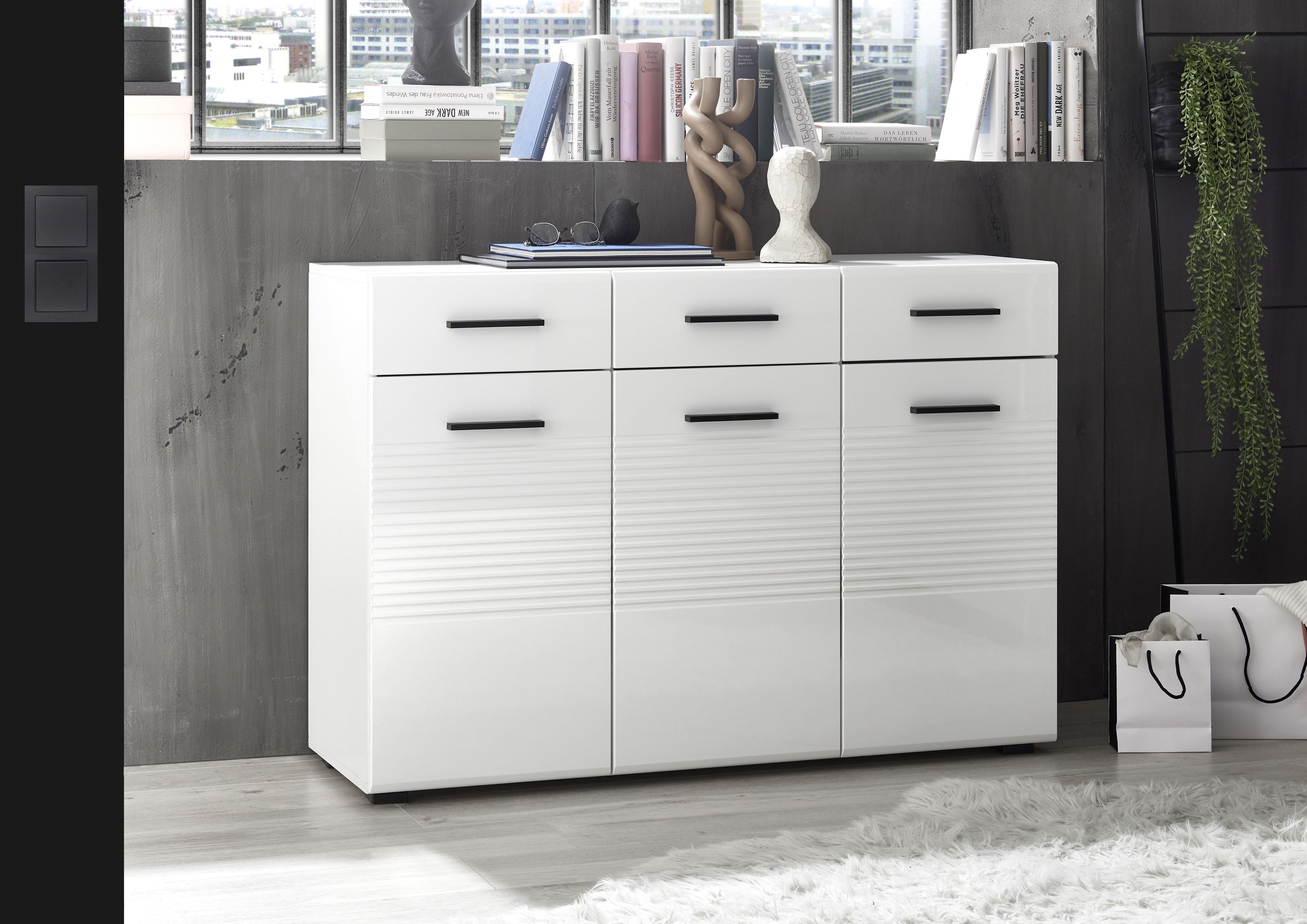 Moderne Kommode in Weiß Hochglanz mit Rillenoptik