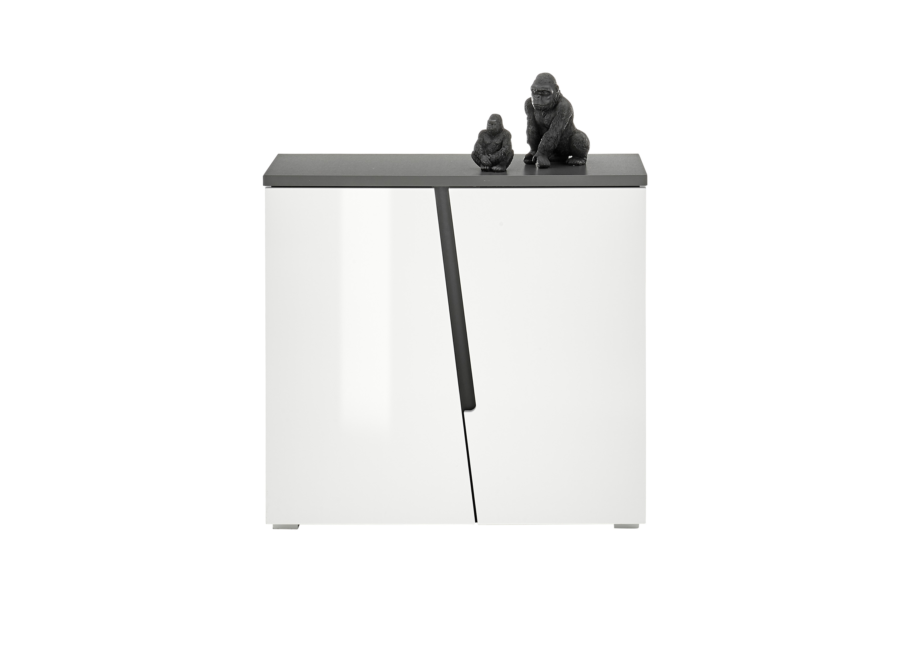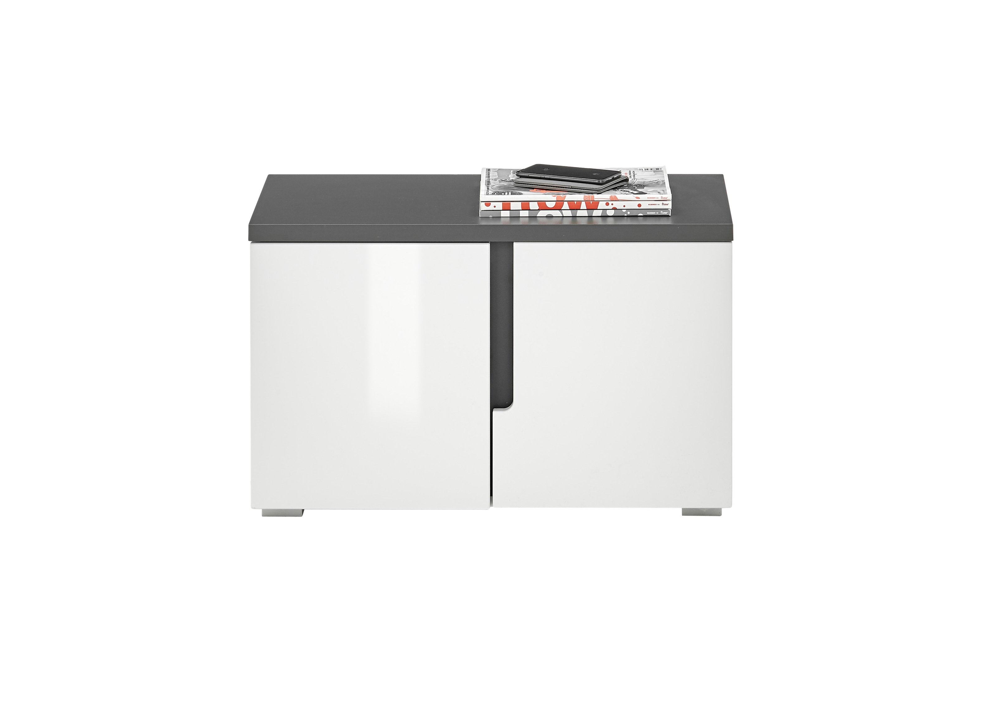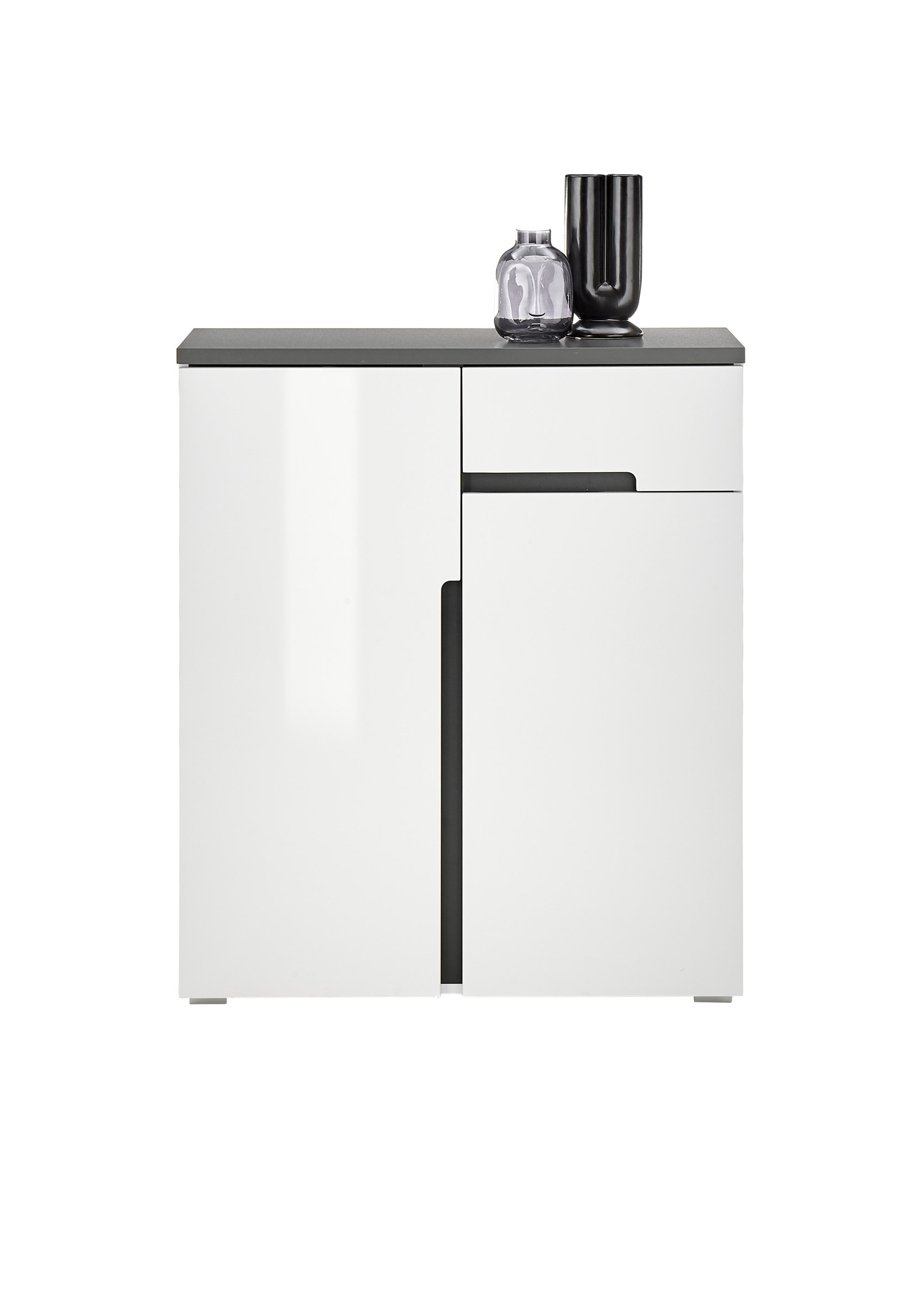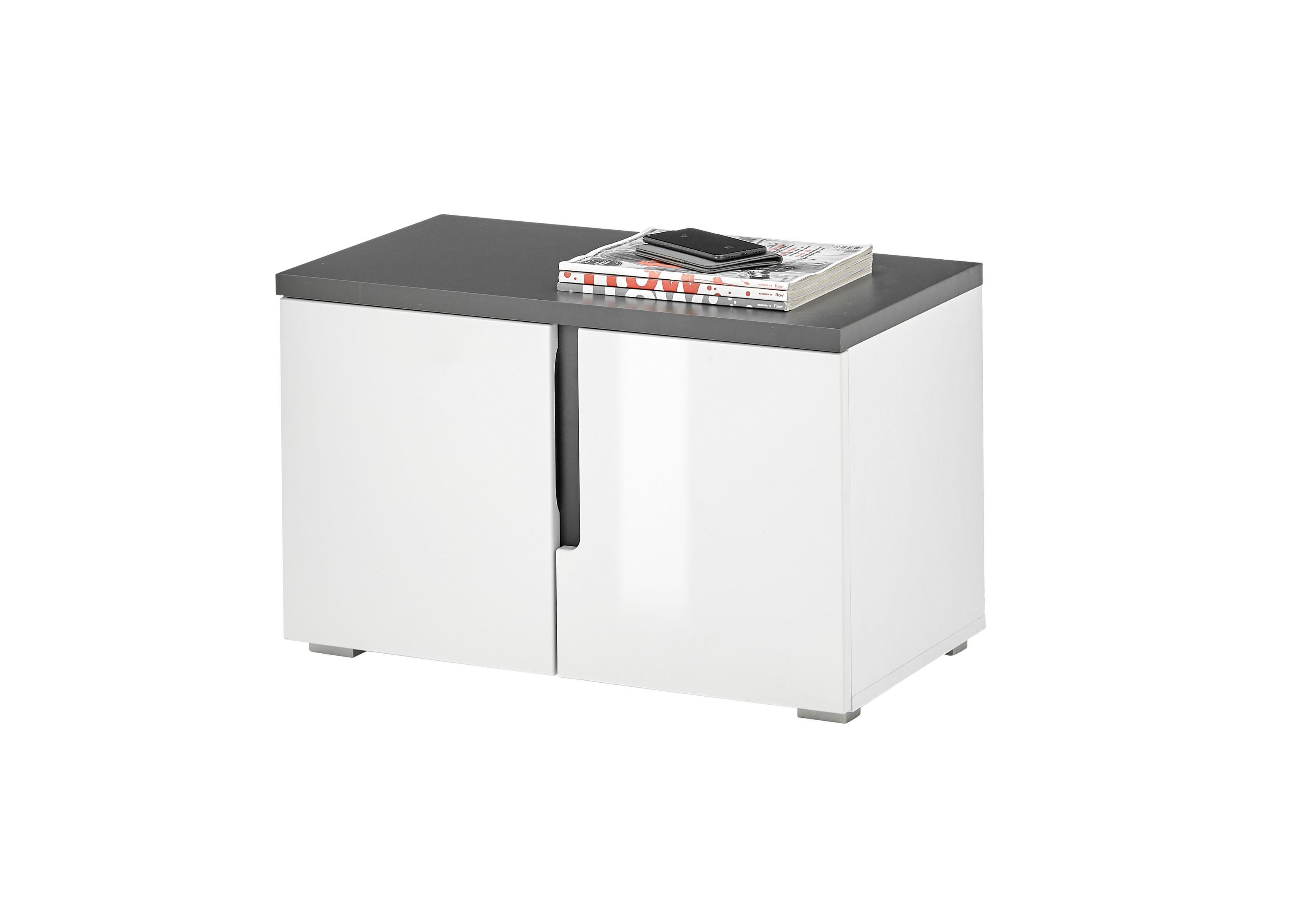 Hinter den zwei Türen mit Einlegeböden sowie in den zusätzlichen Schubladen findet alles seinen festen Platz, sodass Sie Ihren Wohnbereich übersichtlich und ordentlich gestalten können. Der matte weiße Korpus, Fronten in MDF Weiß Hochglanz tiefgezogen und der melaminbeschichtete Oberboden in Anthrazit stehen für eine pflegeleichte, alltagstaugliche Oberfläche, während die FSC-Zertifizierung für verantwortungsvolle Materialauswahl spricht.
