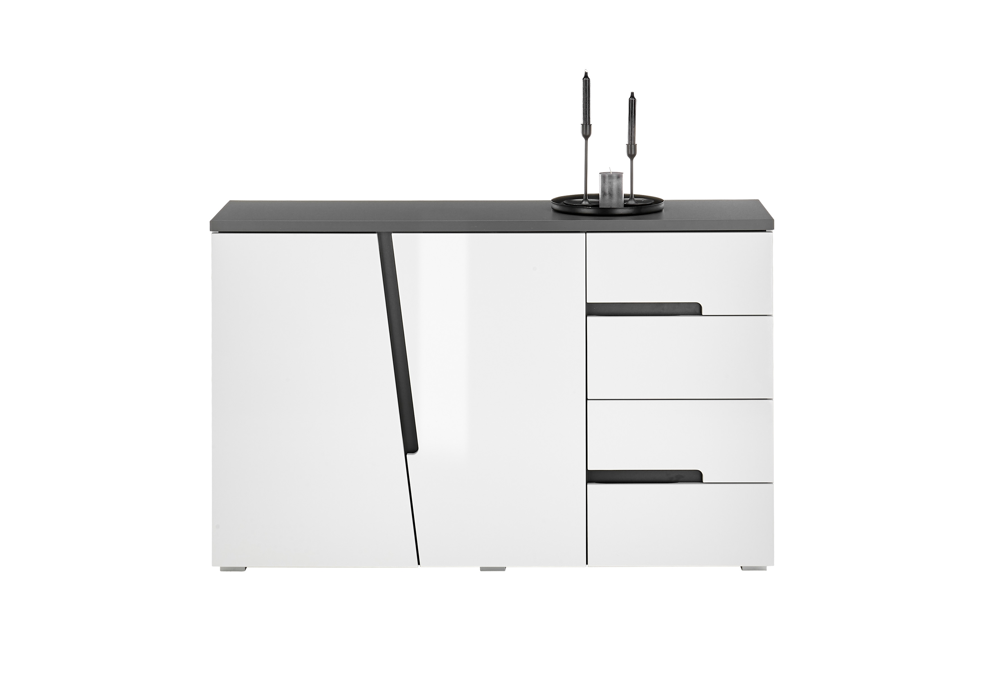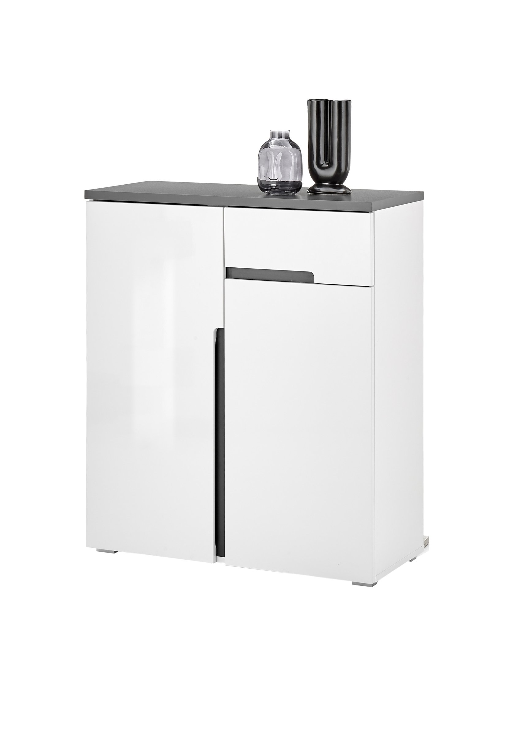 Optisch überzeugt die Kommode mit einer harmonischen Farbkombination: Fronten in MDF Weiß Hochglanz tiefgezogen treffen auf einen matten weißen Korpus und einen Oberboden in Anthrazit mit Melaminbeschichtung. Das Foliendekor in Weiß mit edler Anthrazit-Absetzung verleiht dem Möbelstück eine elegante, zeitgemäße Ausstrahlung und lässt sich mühelos mit verschiedenen Einrichtungsstilen kombinieren.