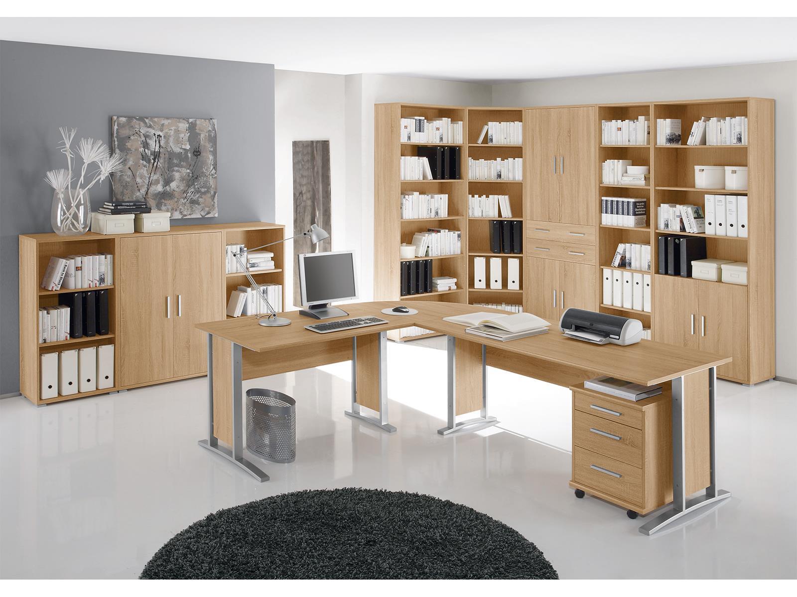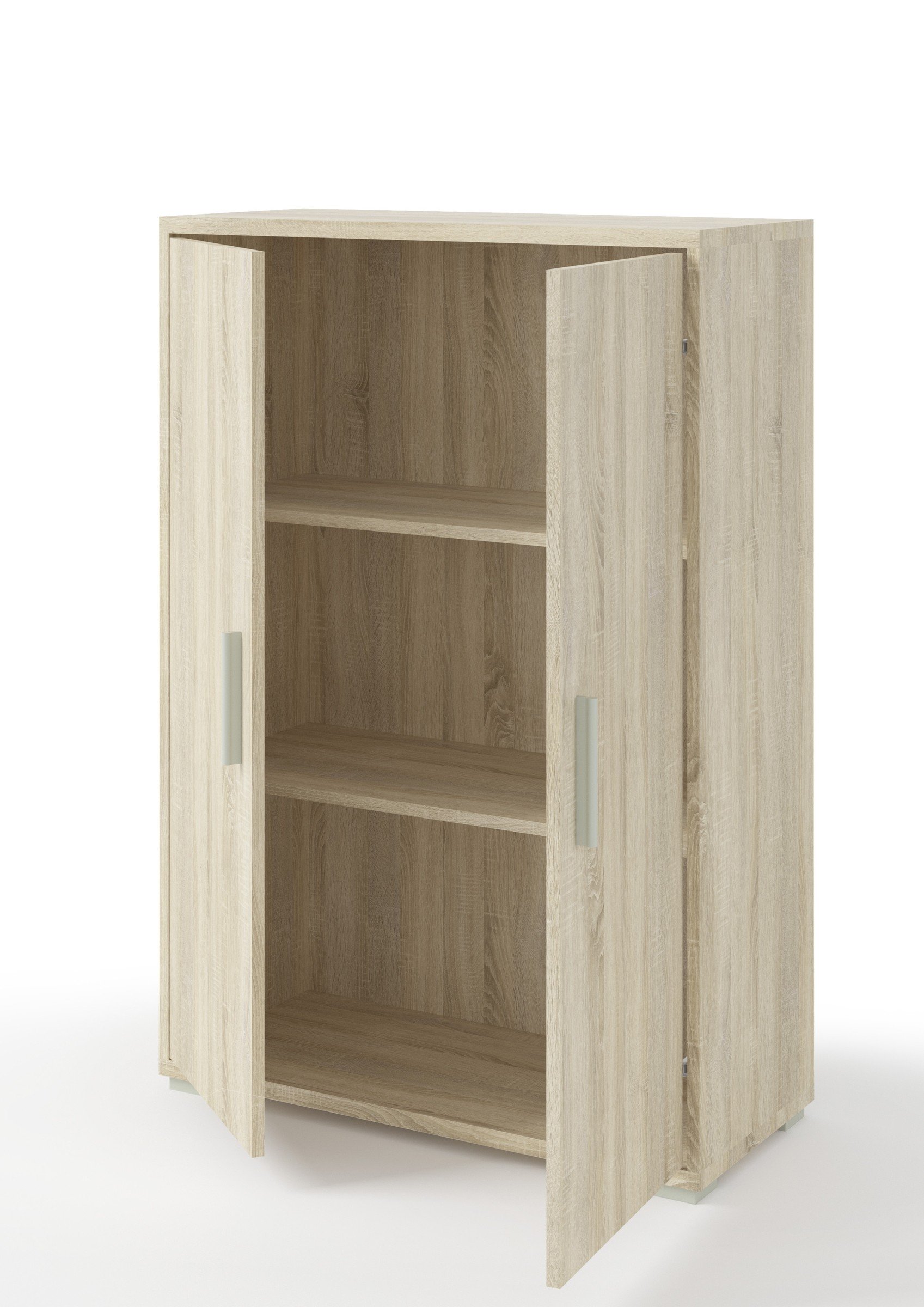 Das Ensemble besteht aus einem kleinen Aktenschrank mit 2 Drehtüren und zwei passenden Regalen, wodurch dir unterschiedliche Aufbewahrungsmöglichkeiten zur Verfügung stehen. Ob Ordner, Bücher oder dekorative Accessoires – in den offenen Fächern und hinter den Türen bringst du deine Dinge strukturiert und gut zugänglich unter.