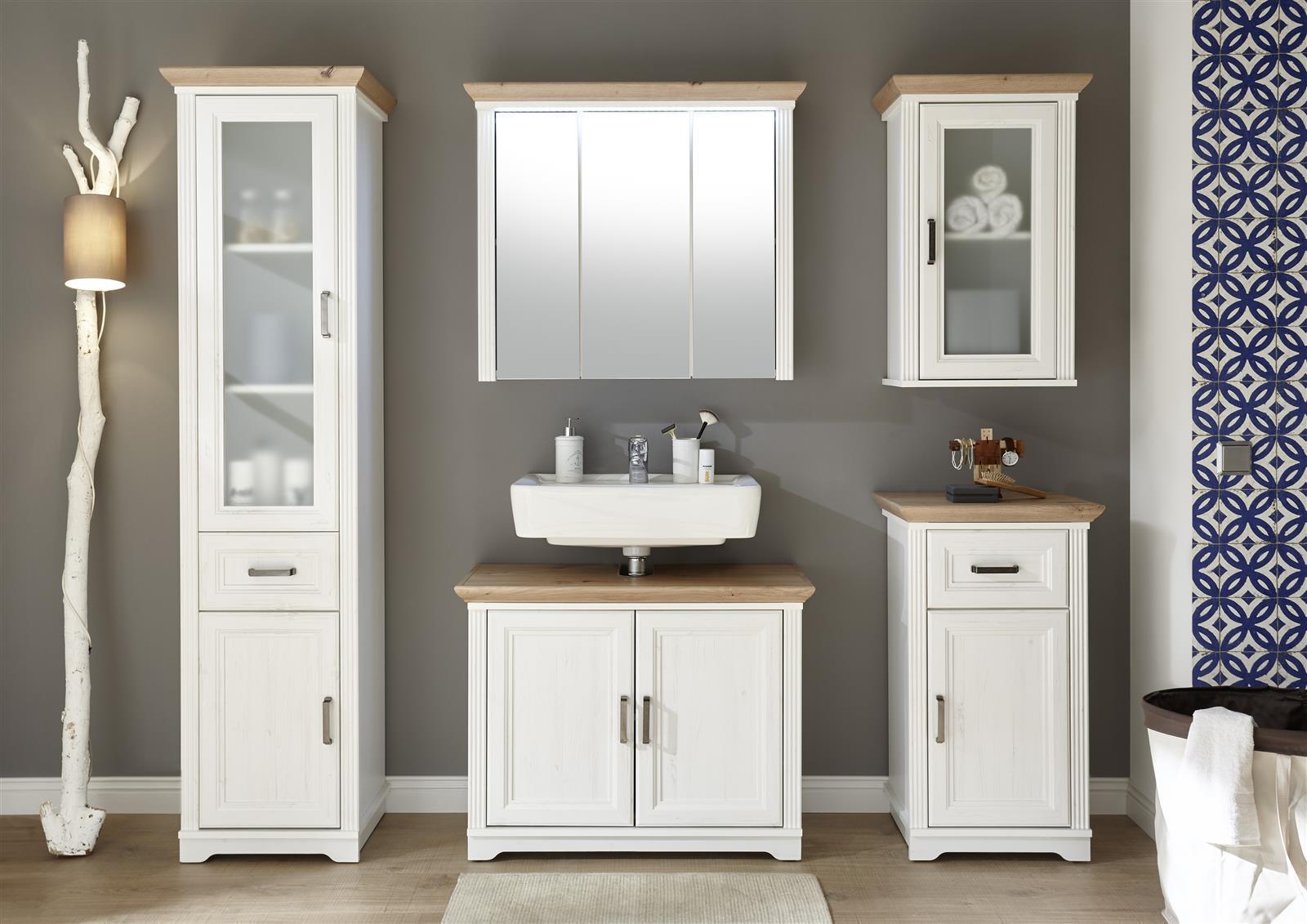 [BulletPoints] => Spiegelschrank im Landhausstil aus Spanplatte in Pinie hell Nachbildung, Absetzung in Artisan Eiche Nachbildung mit 3 Spiegeltüren und 3 Einlegeböden, inkl. LED-Beleuchtung;Breite 83 cm, Höhe 75 cm, Tiefe 25 cm;Pflegeleichte Oberflächen;Made in Europe
