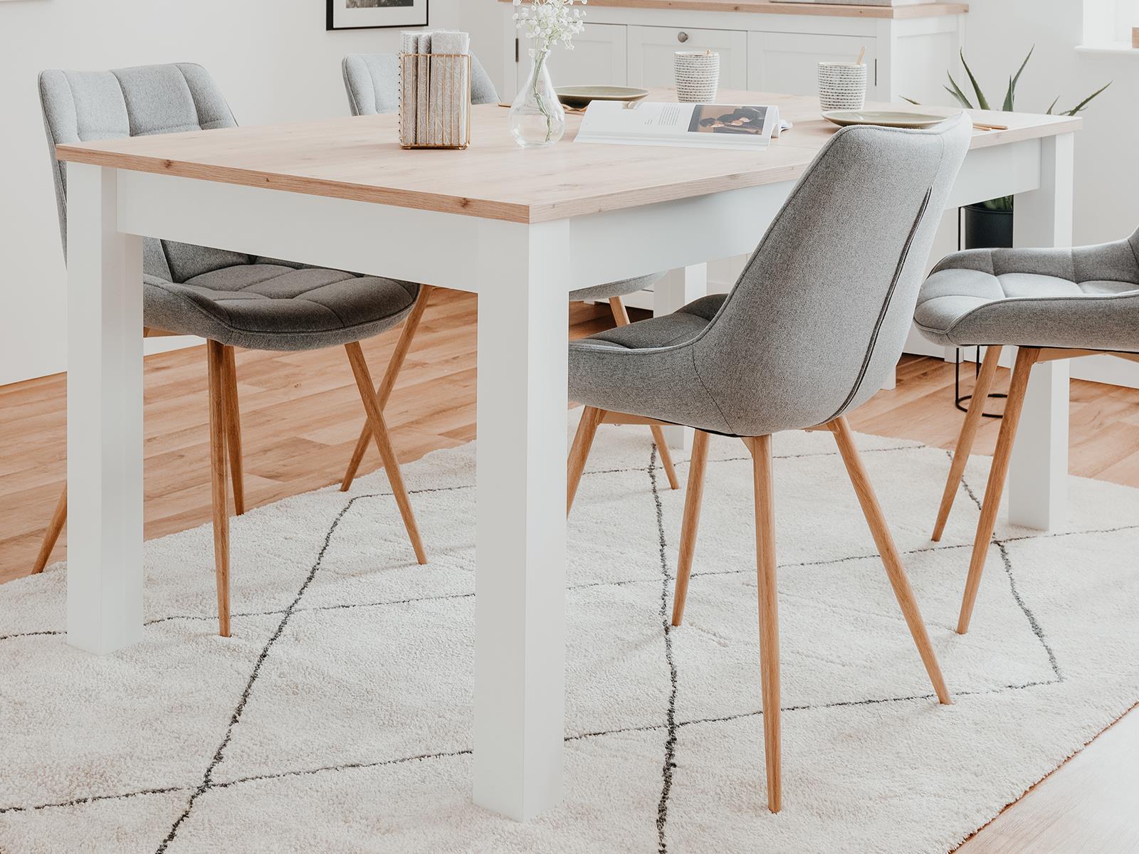 [Bullet-Point 3] => Freundliche Farbkombination - Der Esszimmertisch "Batley I" ist in frischem Weiß gehalten, welches stilsicher mit einer Tischplatte in vornehmer Artisan Eiche Nachbildung kombiniert wird. Die beiden Farben bilden einen attraktiven Kontrast der für eine gefällige Ausstrahlung sorgt. Die Holznachbildung ist qualitativ sehr hochwertig mit täuschend echter Maserung.