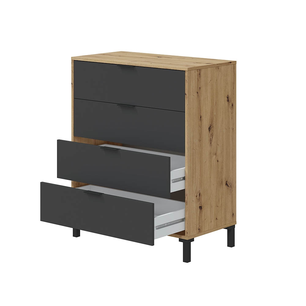 Die vier geräumigen Schubladen auf Metallschienen lassen sich leicht öffnen und schließen und bieten Ihnen eine übersichtliche Aufbewahrung im Alltag. Schwarze, lackierte Metallgriffe betonen das moderne Design und machen jeden Griff besonders angenehm.
