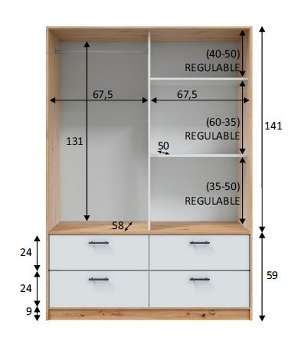 [BulletPoints] => Platzsparend und vielseitig: Mit einer Breite von 140 cm, Höhe von 200 cm und Tiefe von 60 cm passt der Schwebetürenschrank ideal in moderne Räume.;Zeitloses Design: Nodi Eiche kombiniert mit Artik Weiß und schwarz lackierten Metallgriffen unterstreicht den modernen Stil und Eleganz des Schranks.;Praktischer Stauraum: Zwei Schwebetüren, vier geräumige Schubladen und verstellbare Regalböden bieten optimale Ordnung für Kleidung und Accessoires.;Hochwertige Verarbeitung: Made in Spain mit melaminbeschichtetem Holzwerkstoff, ABS-Schienen und kratzschützenden Pads für langlebige Stabilität und Schutz.;Einfache Montage: Der Schrank wird zerlegt geliefert und ermöglicht durch eine klare Anleitung einen schnellen und unkomplizierten Aufbau.