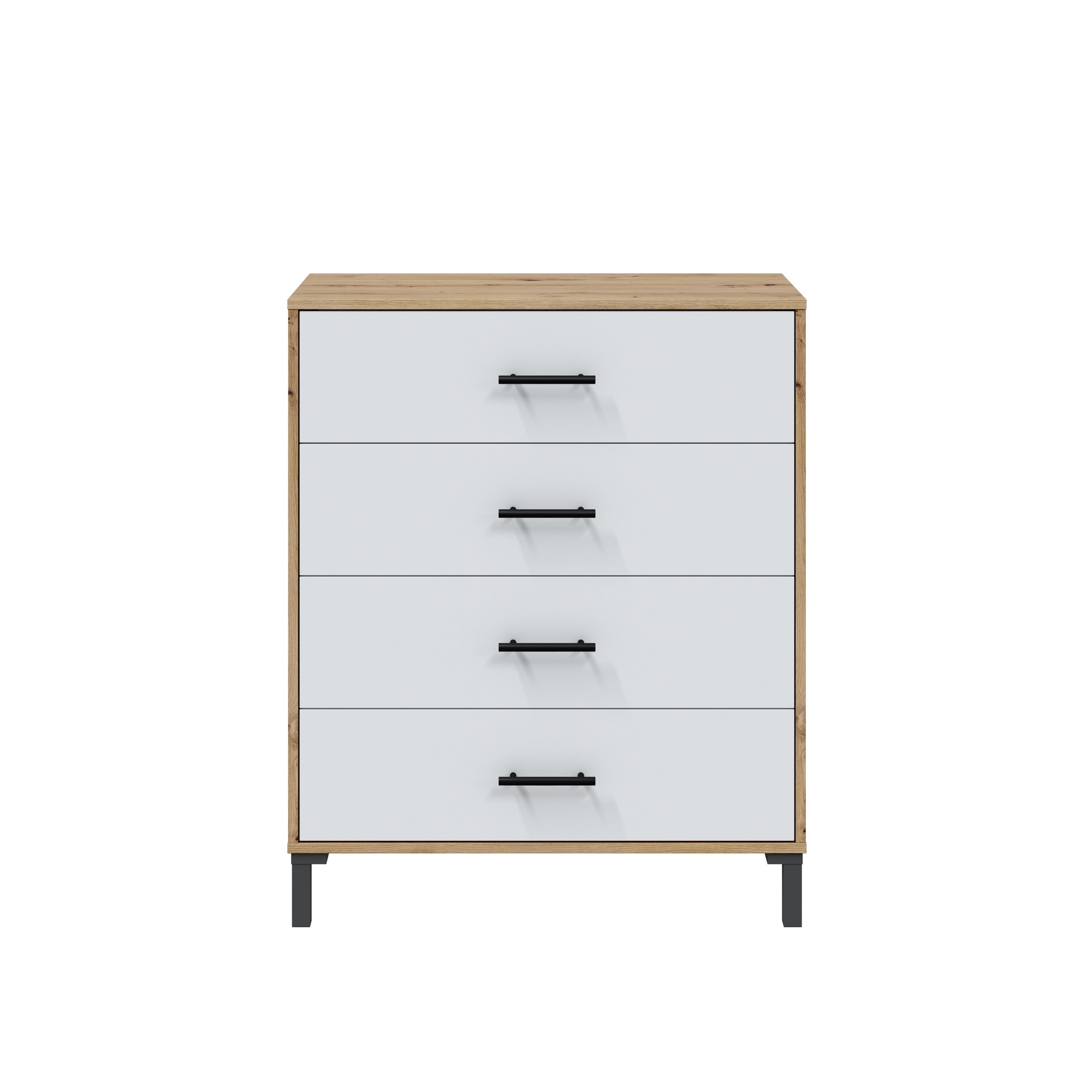 Funktional zeigt sich die Kommode mit vier Schubladen, die auf Metallschienen geführt werden. So lassen sich die Schubkästen komfortabel bedienen und bieten jeweils eine maximale Belastbarkeit von 5 kg – ideal für Wäsche, Textilien, Unterlagen oder andere Alltagsgegenstände. Insgesamt ist die Kommode bis maximal 30 kg belastbar und damit auch in viel genutzten Bereichen ein zuverlässiges Möbelstück.