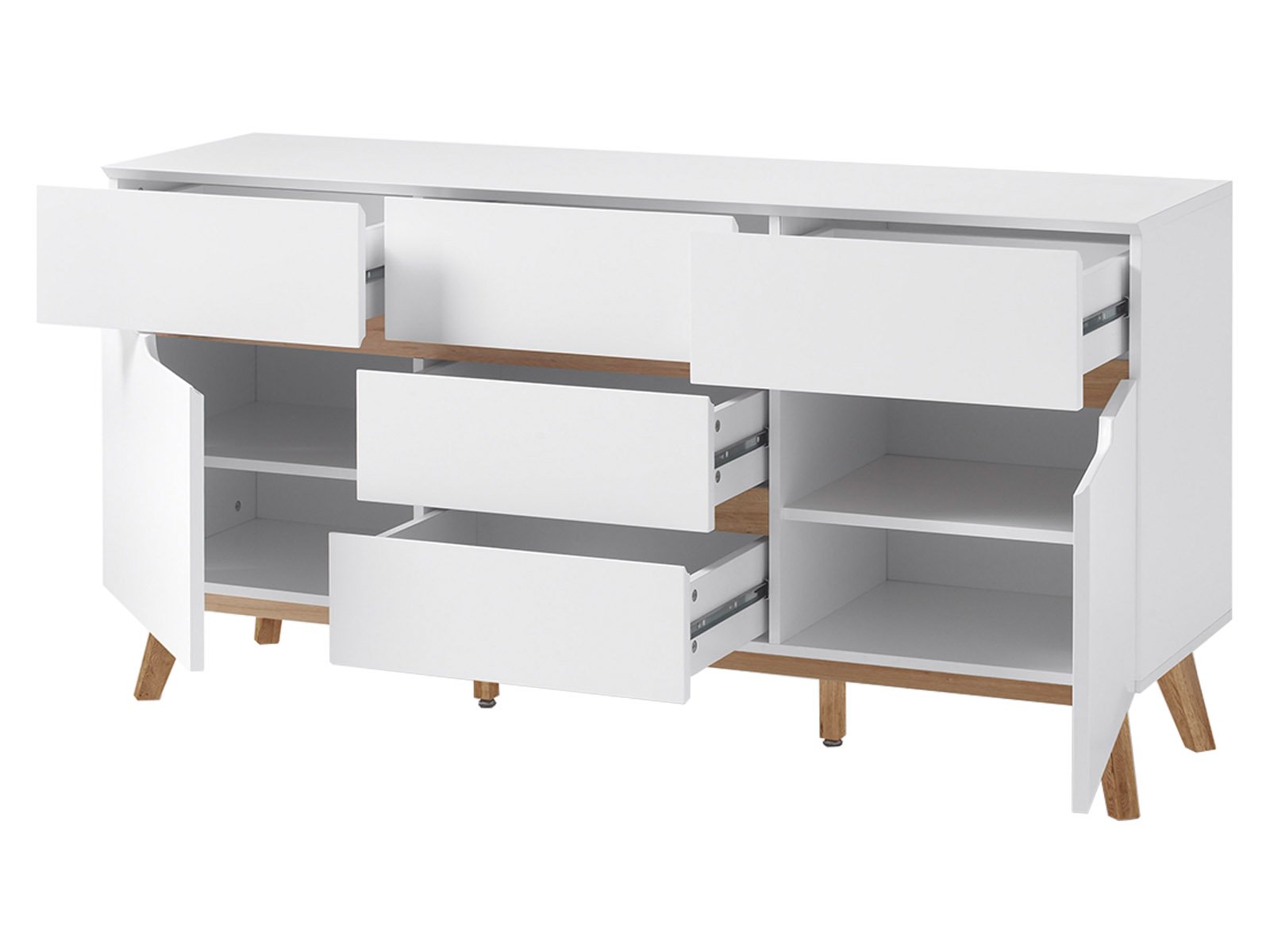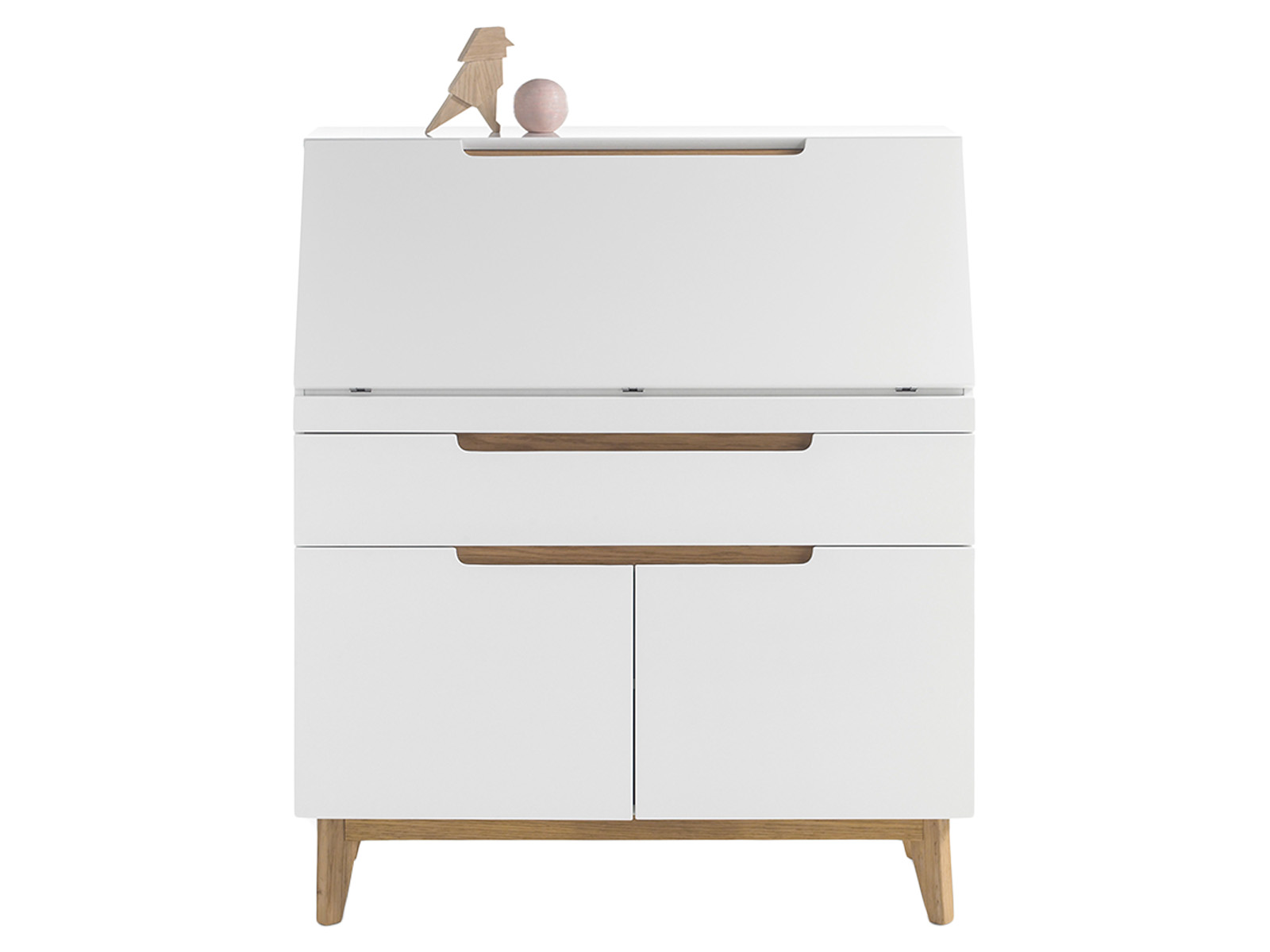 Dank der klaren Linien und der Kombination aus weiß-matt lackiertem MDF mit eichefarbenen Massivholz-Absetzungen passt die Kommode perfekt in zeitgemäße Wohnkonzepte. Die robuste Bauweise sorgt für Langlebigkeit, während die kompakten Maße auch in kleineren Räumen Platz finden.