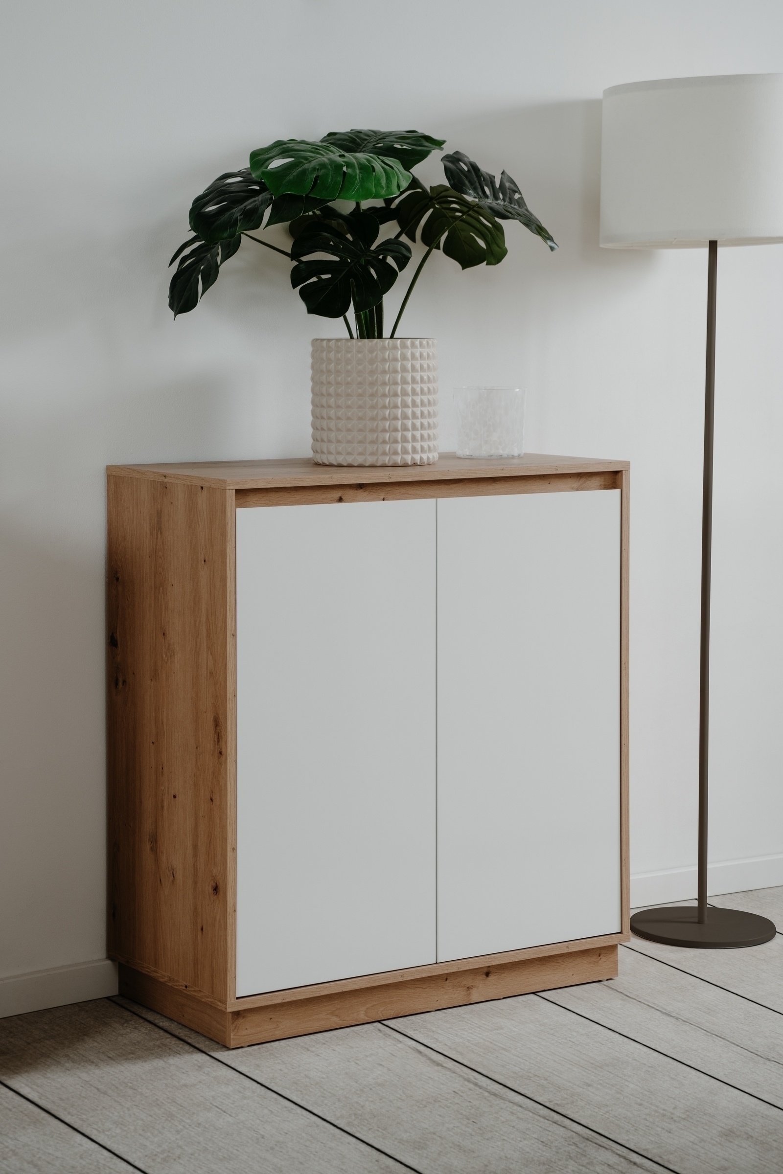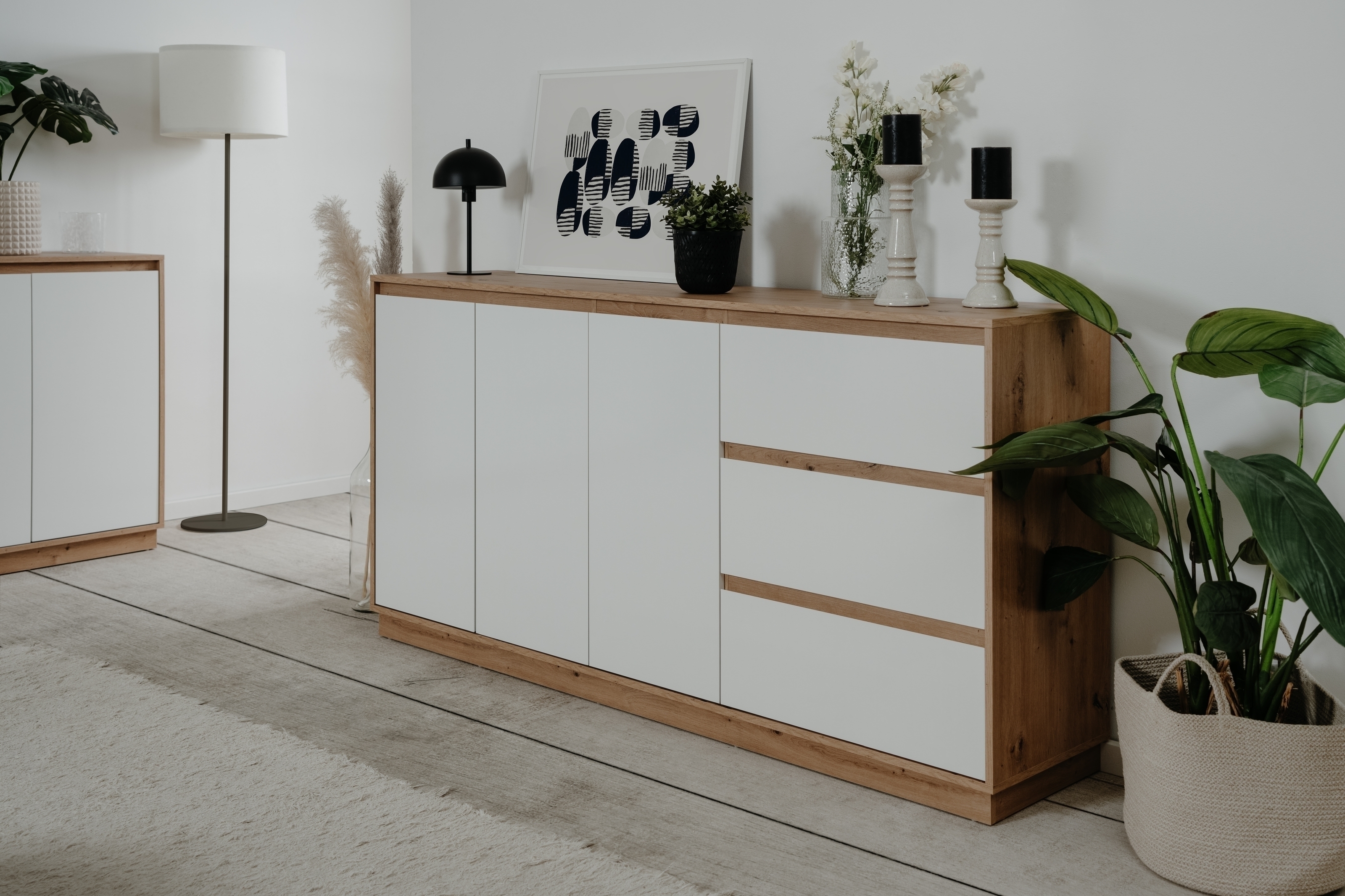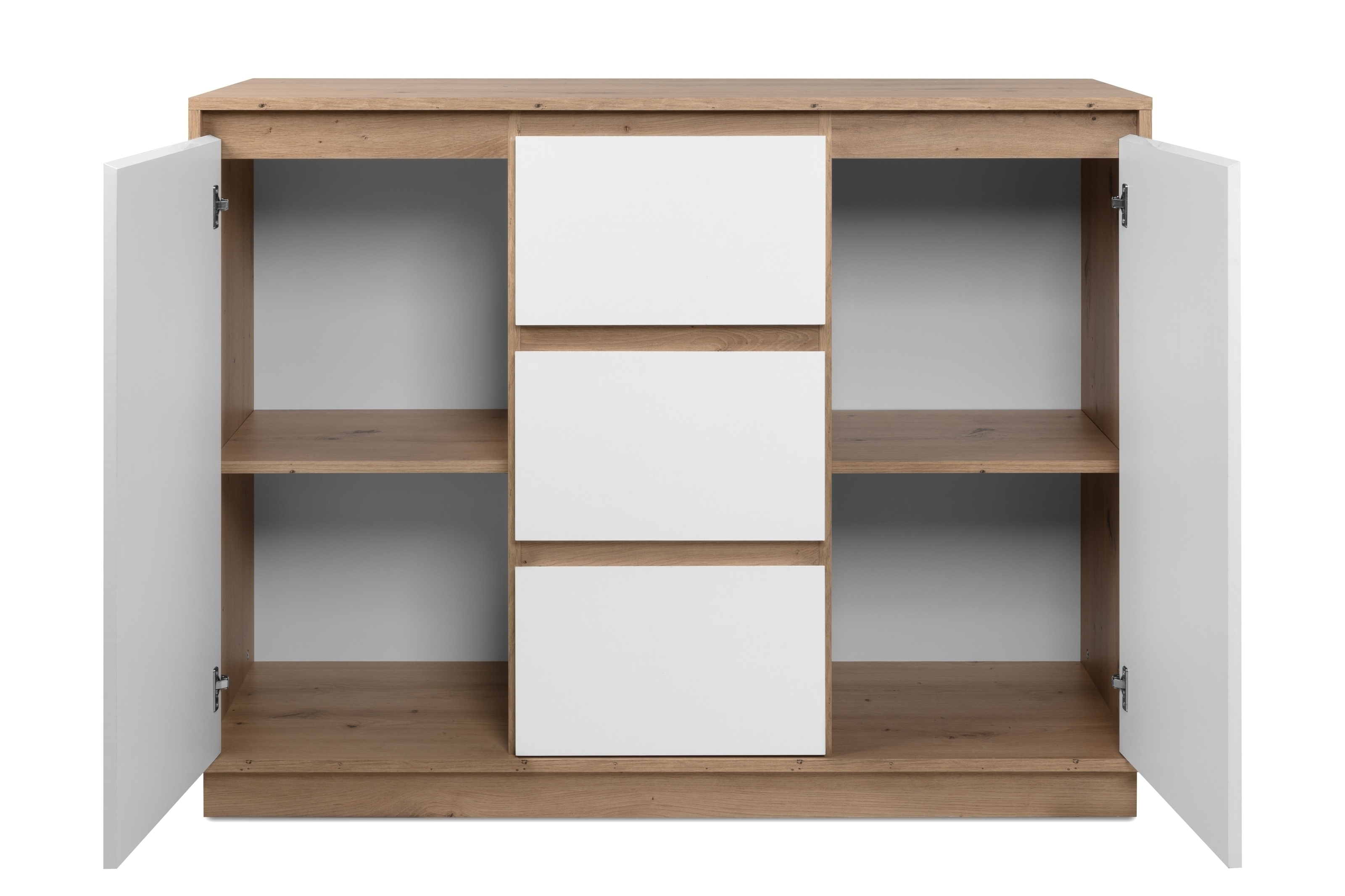 Mit ihrer gelungenen Farbkombination aus Dekor Artisan Oak und weißem Hochglanz (HGL) setzt die Kommode optische Akzente und verleiht jedem Raum eine hochwertige, zeitgemäße Note. Die grifflose Gestaltung mit Schrägkante unterstreicht den klaren Look und sorgt gleichzeitig für komfortables Öffnen der Türen.