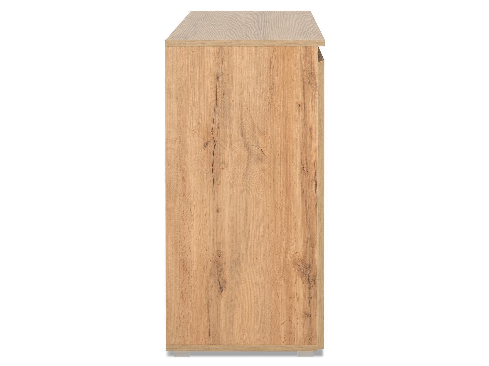 Hinter den Türen stehen Ihnen vier Einlegeböden zur Verfügung, auf denen Sie etwa 15 Paar Schuhe oder andere Utensilien übersichtlich organisieren können. Die praktische Schublade eignet sich hervorragend für kleinere Accessoires oder Dinge, die Sie schnell zur Hand haben möchten. Dank der kompakten Maße mit einer Breite von 75 cm, einer Höhe von 108 cm und einer Tiefe von 37 cm findet die Kommode auch in schmaleren Bereichen problemlos ihren Platz.
