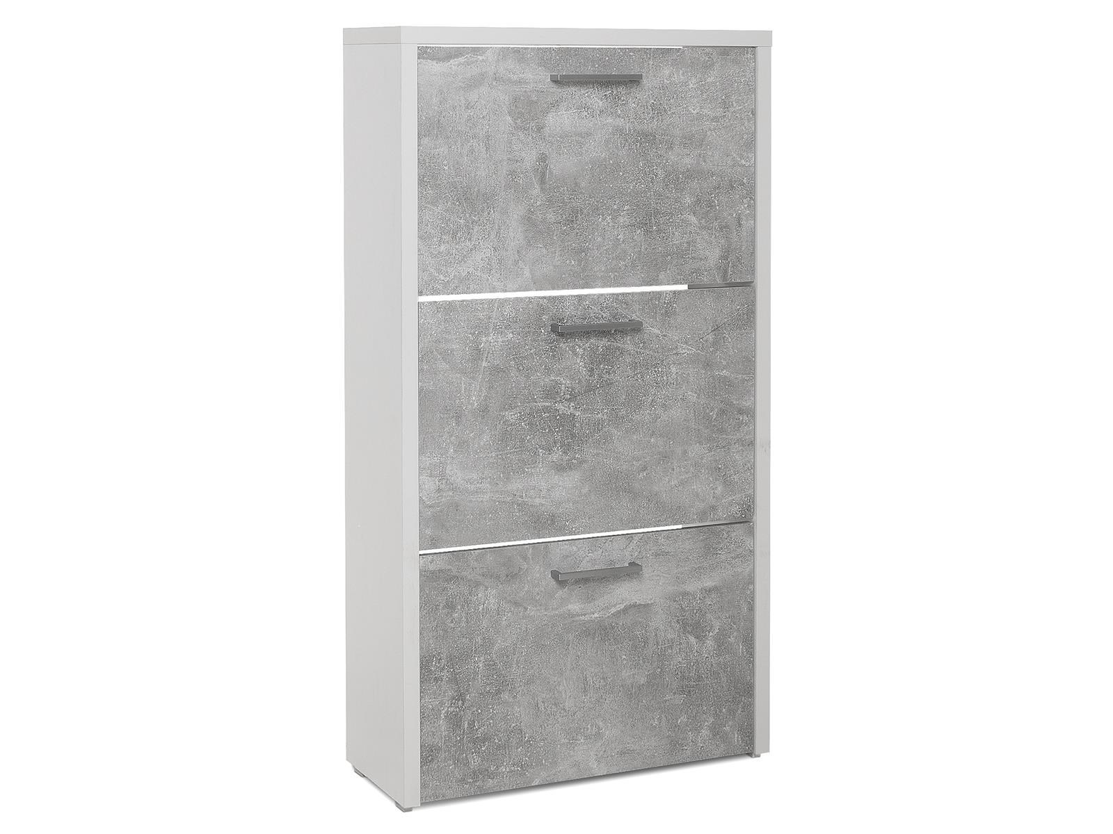 [metaDescription] => Moderner Schuhkipper aus melaminharzbeschichteter Spanplatte, Korpus in Weiß, Front in Strukturbeton Nachbildung mit 3 Klappen mit Doppelwalze Breite 61 cm,