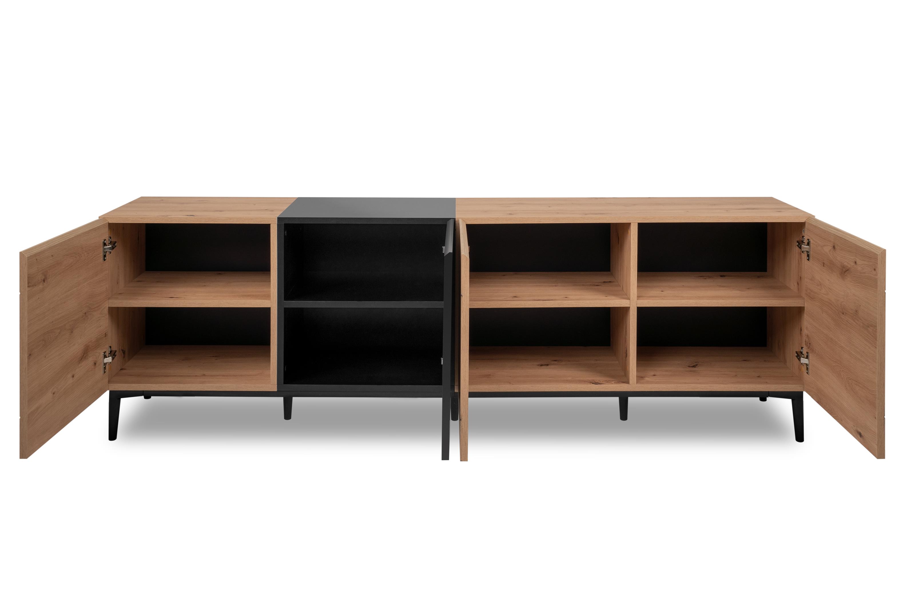 [metaDescription] => Modernes Lowboard aus Spanplatte in Artisan-Eiche, Absetzung in Schwarz mit 4 Holztüren - Breite 200 cm, Höhe 65 cm, Tiefe 42 cm