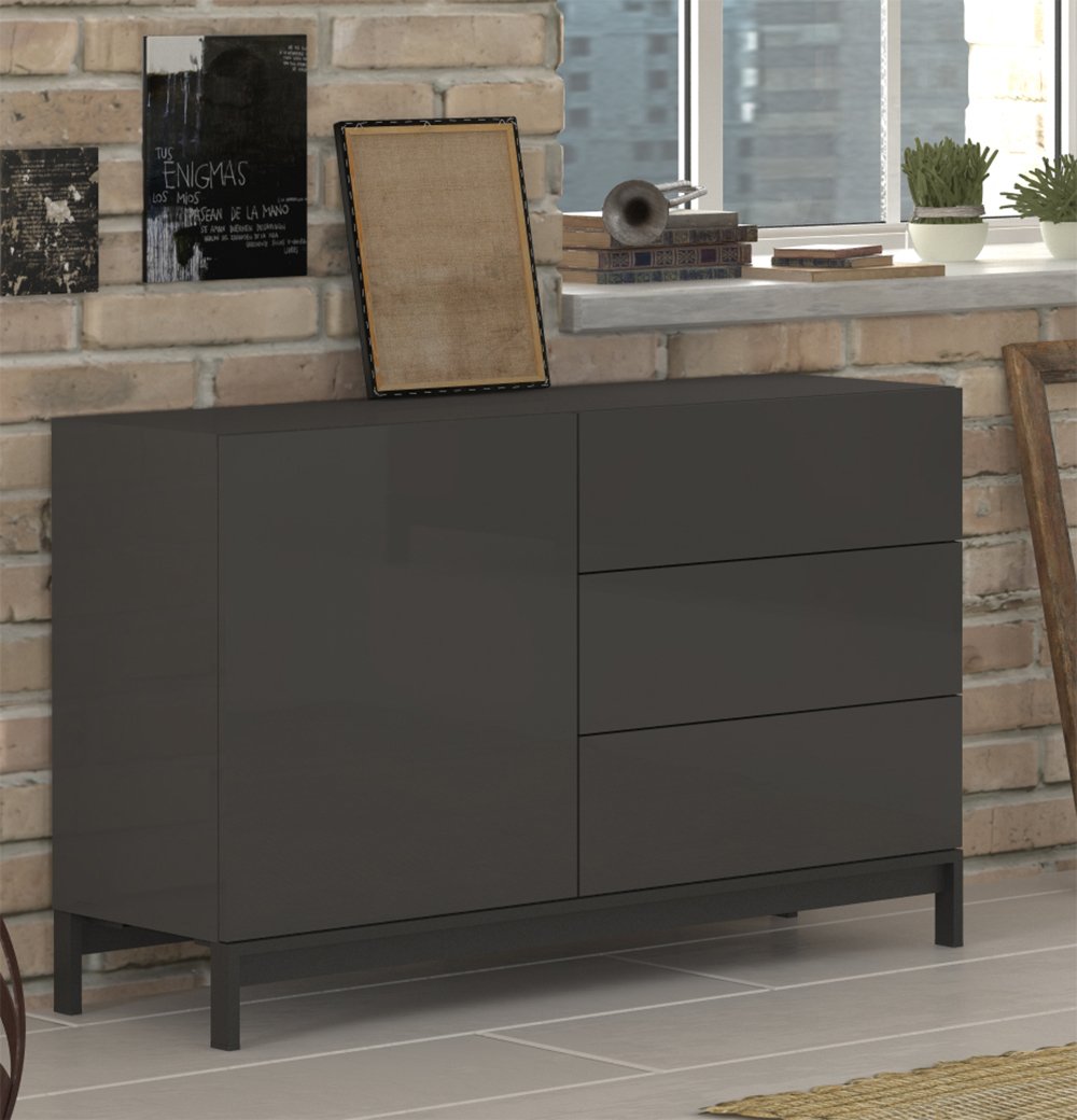 Die hochglänzende anthrazitfarbene Front in Kombination mit dem schwarzen Metallgestell verleiht der Kommode einen modernen Look, der sich harmonisch in viele Einrichtungsstile einfügt. Hinter 1 Tür, in 3 Schubkästen und auf 1 Ablageboden lassen sich Dinge ordentlich verstauen und bleiben dennoch schnell griffbereit.