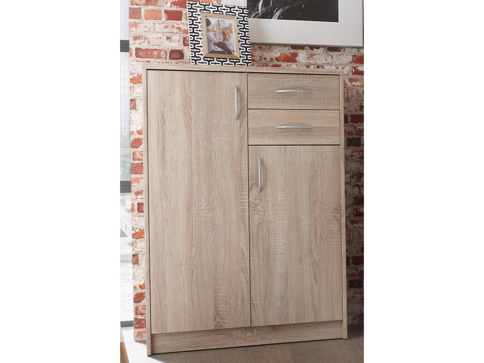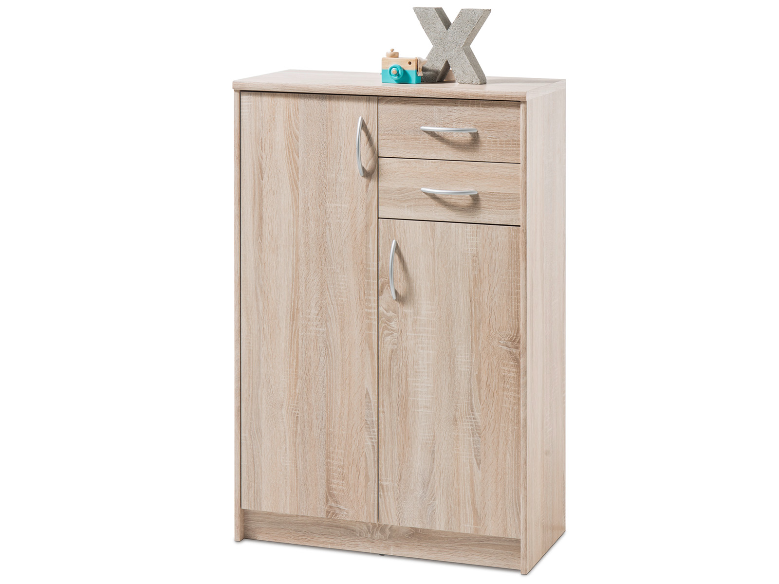 Die Kommode „Olli IV“ von Preisbrecher ist eine moderne Stauraumlösung im Sonoma-Eiche Dekor, die auf kompakter Grundfläche reichlich Platz für alltägliche Dinge bietet. Mit 2 Holztüren, 2 Schubkästen und 5 Einlegeböden lassen sich Kleidung, Unterlagen oder Wohnaccessoires ordentlich und griffbereit verstauen.