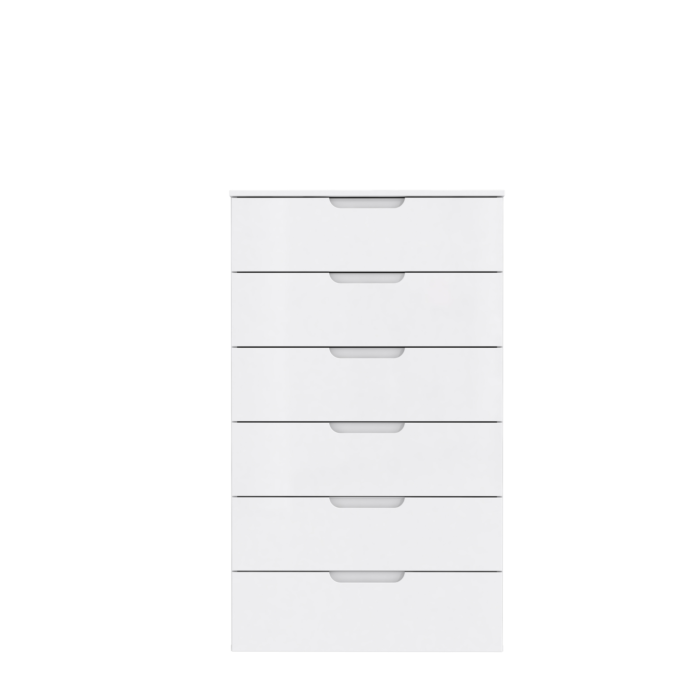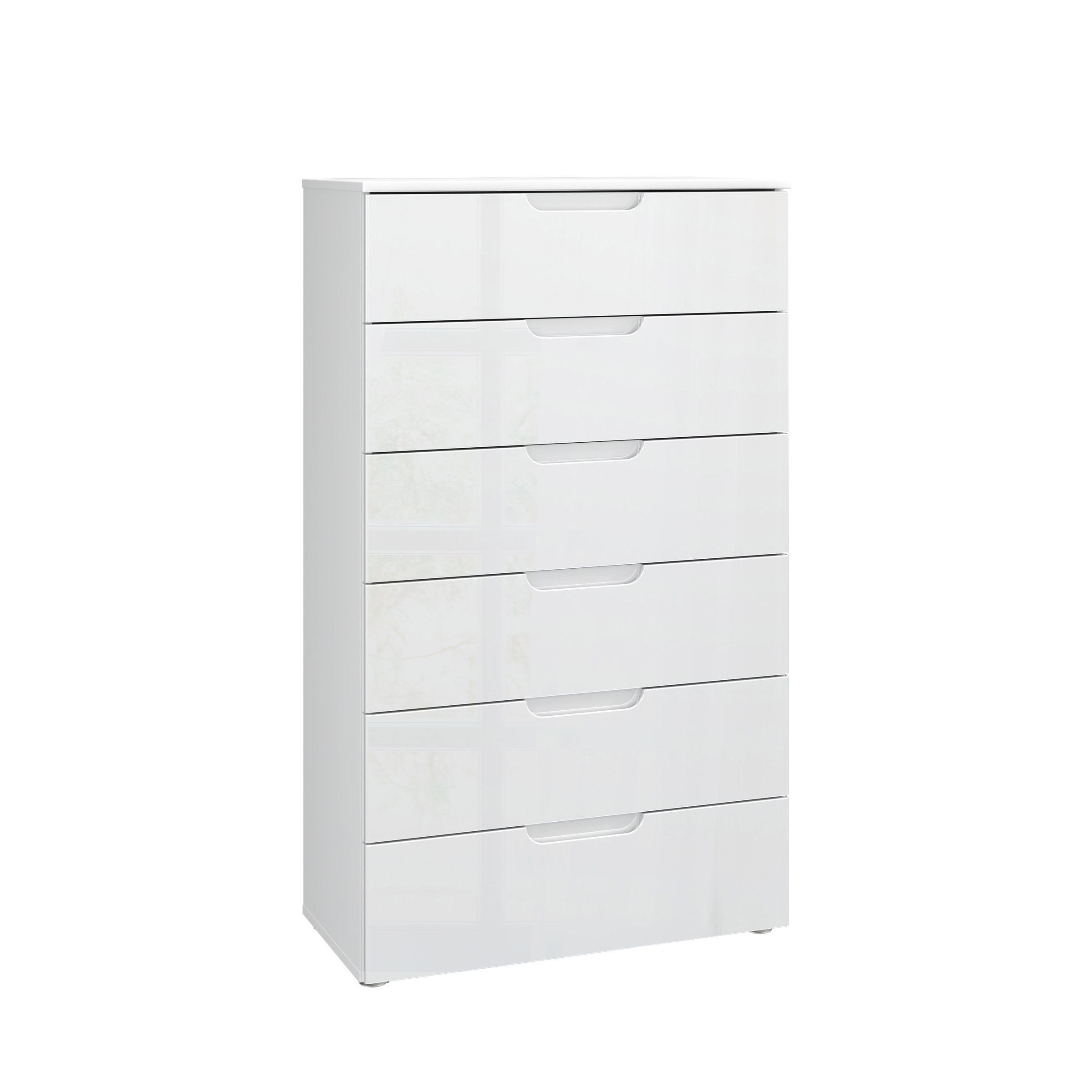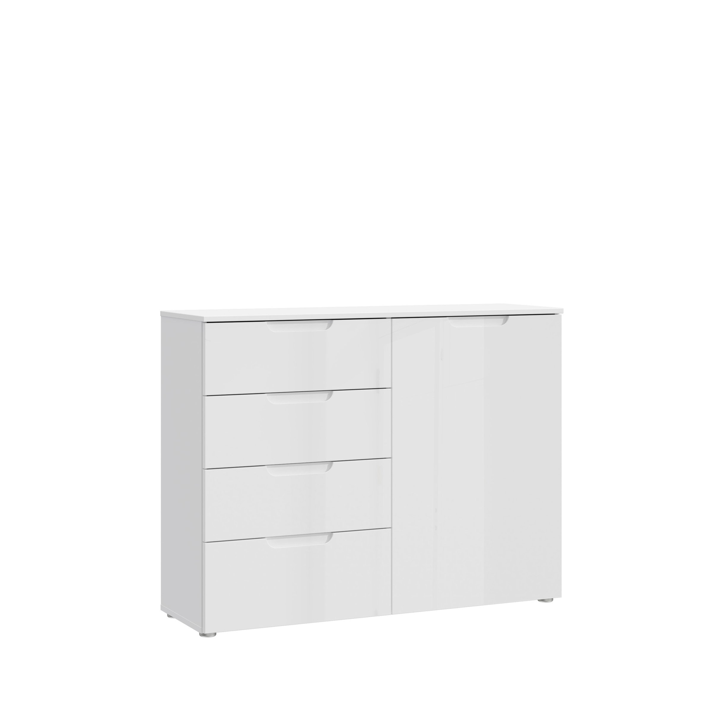 Optisch überzeugt die Kommode mit einer Front aus weißglänzendem MDF, die zusammen mit dem weißen Korpus einen zeitlosen, modernen Eindruck hinterlässt. Die grauen Kunststofffüße ergänzen das Design mit einem dezenten Farbakzent und runden das Gesamtbild stilvoll ab. Dank Beschichtung in Dekorfolie und der verwendeten Materialien ist die Oberfläche pflegeleicht und für den täglichen Gebrauch geeignet.