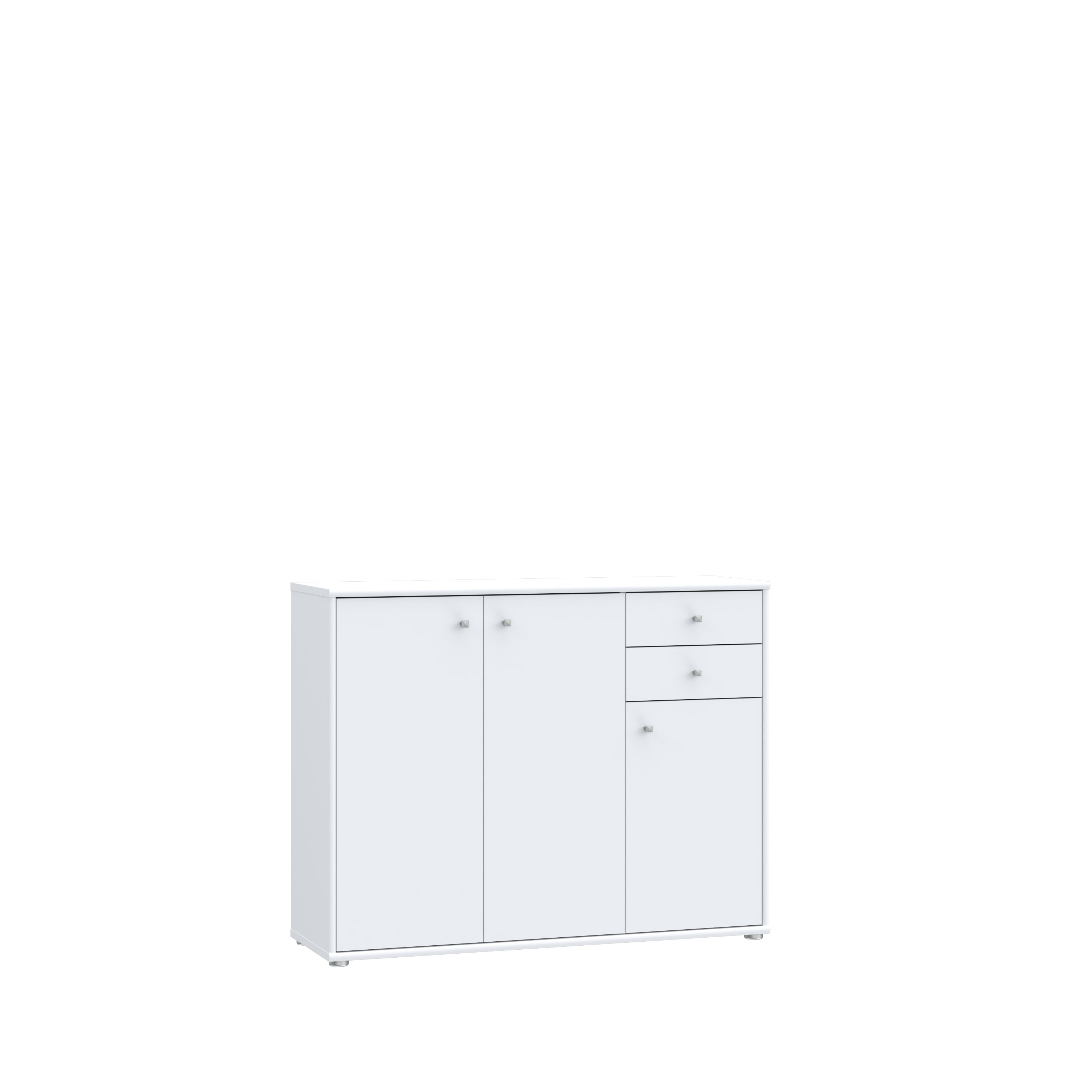 Die Kommode Tembi von freiraum verbindet moderne Optik mit durchdachter Funktionalität. In strahlendem Weiß gehalten und mit Griffen im Alu Look fügt sie sich harmonisch in viele Einrichtungsstile ein und wirkt zugleich zeitlos. Mit einer Breite von 108,8 cm, einer Höhe von 85,5 cm und einer Tiefe von 34,8 cm bietet sie Stauraum, ohne den Raum zu überladen.