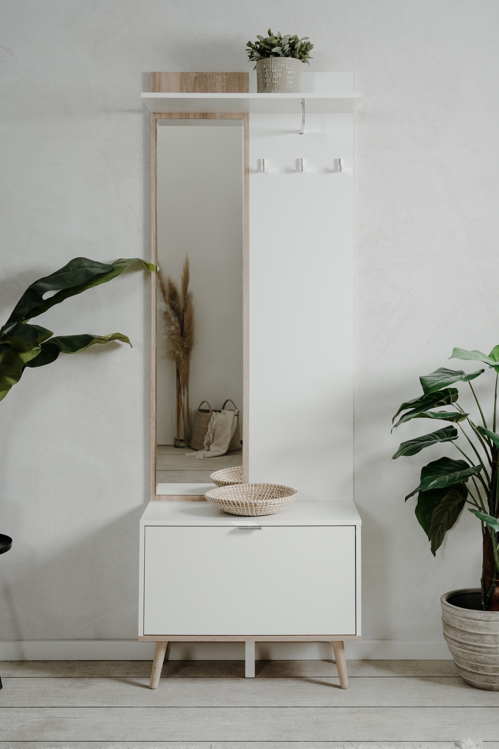 Die Garderobe besticht durch ihre hochwertige Verarbeitung: Der Korpus besteht aus robustem Holzwerkstoff mit Melaminbeschichtung, die für Langlebigkeit und einfache Pflege sorgt. Die ABS-Kanten schützen vor Beschädigungen und verleihen der Garderobe eine saubere, moderne Optik. Der integrierte Spiegel aus hochwertigem Spiegelglas erweitert nicht nur den Funktionsumfang, sondern bringt auch mehr Licht in den Raum.