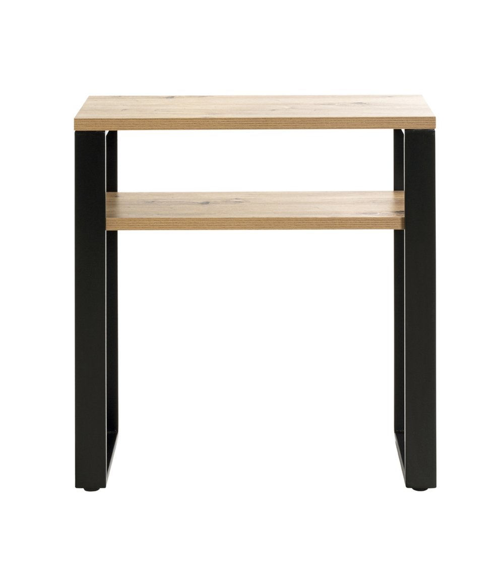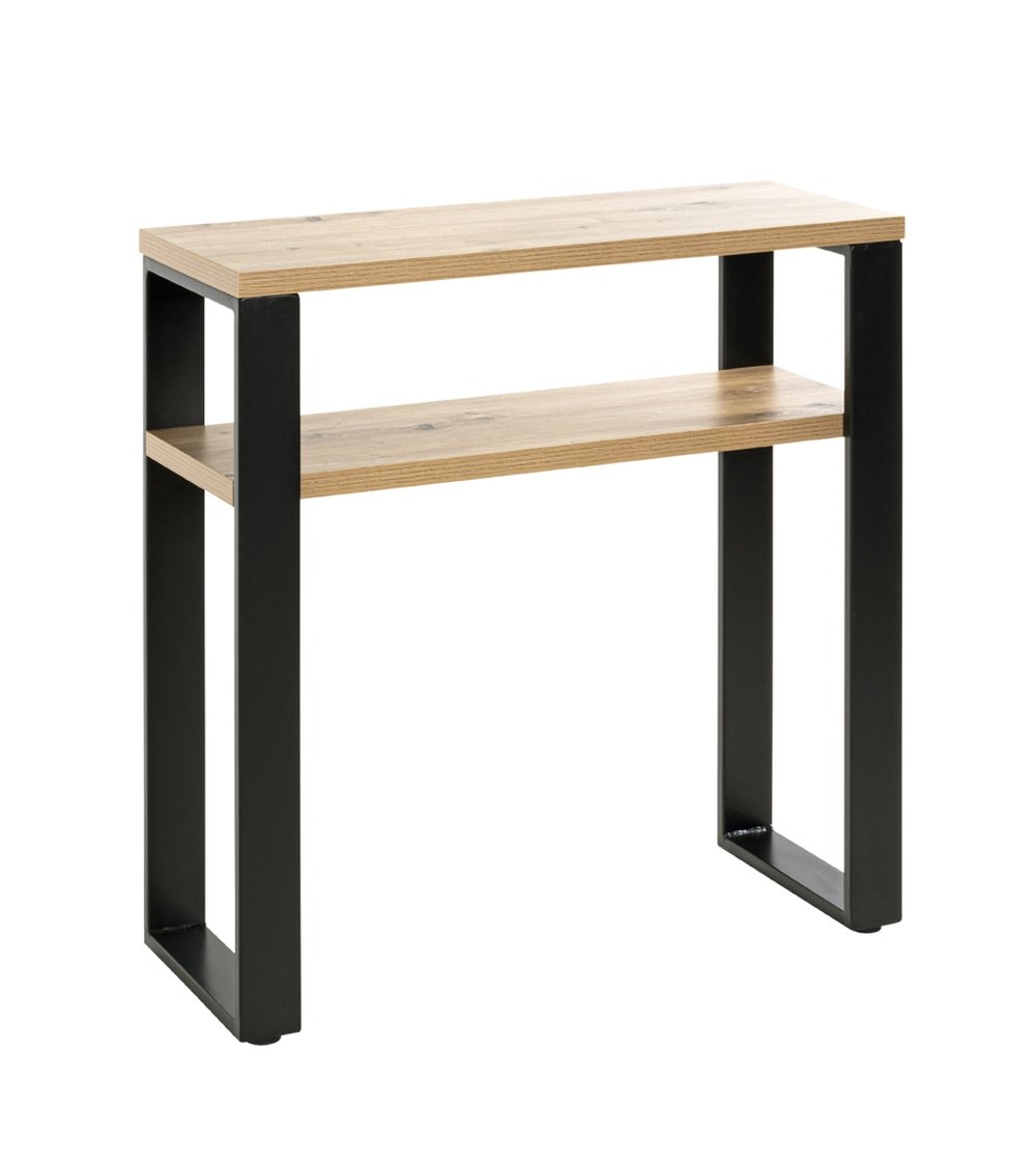 Das stabile Stahlrohrgestell in schwarz lackierter Ausführung bildet einen harmonischen Kontrast zu den Ablagen aus MDF in Eiche hell mit Farbakzenten. So fügt sich die Konsole mühelos in moderne Wohnstile ein – ob im Flur als Ablage, im Wohnzimmer für Deko-Objekte oder im Schlafzimmer als zusätzliche Stellfläche.