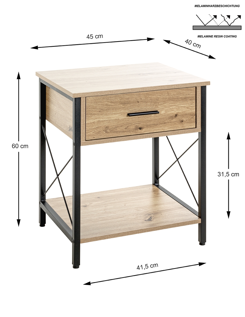 Melaminharzbeschichtetes MDF und Metall sorgen für Stabilität und eine pflegeleichte Oberfläche.