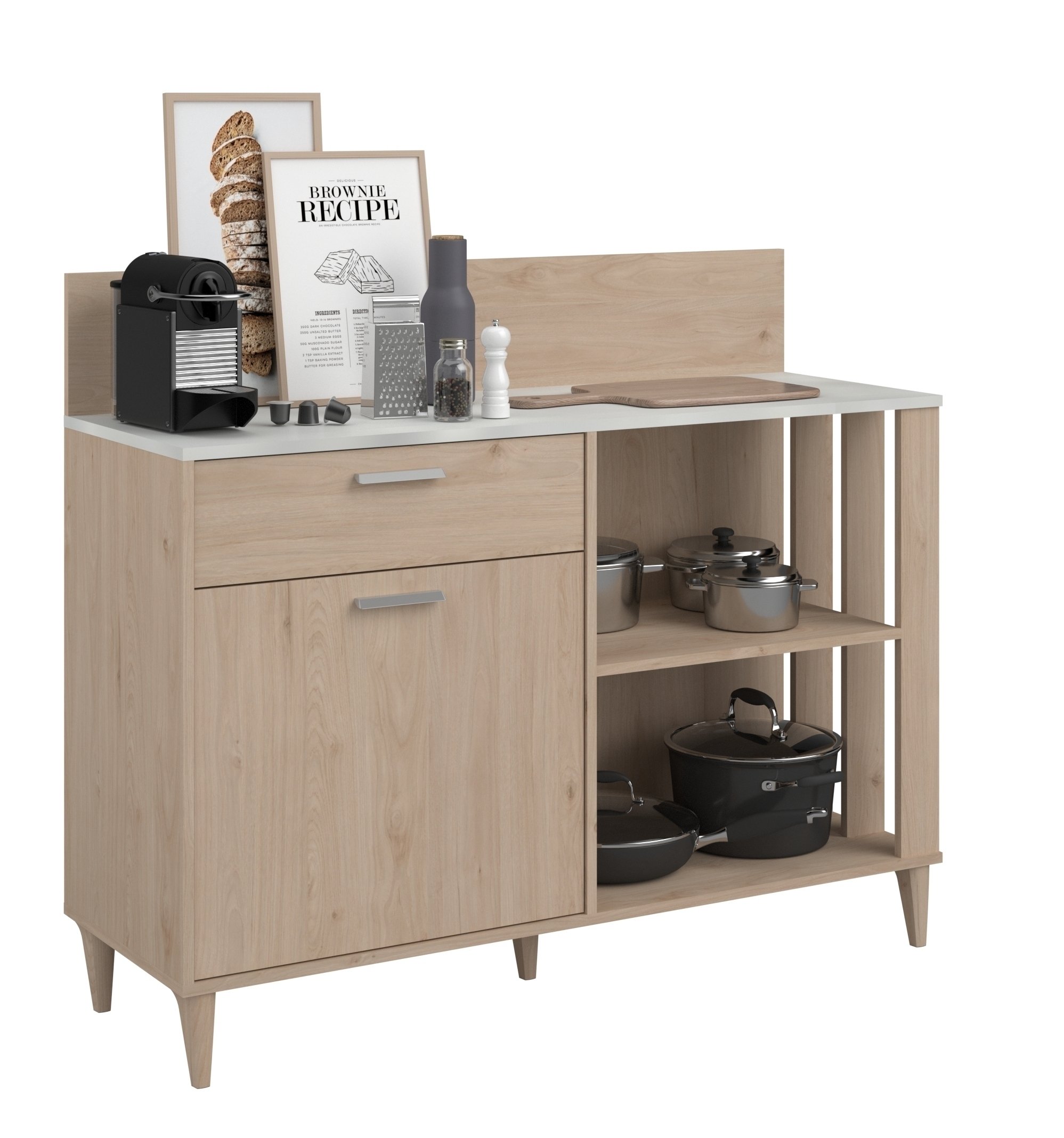 Unter der großen Abstellfläche ist die Stauraumaufteilung klar strukturiert: Links befindet sich ein praktischer Schubkasten für kleinere Utensilien sowie eine Tür, hinter der weiterer geschlossener Stauraum für Geschirr, Tischwäsche oder Vorräte zur Verfügung steht. Auf der rechten Seite schaffen zwei offene Fächer zusätzlichen Platz für Bücher, Deko oder häufig genutzte Gegenstände, die Sie gerne griffbereit haben.