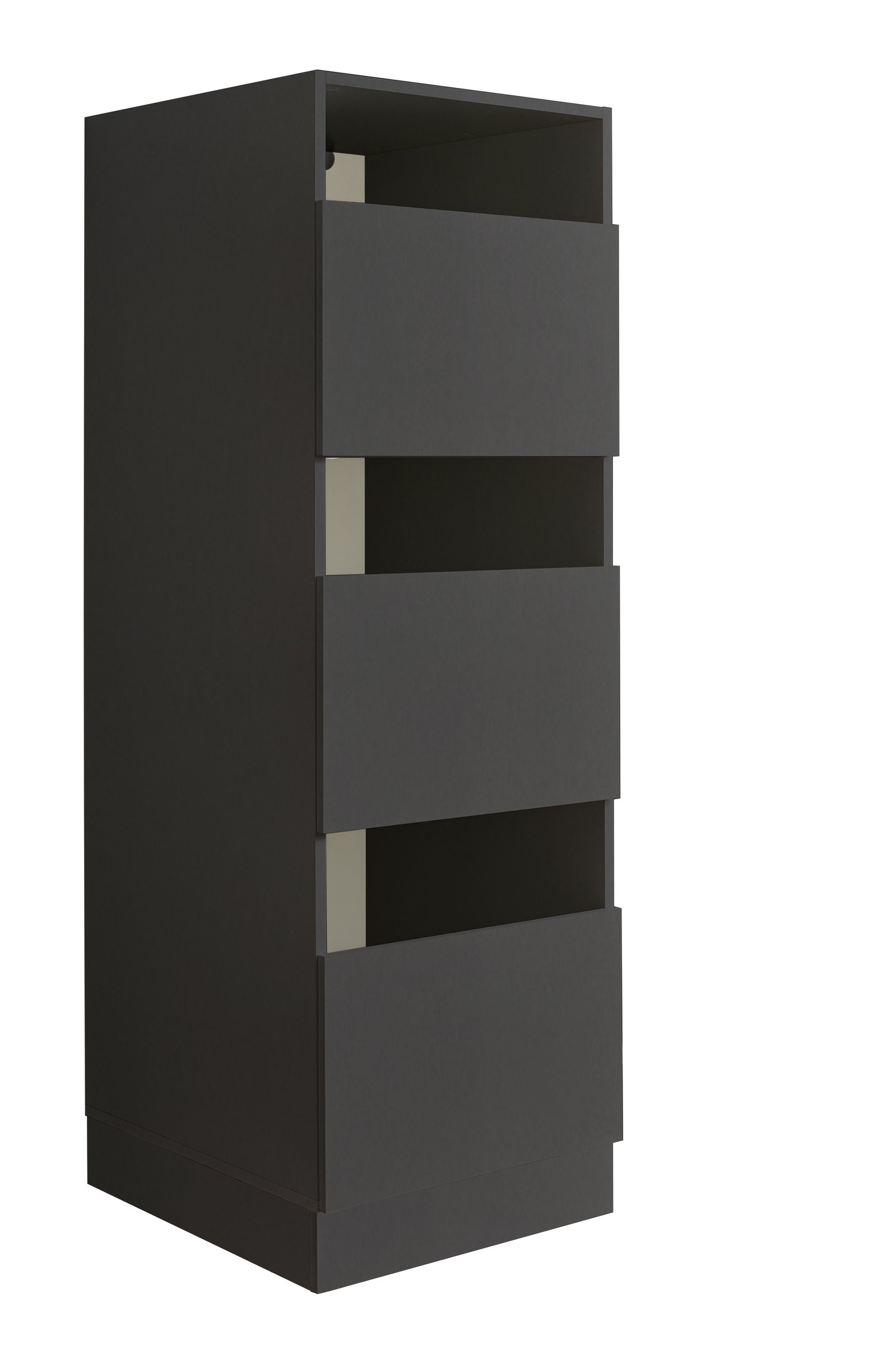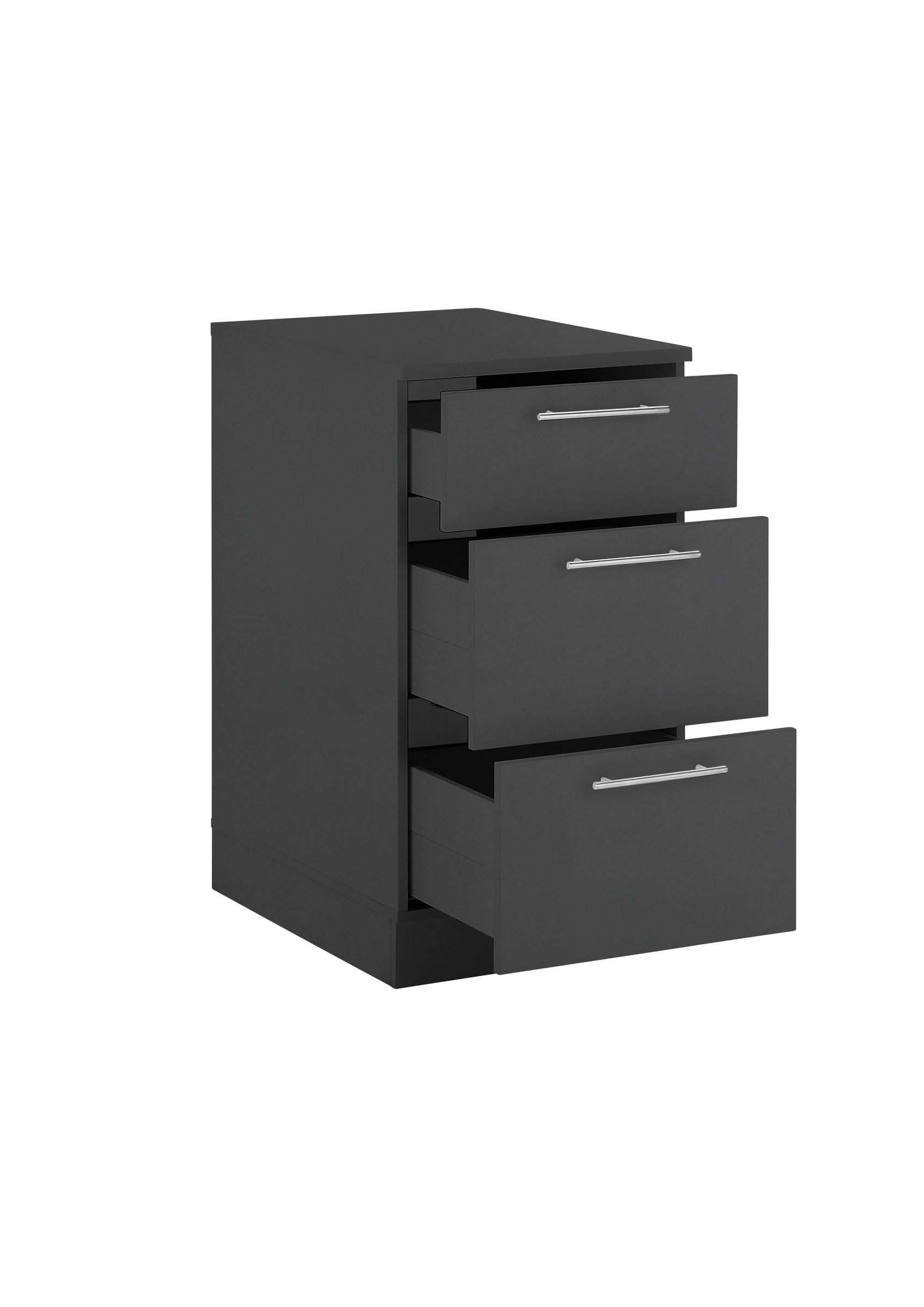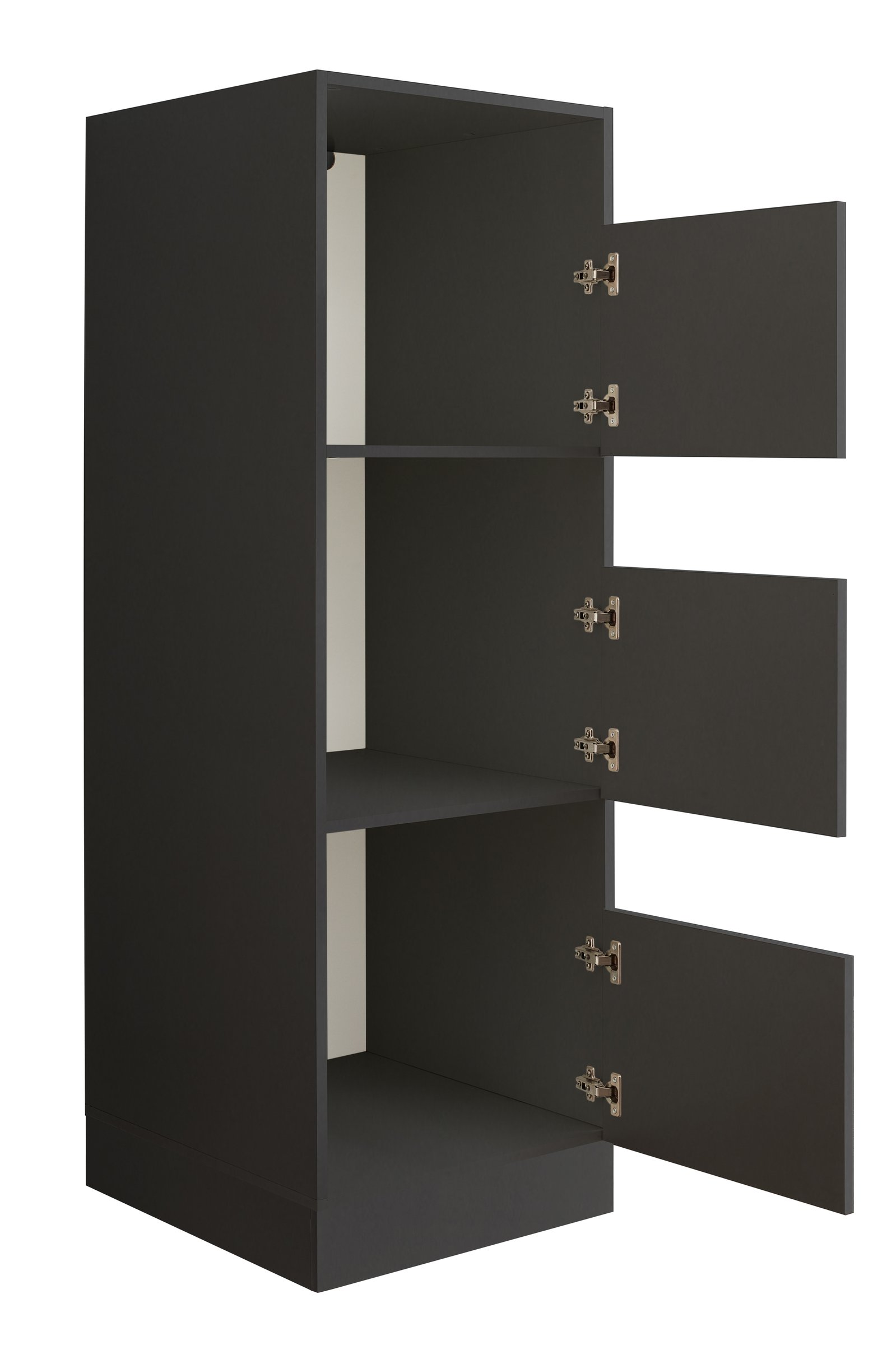 Die Front und der Korpus aus Holzwerkstoff sind mit einer matten Folienbeschichtung in Anthrazit versehen und damit ideal für moderne, geradlinige Küchen. Die silberfarbenen Stangengriffe aus Metall setzen einen dezenten Akzent und erleichtern das Öffnen der Türen. Die Grundfarbe Grau und die matte Oberflächenoptik sorgen dafür, dass sich der Schrank gut mit vielen Arbeitsplatten- und Frontfarben kombinieren lässt.