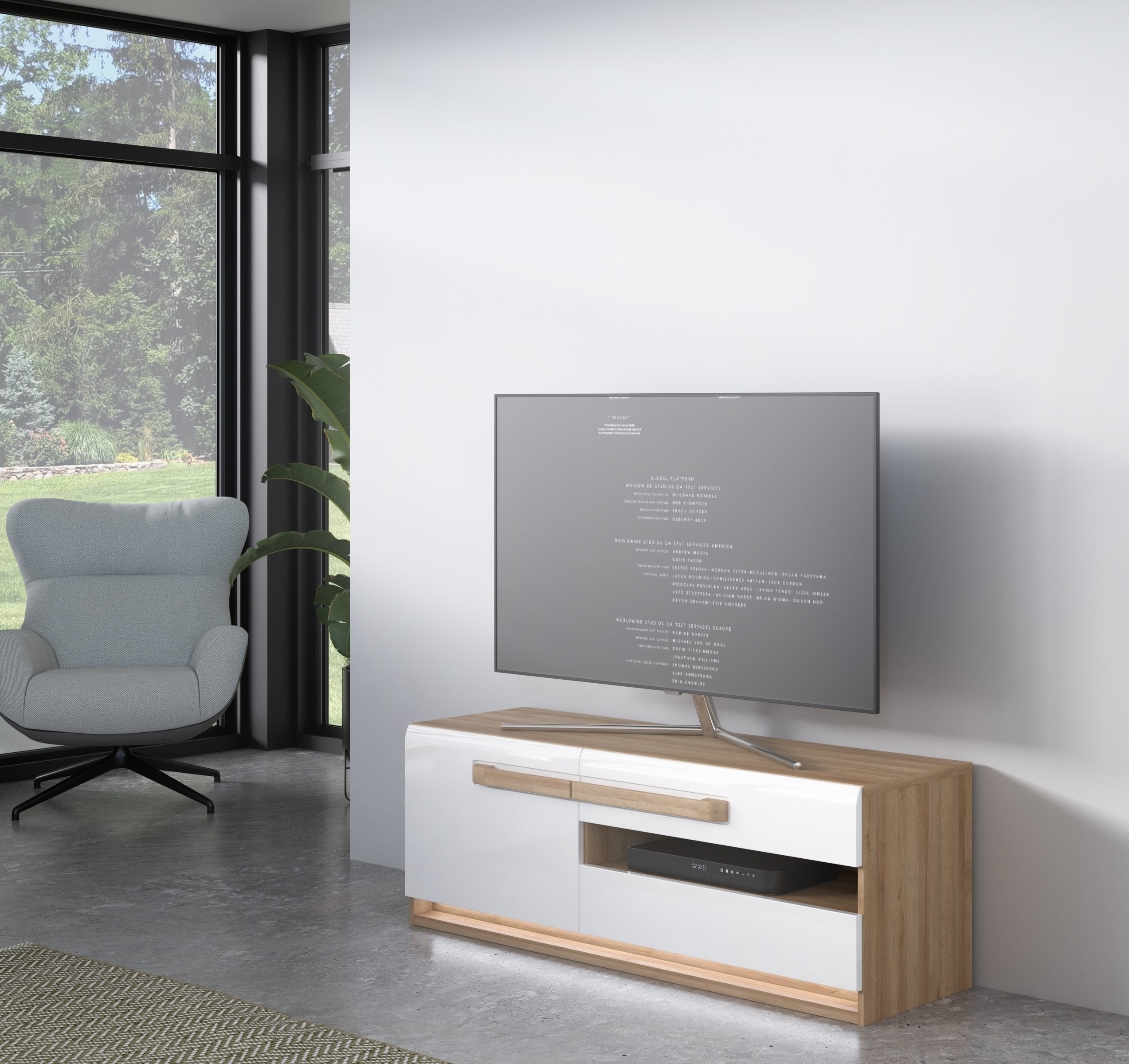 Das Lowboard ATTENTION ist eine moderne TV-Bank, die Design und Funktionalität im Wohnzimmer gekonnt vereint. Mit seinen Maßen von ca. 139,9 cm Breite, 50 cm Höhe und 41,5 cm Tiefe bietet es eine großzügige Stellfläche für Ihren Fernseher und fügt sich dank Riviera Eiche Dekor in Kombination mit Weiß Gloss harmonisch in zeitgemäße Wohnkonzepte ein. Die schwarzen Kunststofffüße und die 42,4 cm langen Griffe in Riviera Eiche Dekor unterstreichen den modernen Charakter.