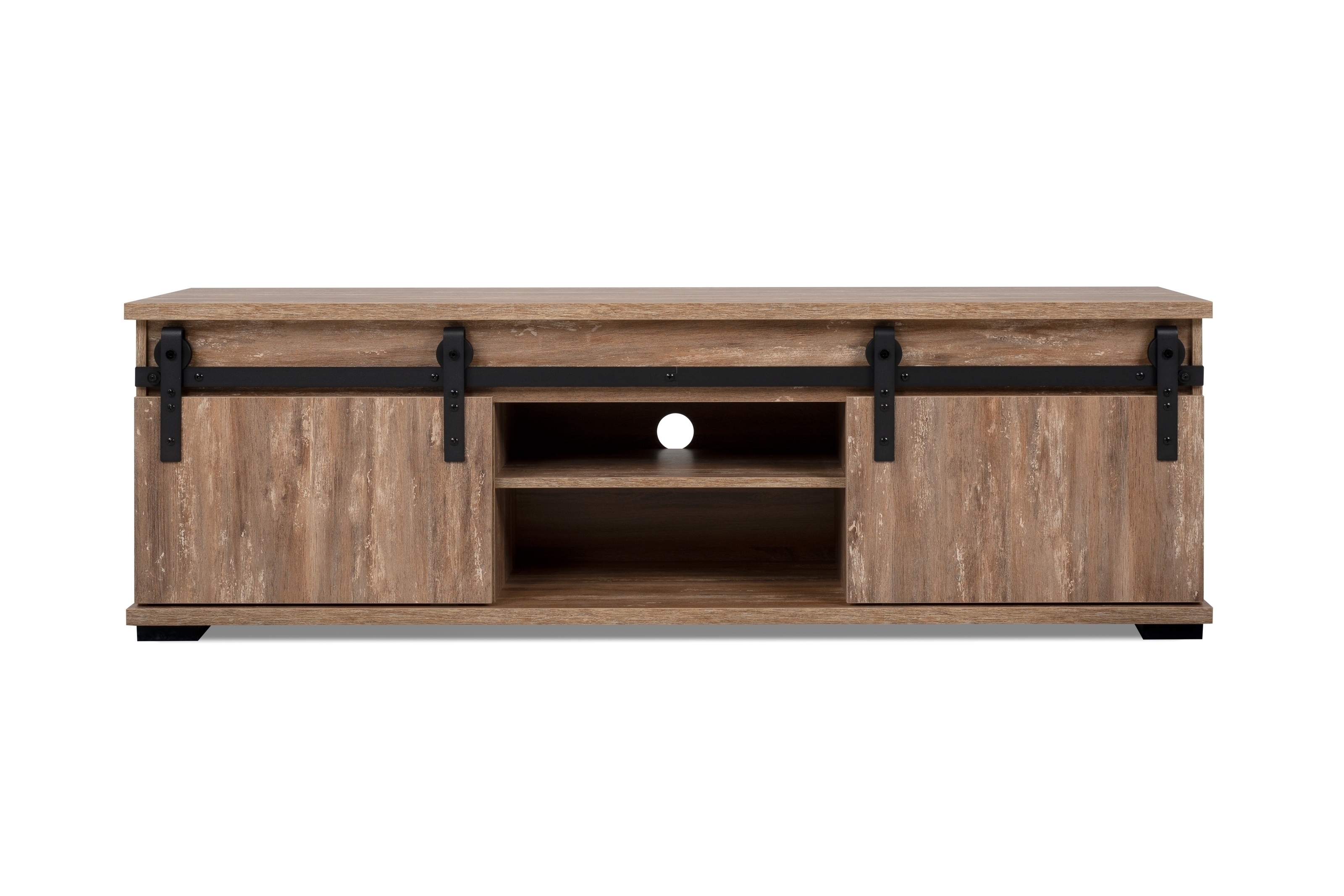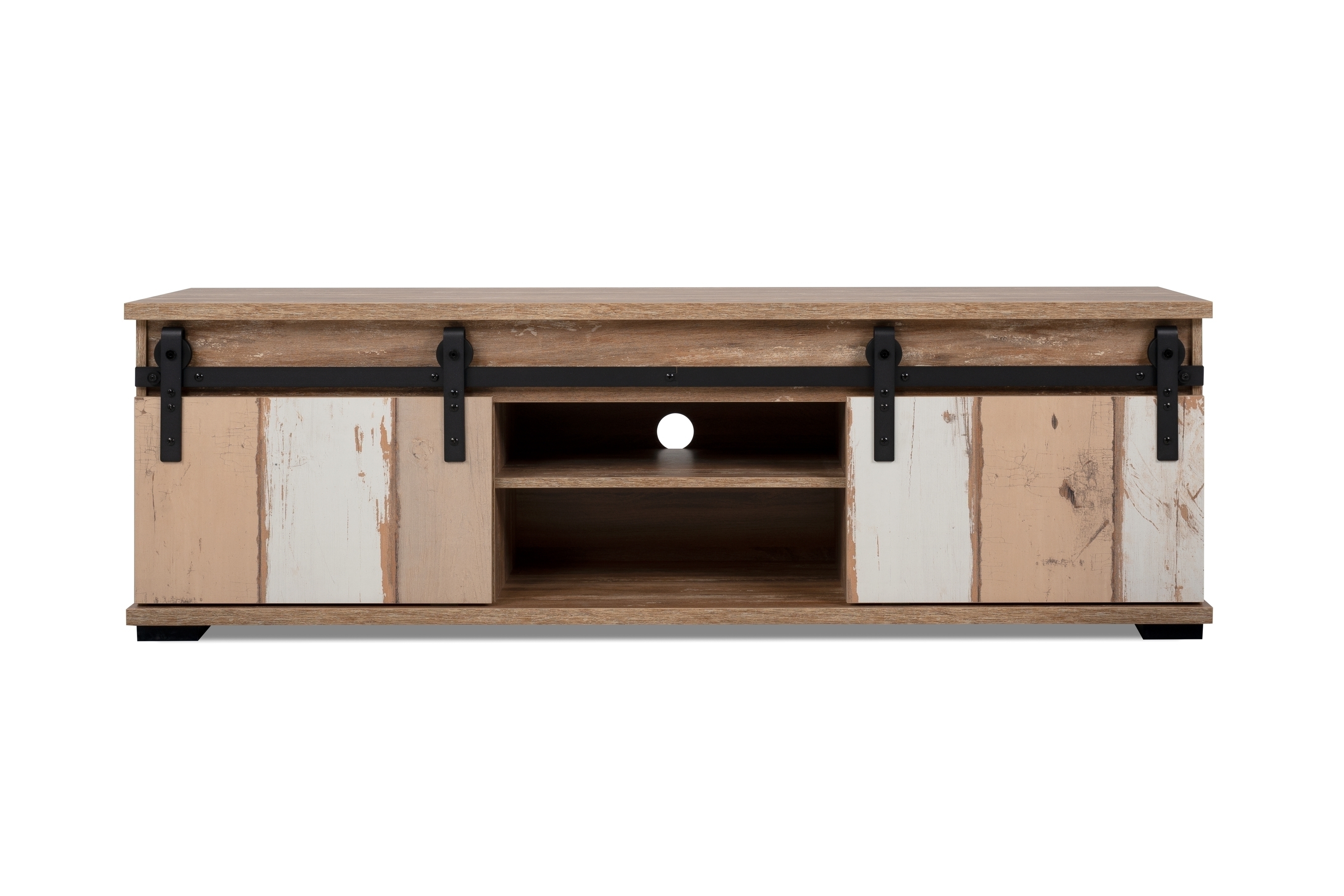 Zwei offene Fächer sind ideal für Set-Top-Boxen, Receiver oder Spielekonsolen und ermöglichen eine komfortable Bedienung. Ein integrierter Kabeldurchlass hilft dabei, Kabel geordnet nach hinten zu führen und aus dem Sichtfeld verschwinden zu lassen – für ein aufgeräumtes, strukturiertes Ambiente rund um Ihren TV-Bereich.