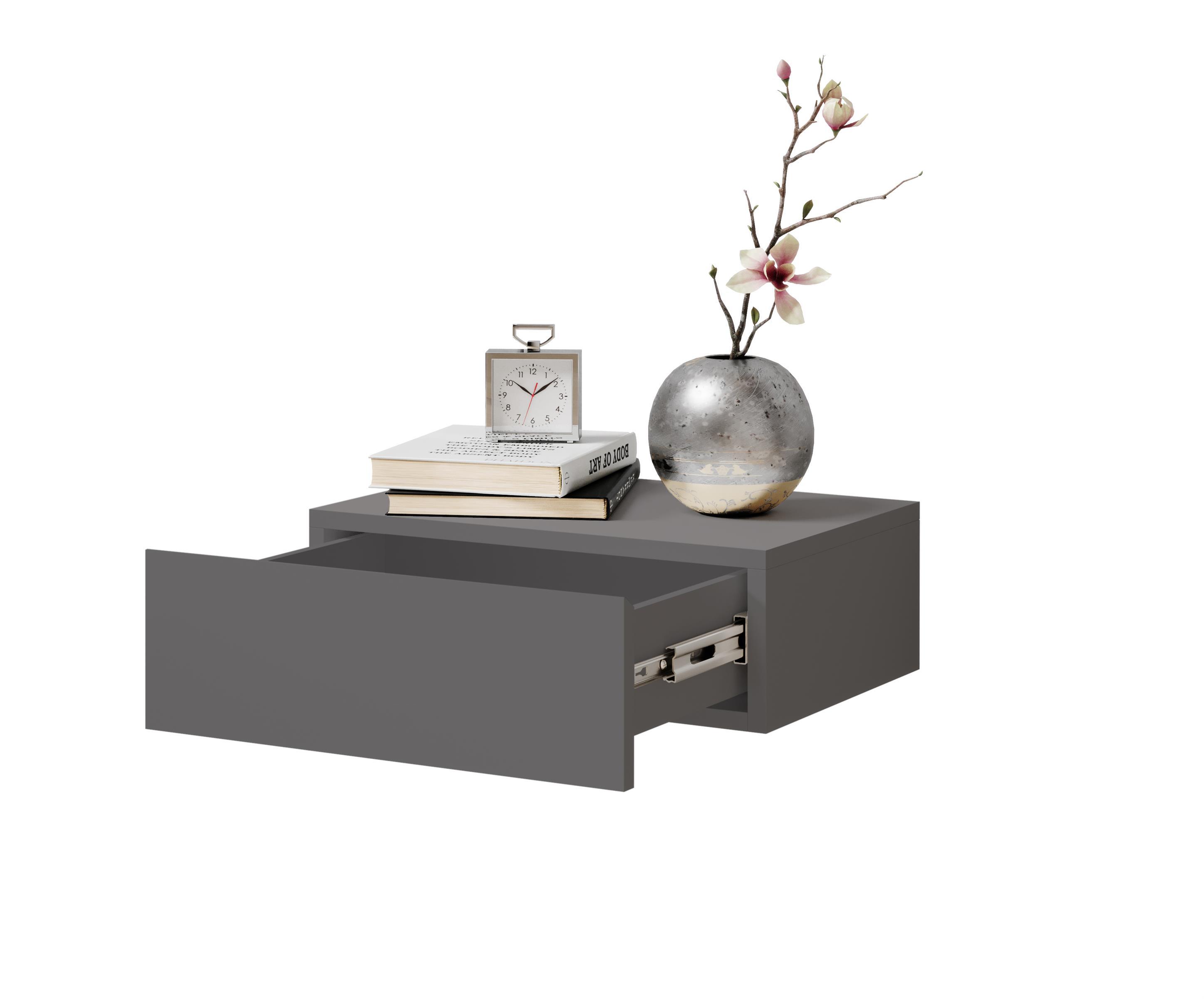 [Bullet-Point 3] => Die hängende Nachtkommode "Thorben I" ist hier in Graphit erhältlich und punktet optisch mit ihrer grifflosen Front. Das schlichte Design passt zur reduzierten Formensprache und unterstreicht den modernen Stil.