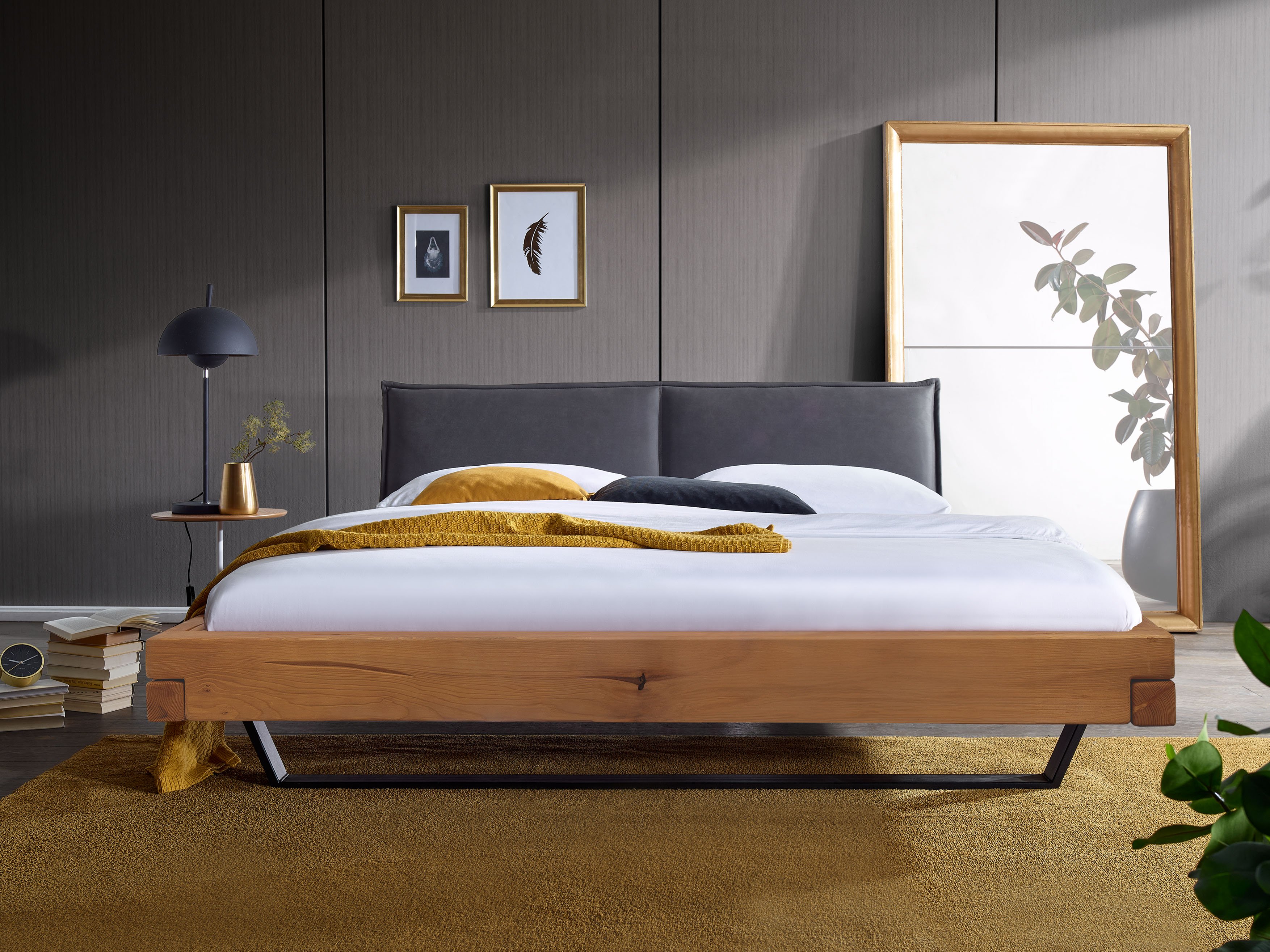 Dank der Kombination aus natürlicher Holzoptik, schwarzer pulverbeschichteter Metallkufe und stilvollem Polsterkopfteil entsteht ein moderner Look, der sich harmonisch in verschiedene Einrichtungsstile einfügt und Ihrem Schlafzimmer eine gemütliche, zugleich zeitgemäße Note verleiht.