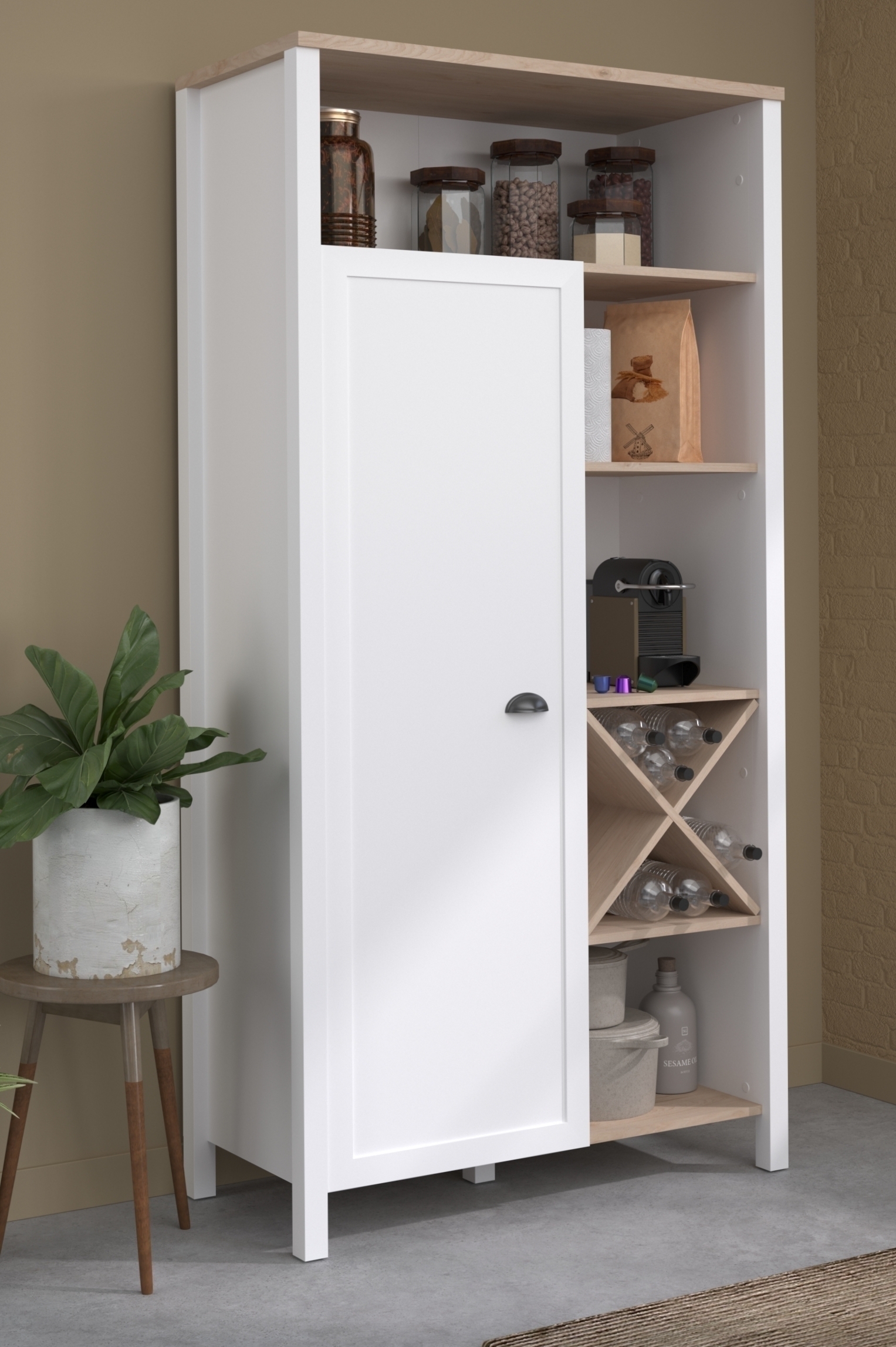 Die Front in Weiß / Eiche Dekor bringt Helligkeit und Wärme in den Raum und lässt sich leicht mit bestehendem Mobiliar kombinieren. Offene Fächer setzen Geschirr, Gläser oder Dekoration attraktiv in Szene, während die Tür für geschützten, geschlossenen Stauraum sorgt. Insgesamt neun Fächer bieten vielfältige Ablagemöglichkeiten – vom Alltagsgeschirr bis zur stilvollen Deko.