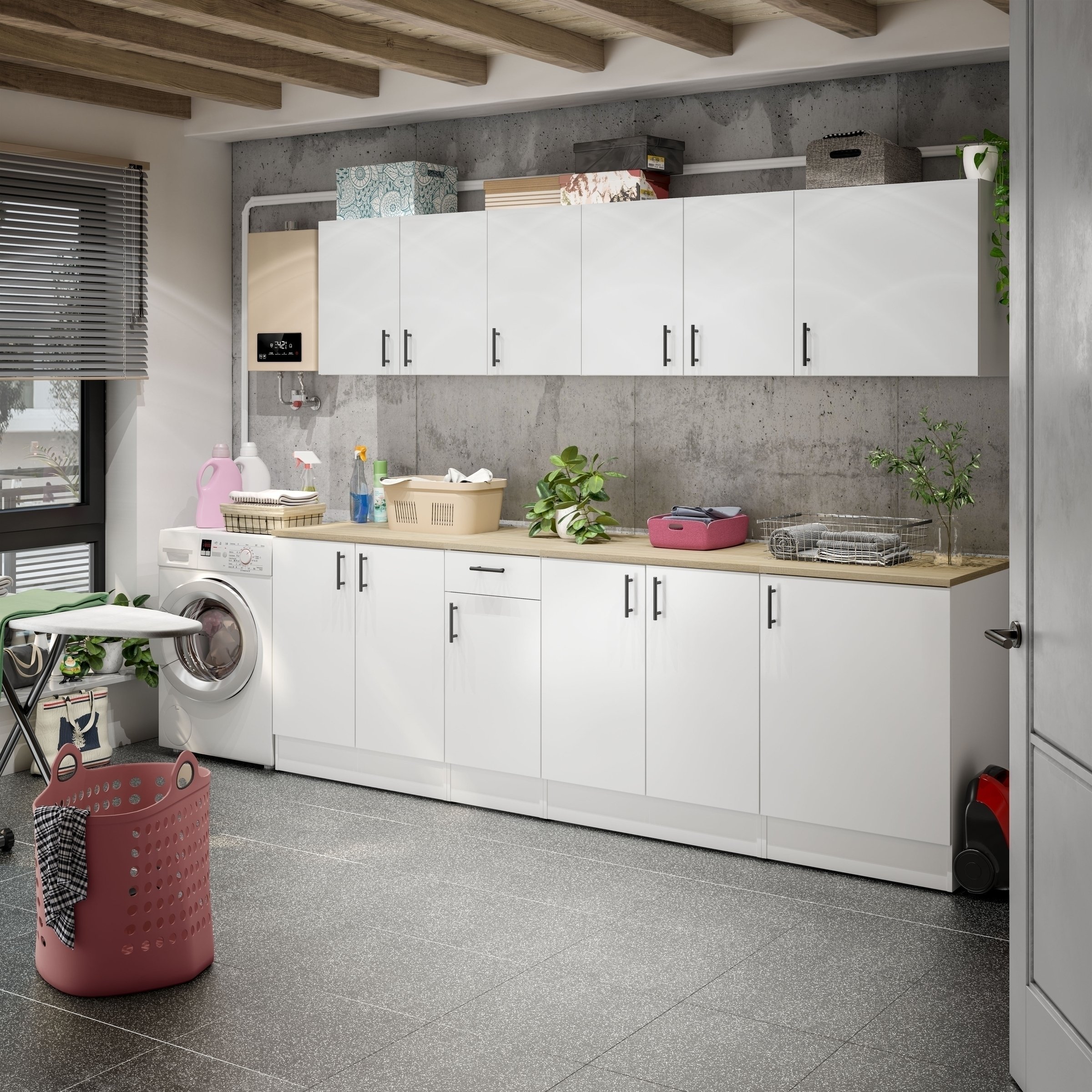 [Bullet-Point 3] => Robuste Materialien: Gefertigt aus melaminbeschichtetem Holzwerkstoff, langlebig und pflegeleicht – ideal für den täglichen Einsatz im Hauswirtschaftsraum.