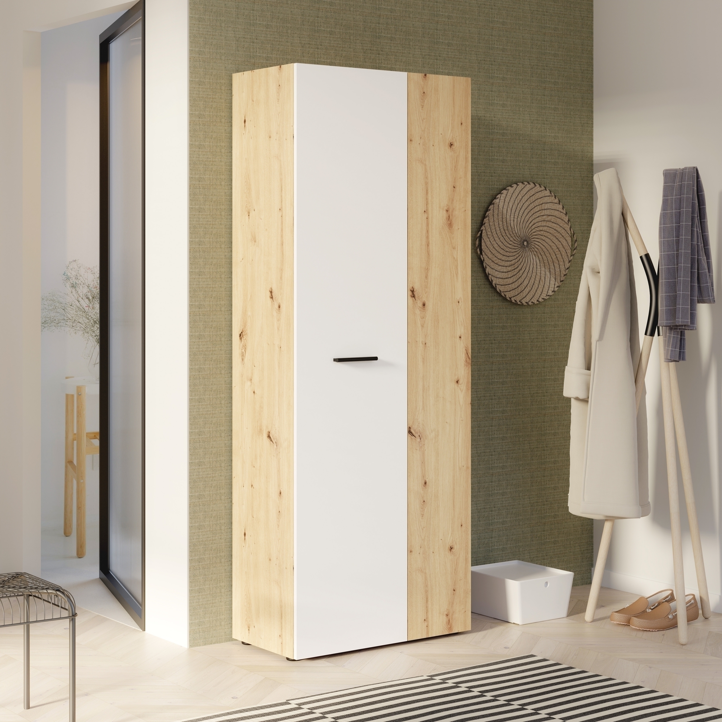 [BulletPoints] => Platzsparend & geräumig – Der Schuhschrank NET306 (B/H/T: 68,7x181,1x36,5 cm) bietet Stauraum für ca. 18 Paar Schuhe und passt perfekt in Flur oder Diele.;Modernes Design – Die stilvolle Kombination aus Weiß & Artisan Eiche mit Griffen in Aluminiumeffekt fügt sich harmonisch in jedes Wohnambiente ein.;Viel Stauraum – 2 Türen & 5 Einlegeböden aus robuster Spanplatte (15 mm) sorgen für eine durchdachte Aufteilung und eine maximale Belastbarkeit von 15 kg pro Boden.;Stabile Verarbeitung – Der Schuhschrank NET306 überzeugt mit pflegeleichter Folienbeschichtung, schwarzen Kunststofffüßen und einer lackierten HDF-Rückwand.;Einfache Montage – Der Schuhschrank wird zerlegt geliefert und lässt sich mit der beiliegenden Montageanleitung schnell und unkompliziert aufbauen.