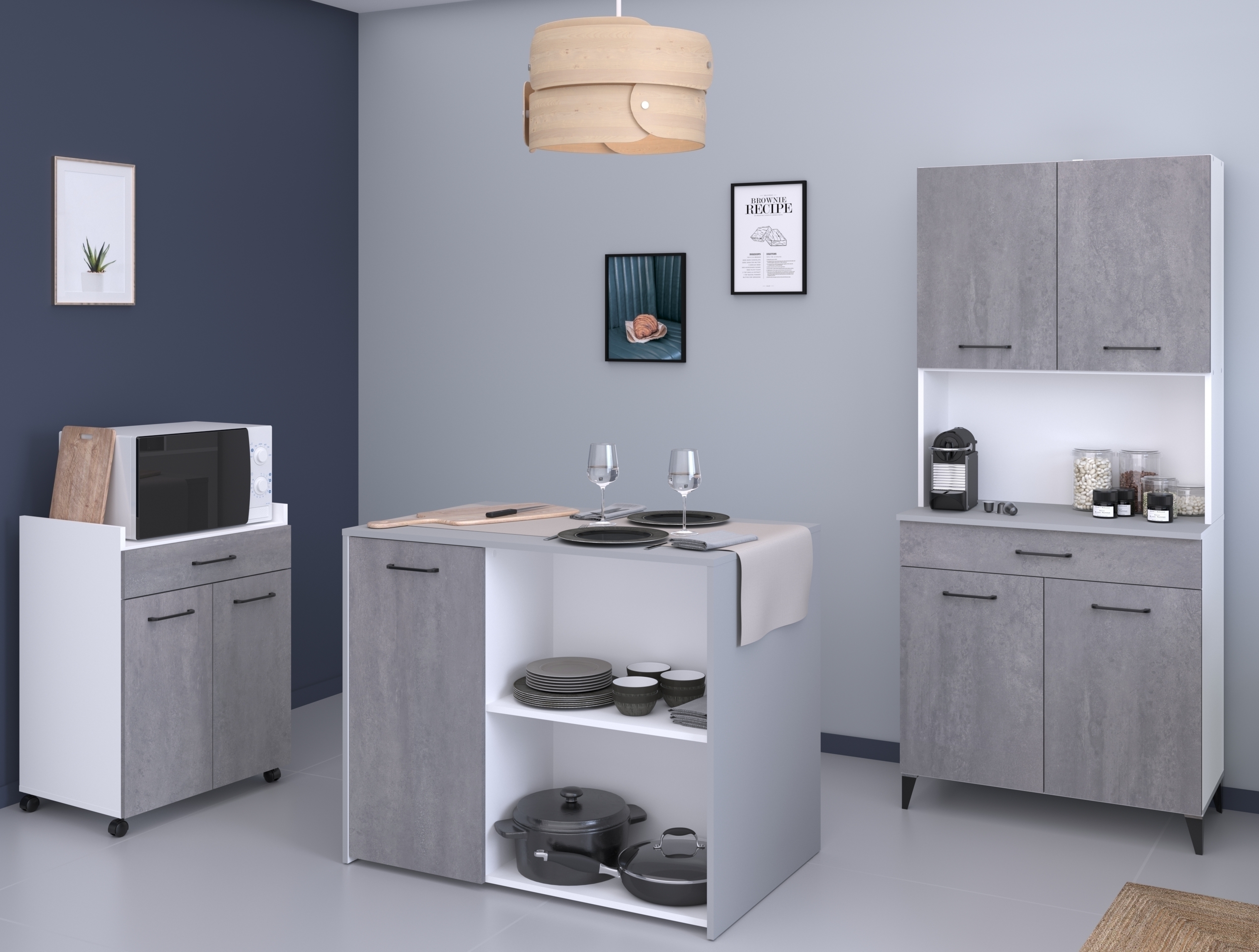 Mit seiner Beton Optik hell und der weißen Farbkombination fügt sich das Set harmonisch in zeitgemäße Wohnkonzepte ein und sorgt für eine elegante, urbane Atmosphäre. Buffet, Insel und Rollschrank bieten mit Türen, Fächern, Schubkästen und einem offenen Fach zahlreiche Ablagemöglichkeiten und machen das Set zu einem praktischen Alltagsbegleiter.