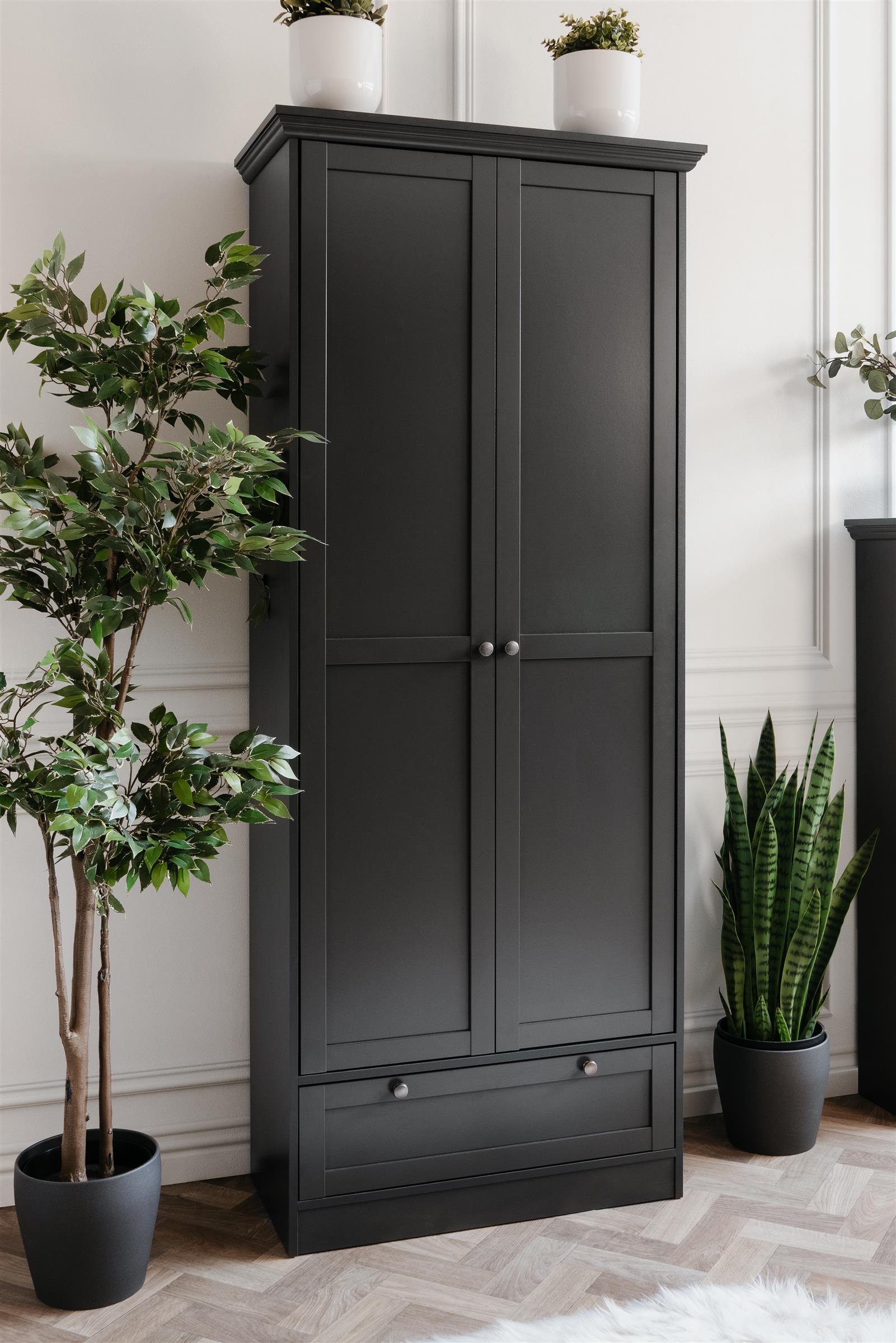Dank der Kombination aus Spanplatte und MDF ist der Schrank nicht nur robust, sondern auch leicht zu handhaben. Die stoß- und kratzfesten Oberflächen in elegantem Anthrazit verleihen jedem Raum eine moderne Note mit einem Hauch Landhaus-Charme. Perfekt für alle, die Ordnung und Stil verbinden möchten.